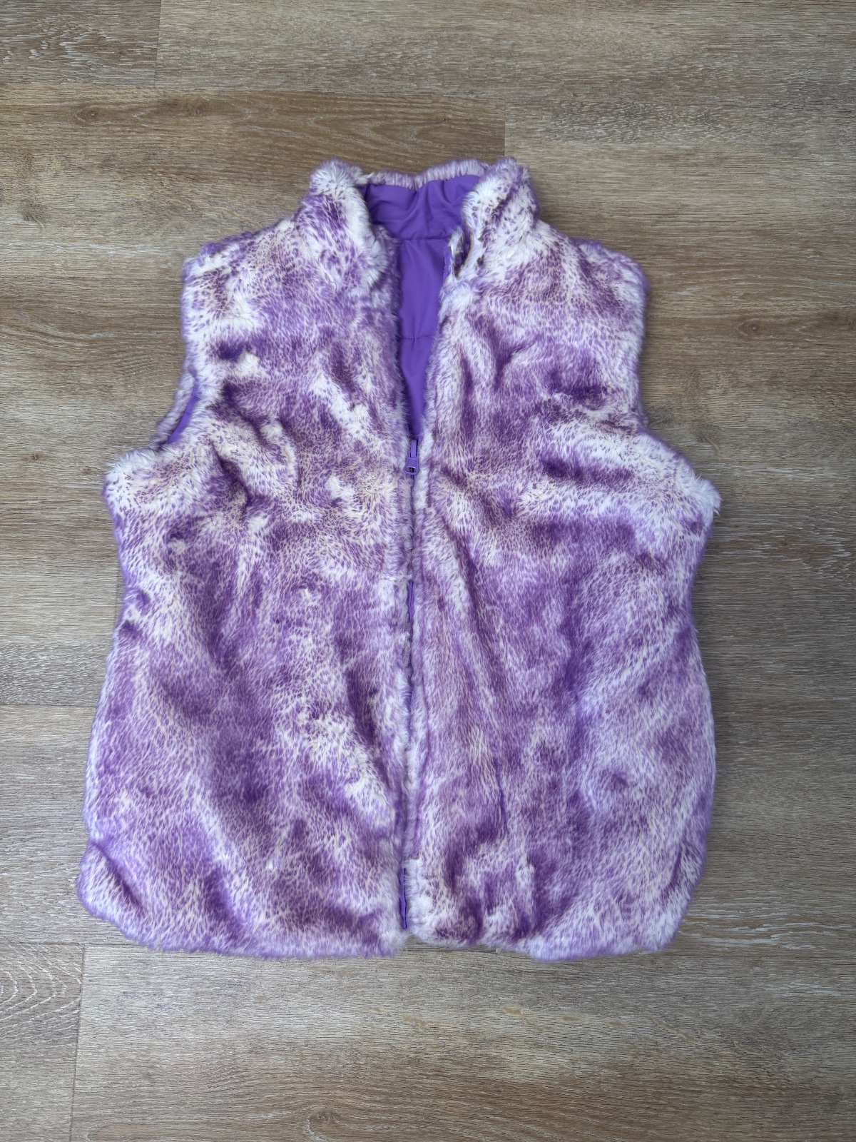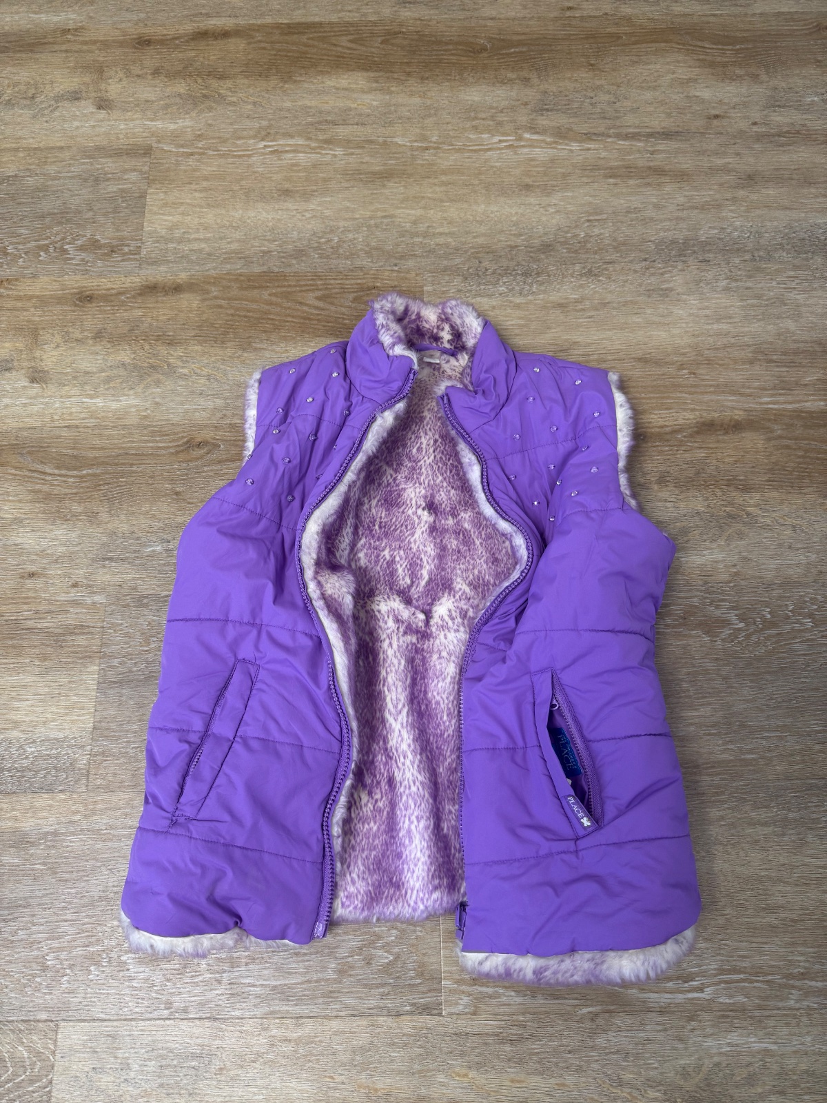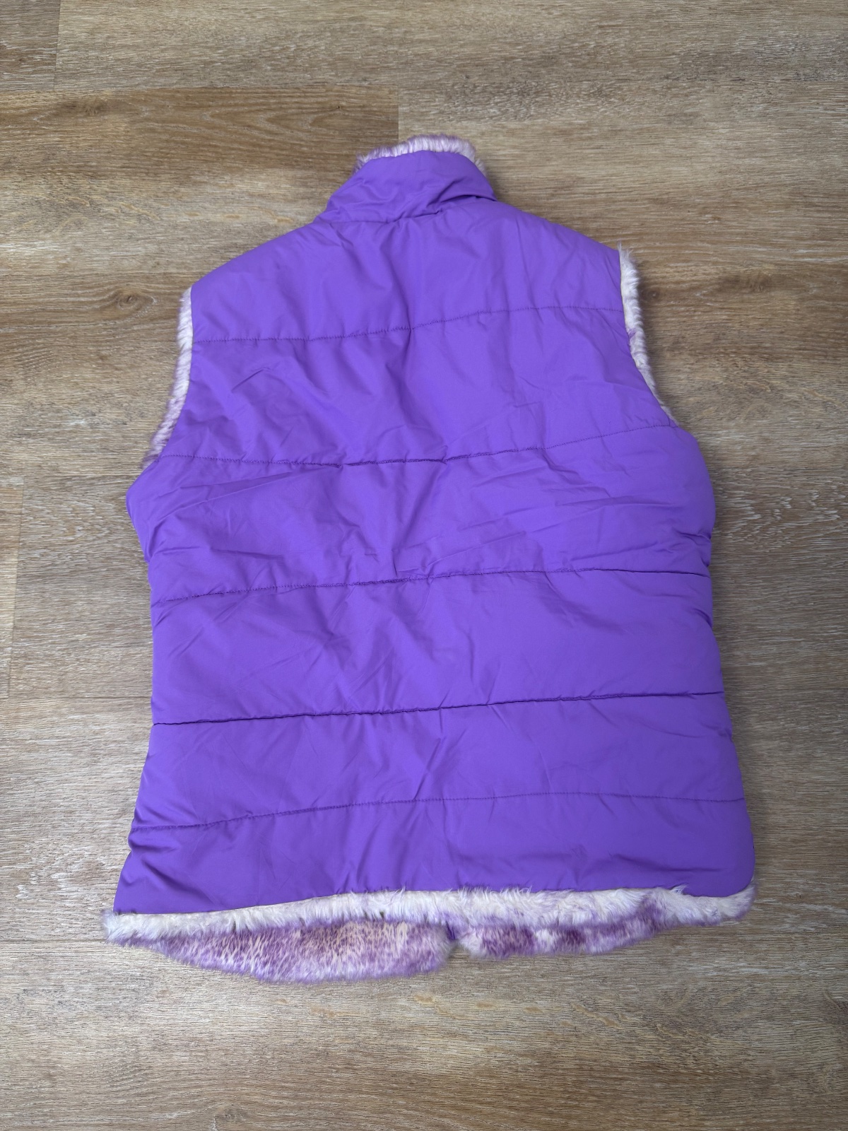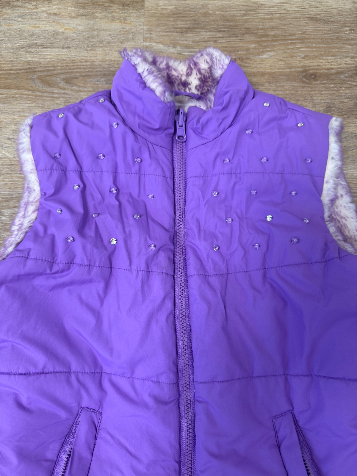 Ponúkam peknú fialovú dievčenskú vestu na zips, ktorá sa dá nosiť obojstranne. Jedna strana fialová hore s flitríkmi a z druhej strany huňatá. Veľkosť uvedená L na 10-12 rokov, ale prikladám aj rozmery. Bola nosená málinko, naďalej je vo veľmi peknom stave. Značka The Children’s Place. Poštovné podľa taríf.