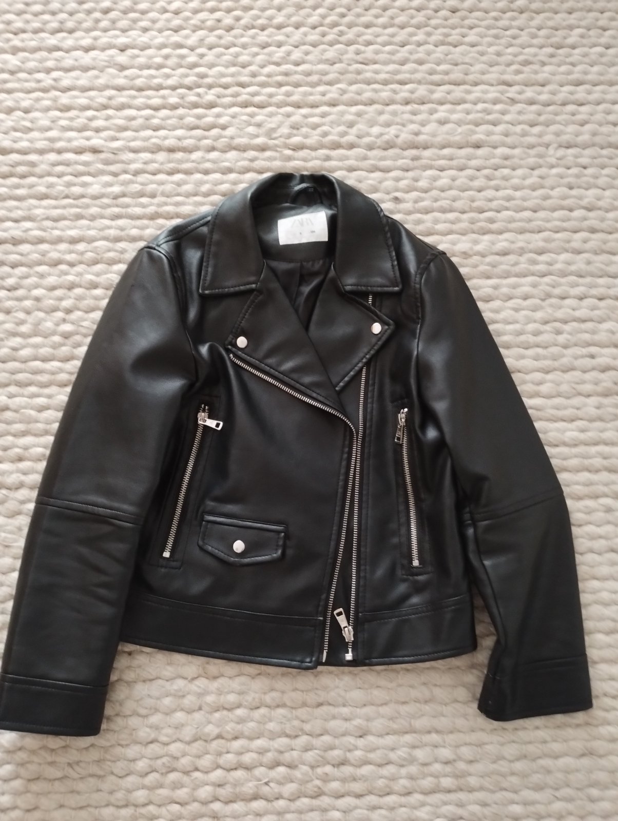Moderná koženná bunda čiernej farby značky Zara vo veľkosti 134. Bunda má dvojkombináciu zapínania. Zips je možné zapnúť ako sako i ako bundu. Viď obrázok. Na rukávoch má zipsy. Na ramenách záklopk...