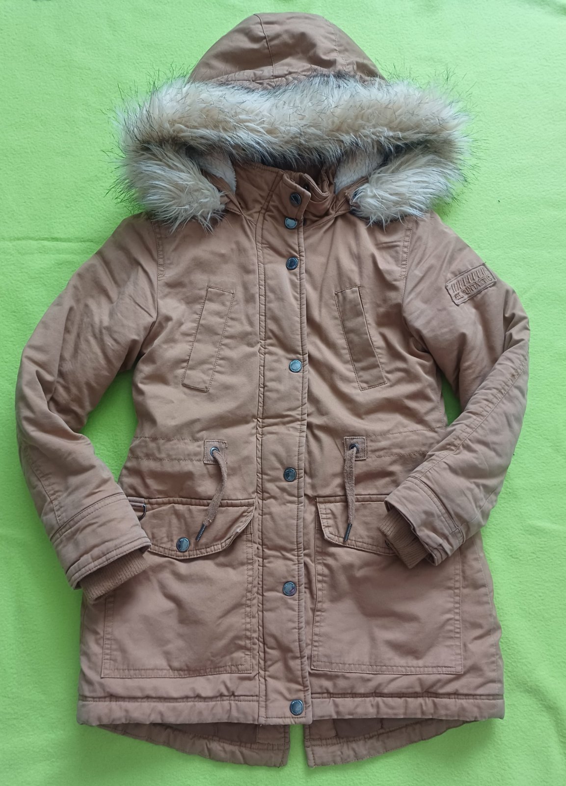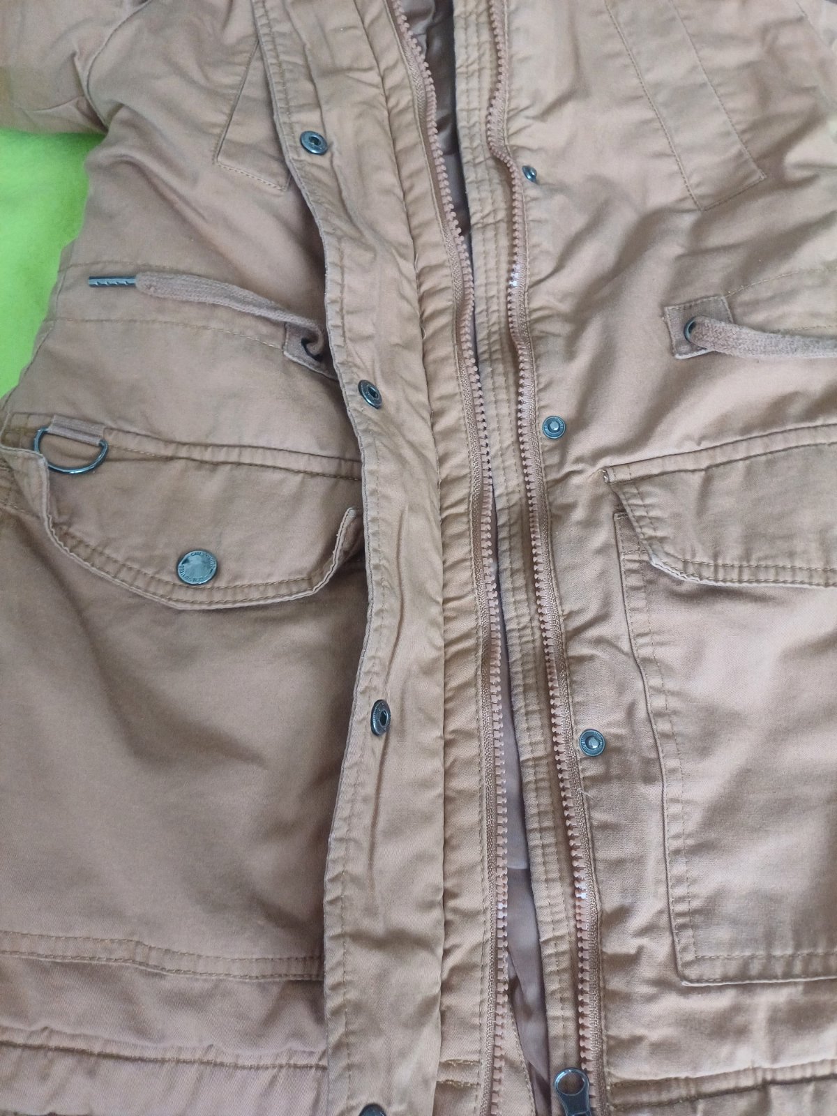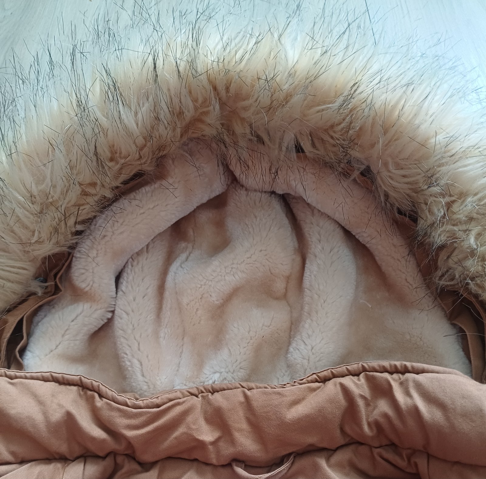 Bunda je škoricovej farby so zapísaním na zips a cvoky. Má odnímateľnú kapucňu aj odnímateľnú kožušinku na kapucni. V páse sa nachádza šnúrka, ktorú môžete stiahnuť. Rukávy sú ukončené patentom.
