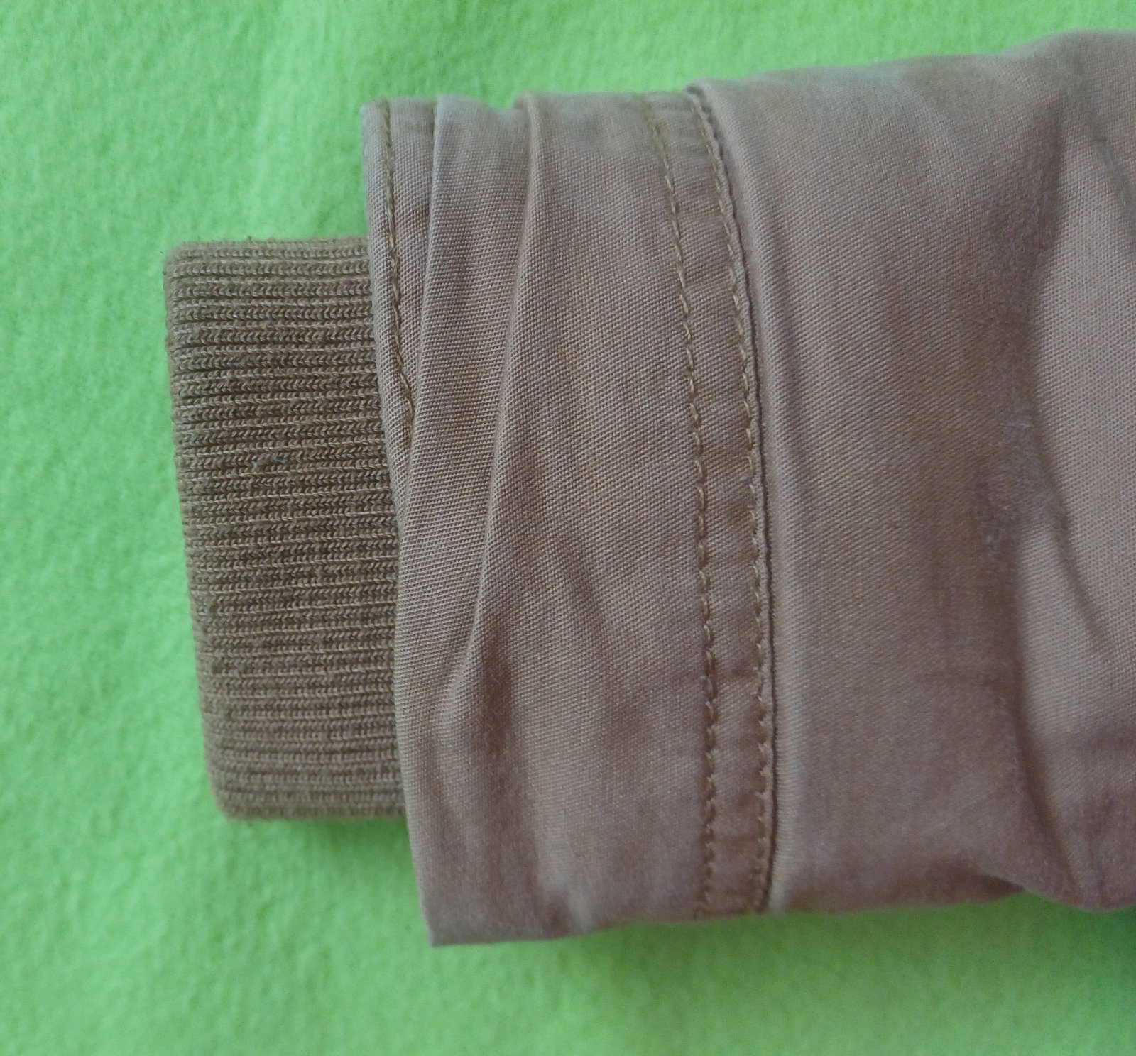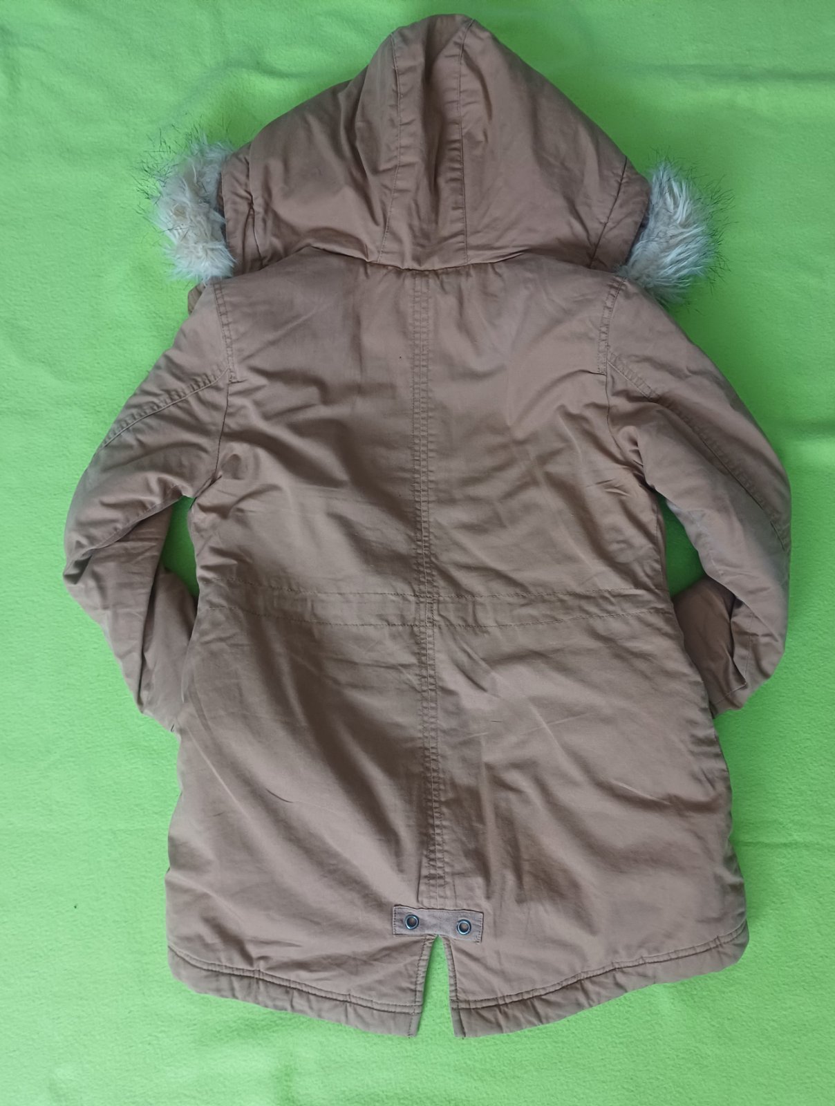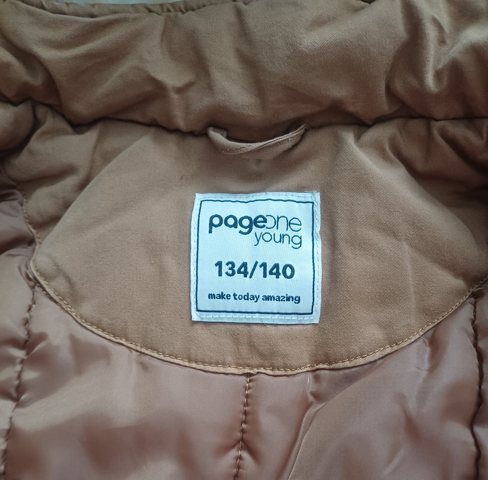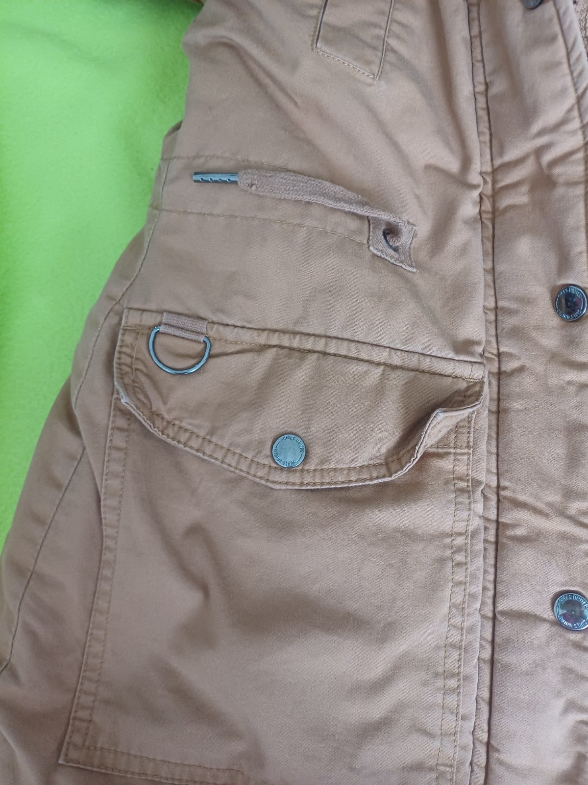 Bunda je škoricovej farby so zapísaním na zips a cvoky. Má odnímateľnú kapucňu aj odnímateľnú kožušinku na kapucni. V páse sa nachádza šnúrka, ktorú môžete stiahnuť. Rukávy sú ukončené patentom.