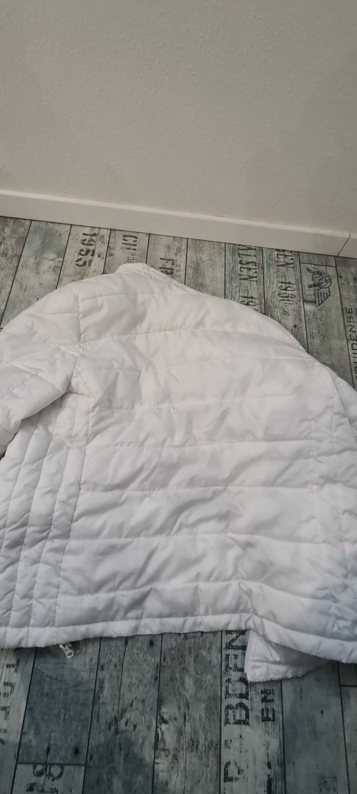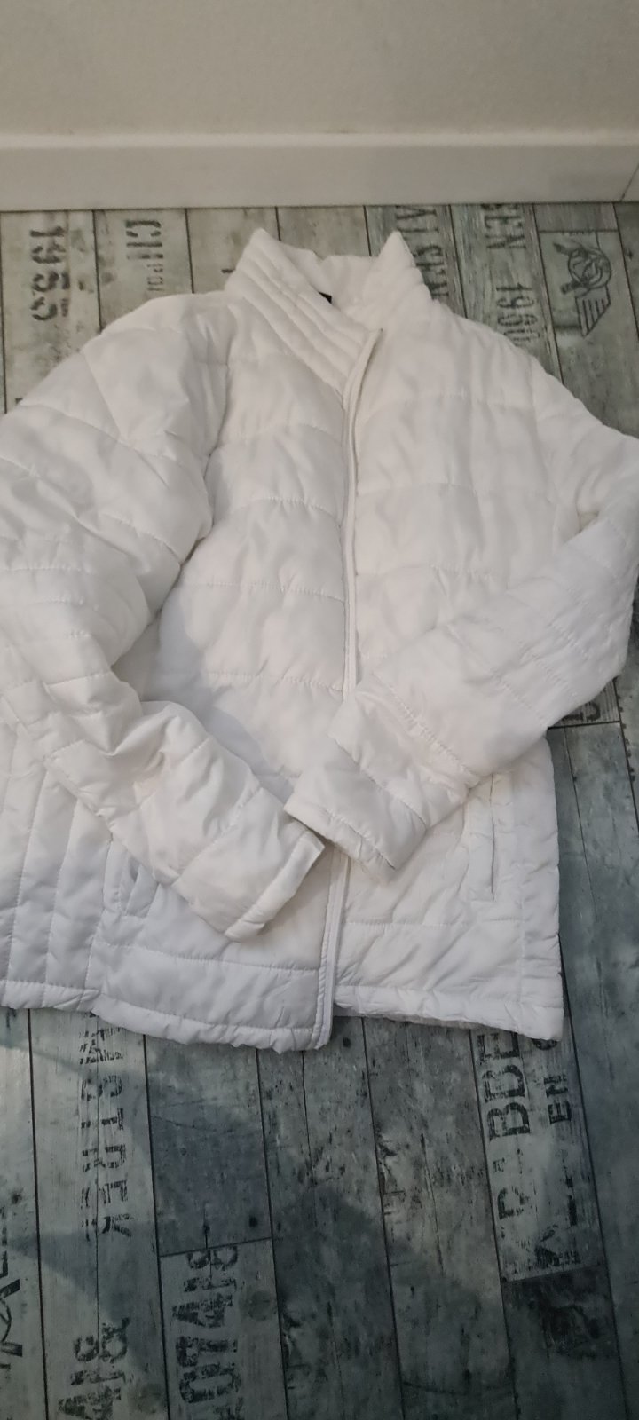 Lahka biela bundicka na zips, ako nova, az na malicku chybicku krasy, dole na patente je maly cierny flak, neviem z coho moze byt, vid.foto 3€+ posta