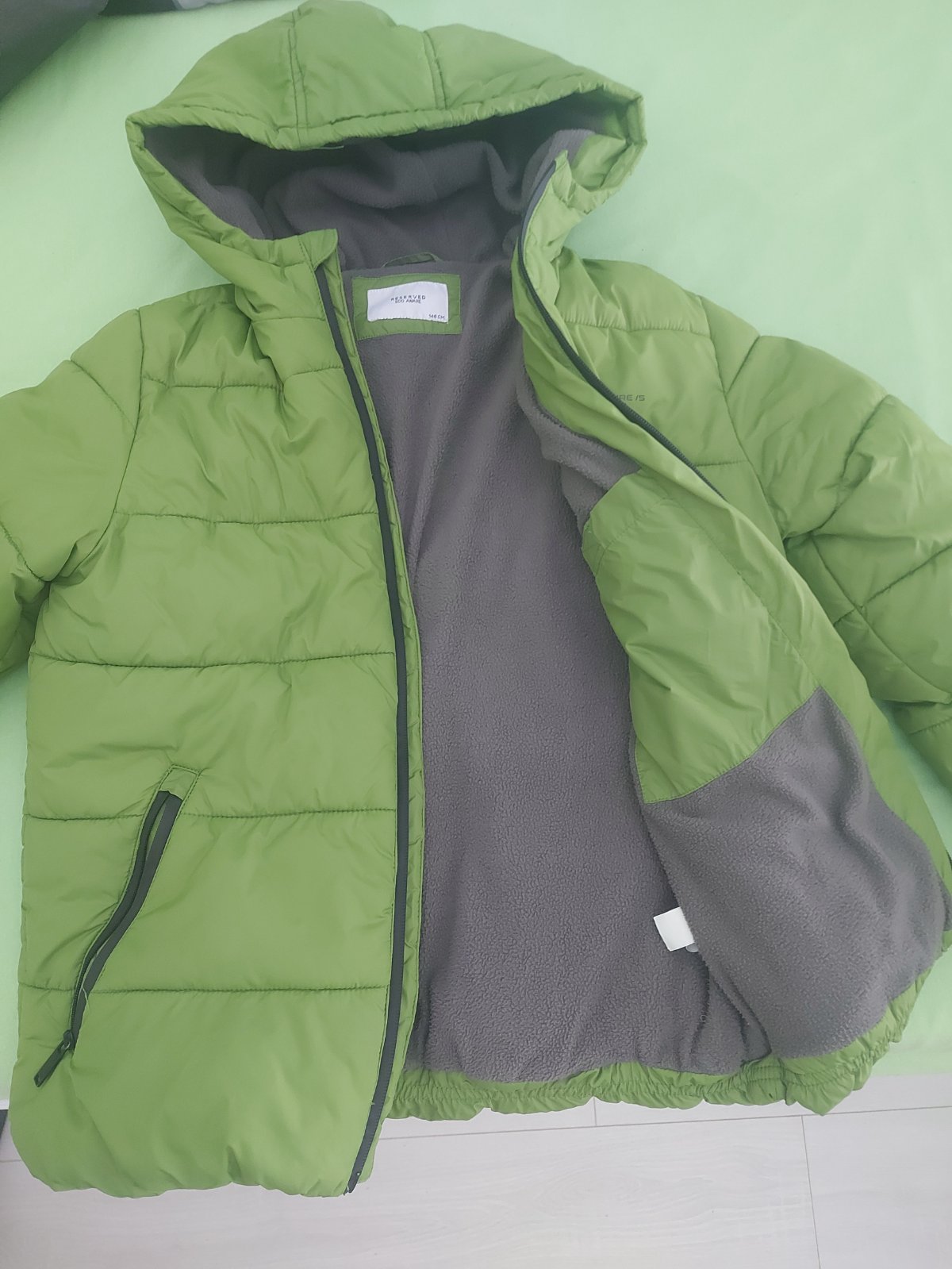 Posúvame bundu po synovi, mierne vatovaná, ideálna na jeseň. Reserved, veľ.146, ale subjektívne menšia. A skôr na štíhlejšie dieťa. Rozmery na foto. Všetky zipsy funkčné. Na pár miestach sa akoby p...