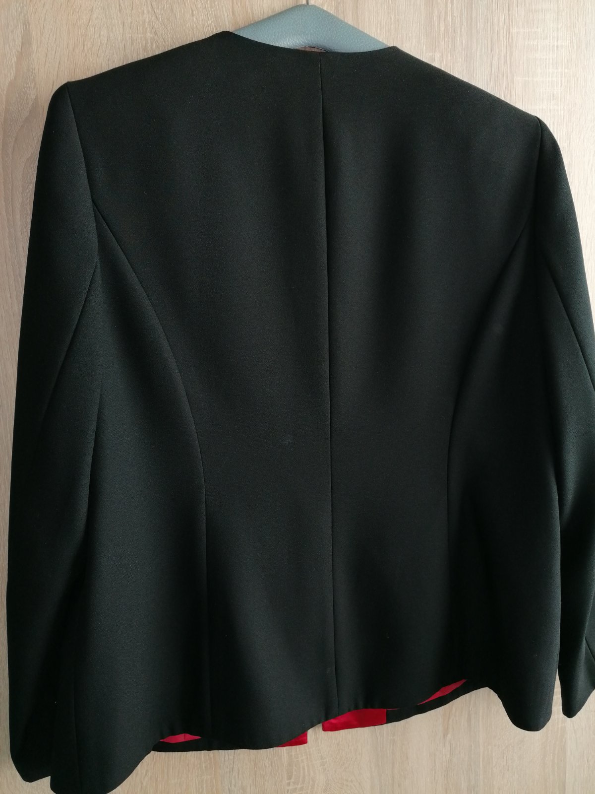 Ponúkam čierne úpletove krátke sako, zapinanie na jeden gombík. Bežove olemovanie na vreckách, rukávoch a okolo goliera. Veľkosť píše XL. Je to 40. Sako je málo nosené bez známok používania.