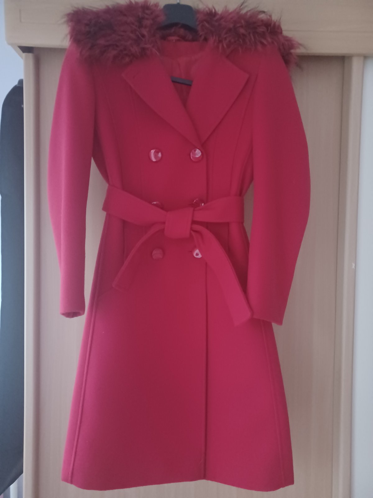 Ponúkam na predaj veľmi pekný zimný, flaušový kabát s prímesou vlny. Klasický, dokonale strihaný model, ktorý bol šitý na mieru. Veľkosť 38.Je zateplený, futrovaný. Golier je vypnutý, ozdobený s umelou kožušinou v tmavo červenej farbe, ale dá sa nosiť ako fazónkový aj bez kožušteka. Zapína sa dvojradovo na gombíky. Na bokoch sú zásuvné vrecká, podĺž kabáta je elegantné štepovanie. Dĺžka je po kolená. Kabát je na viazanie v páse, prípadne bez neho. V prípade vážneho záujemcu a rýchlej kúpe darujemn ku kabátu aj dlhší červeny kožušinový golier.