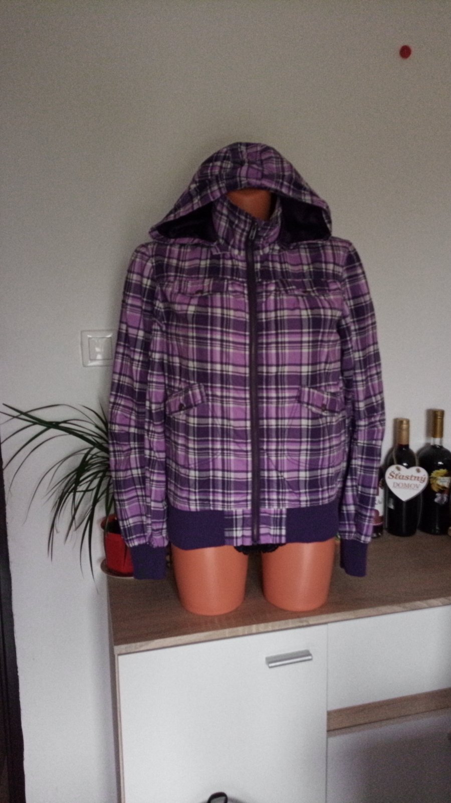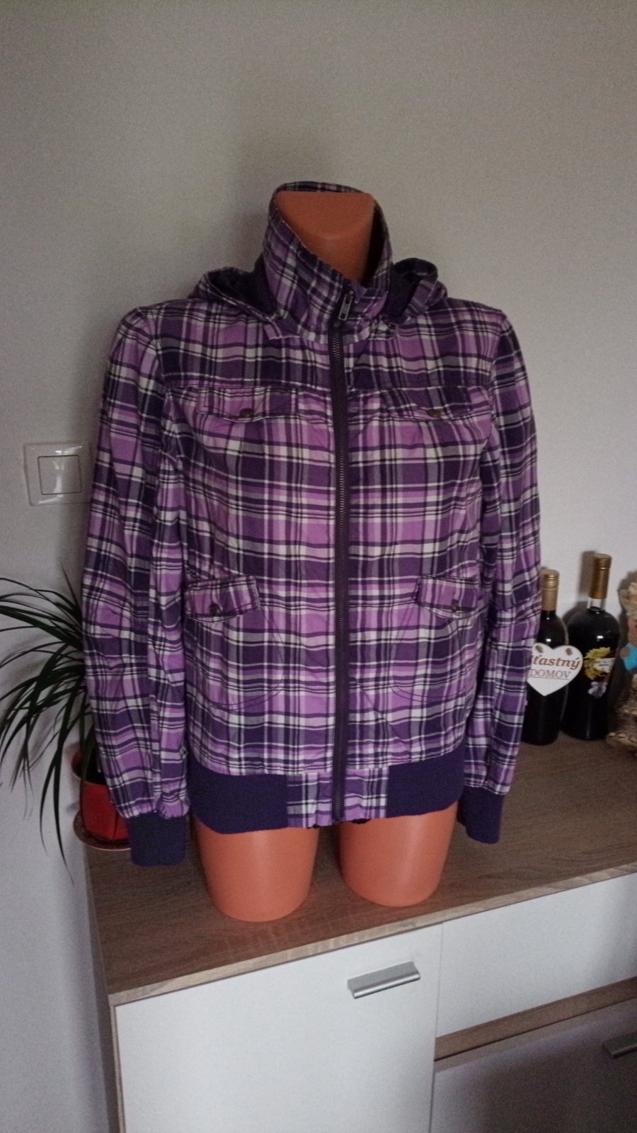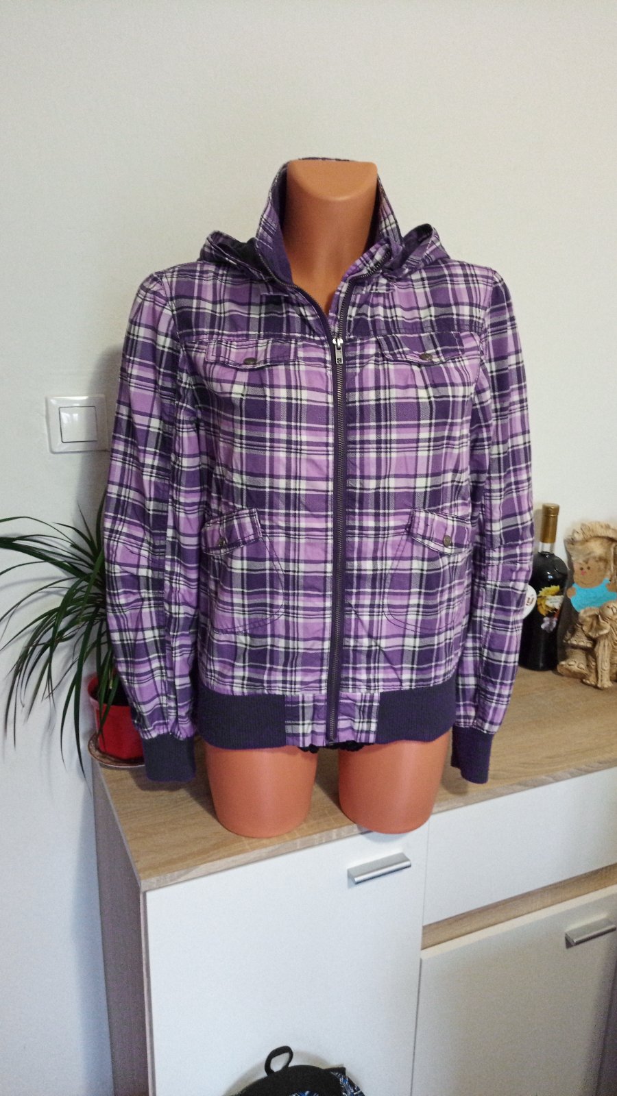 Veľmi pekný stav. Kapucňa sa dá odopnúť.Veľkosť udáva 170/176, sadne M. Rozmery na poslednej fotke.