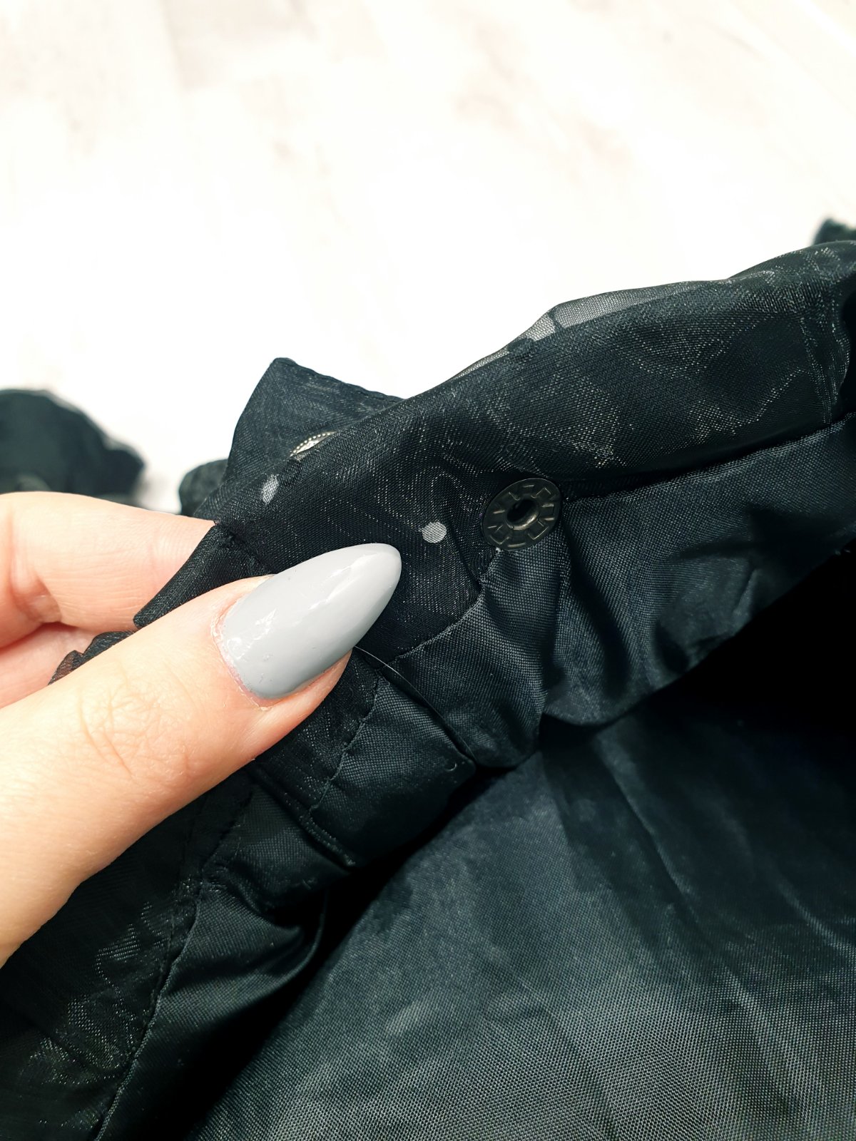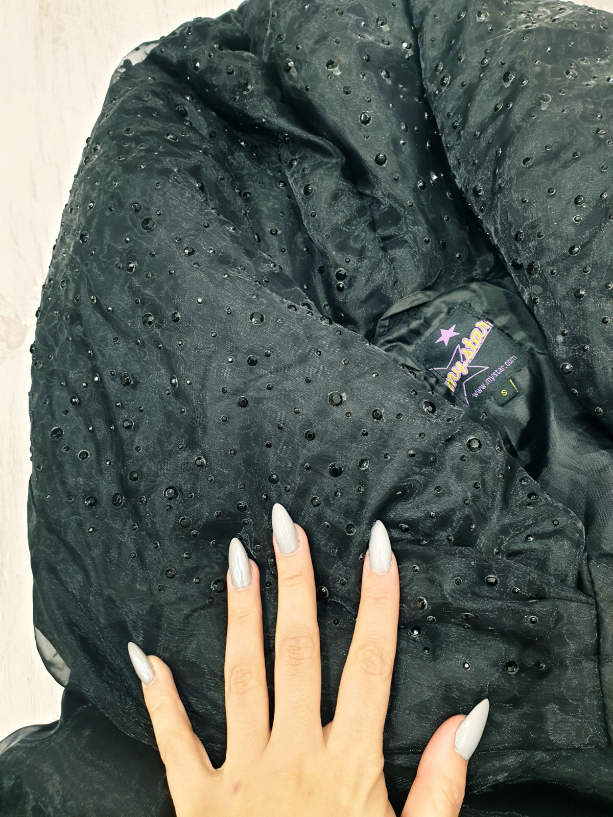 Na golieri/kapucni kamienky, mierne stopy od lepidla, tak už od novoty.