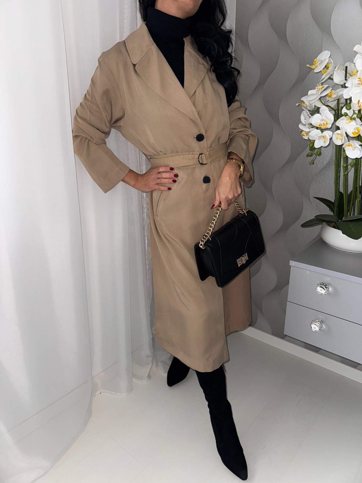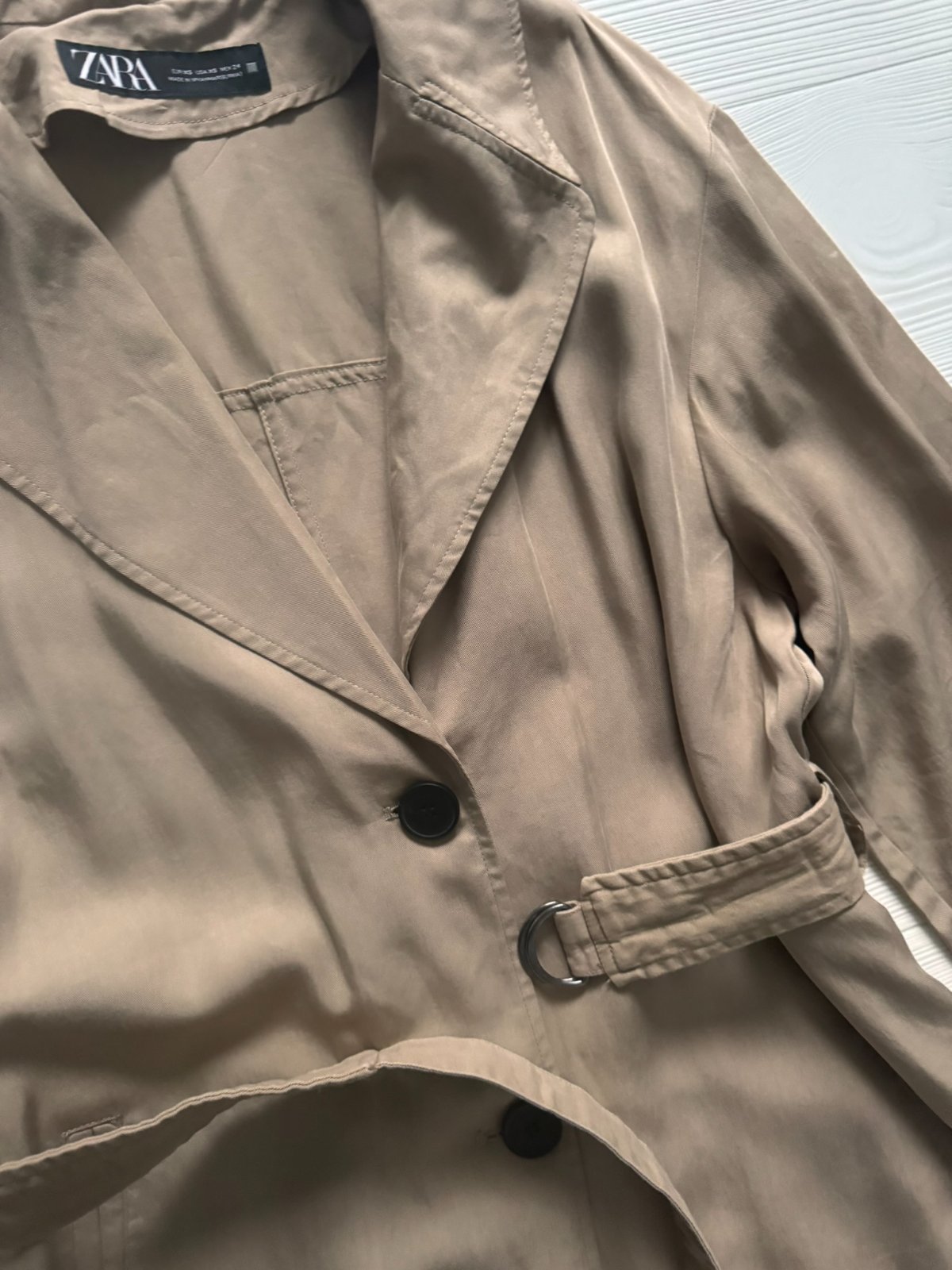 Dlhý béžový trenčkot s opaskom od značky Zara.