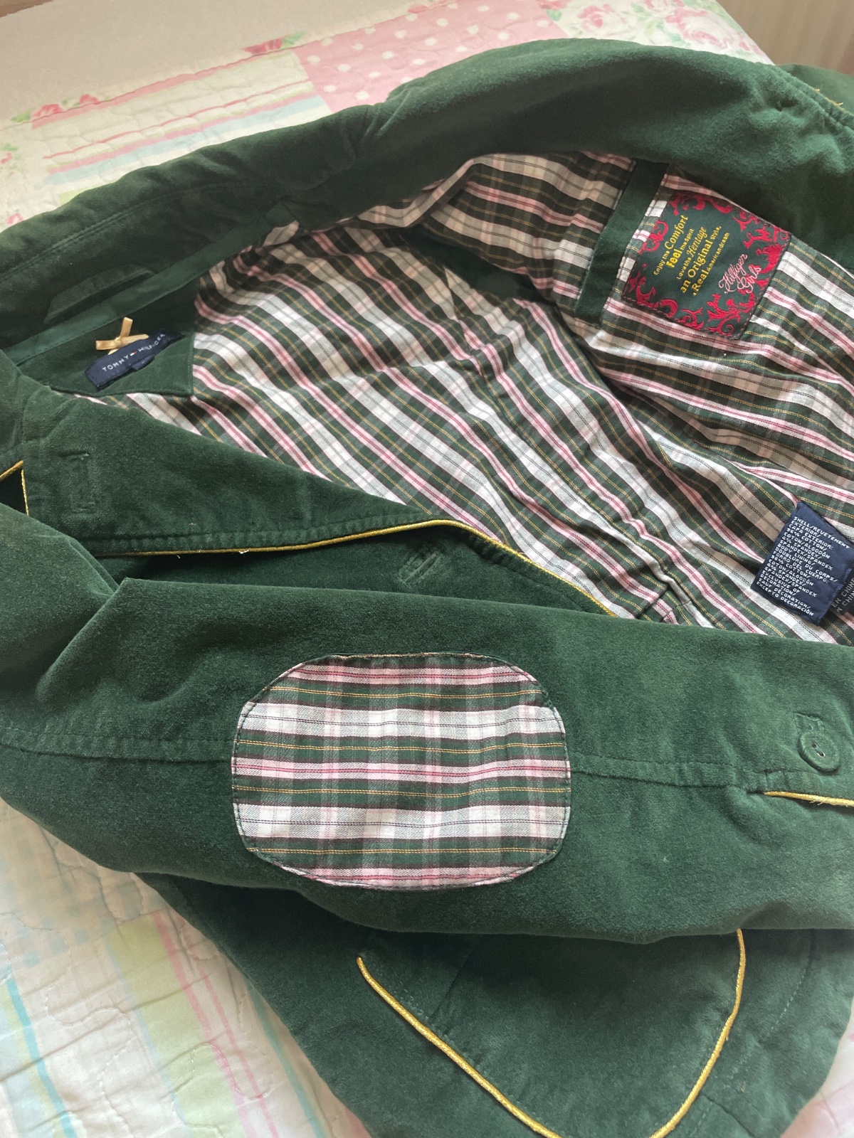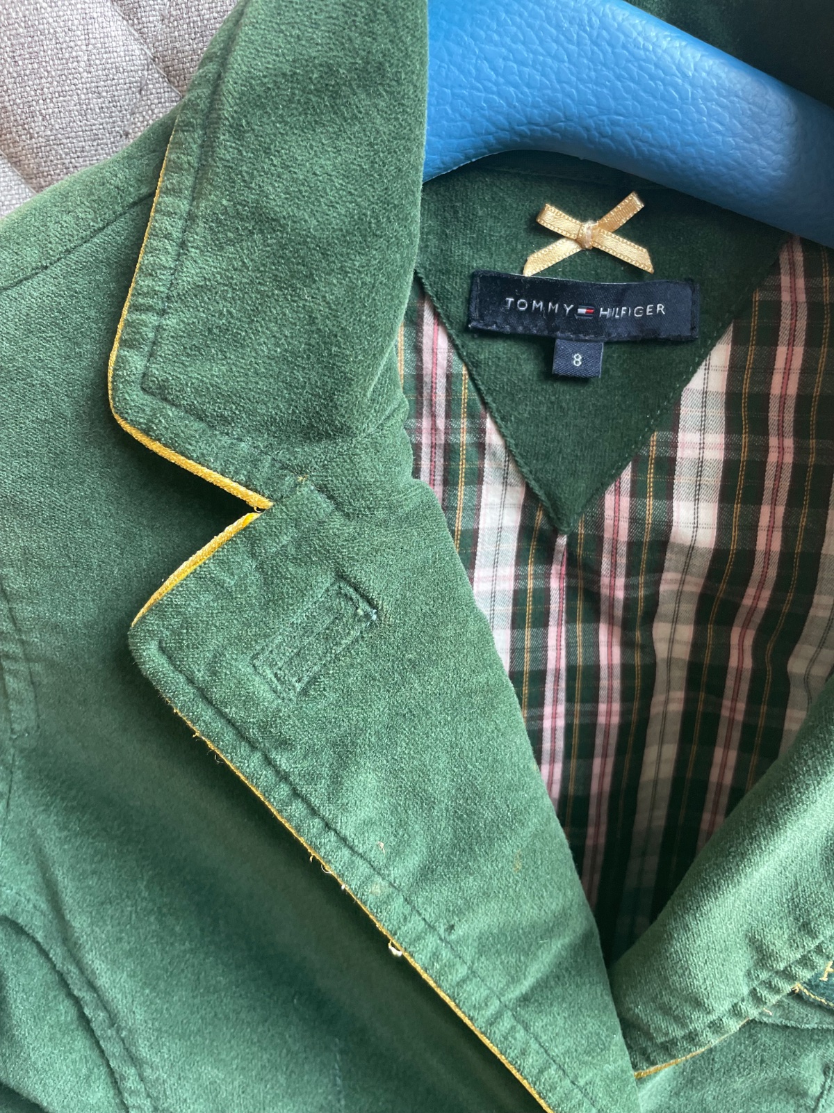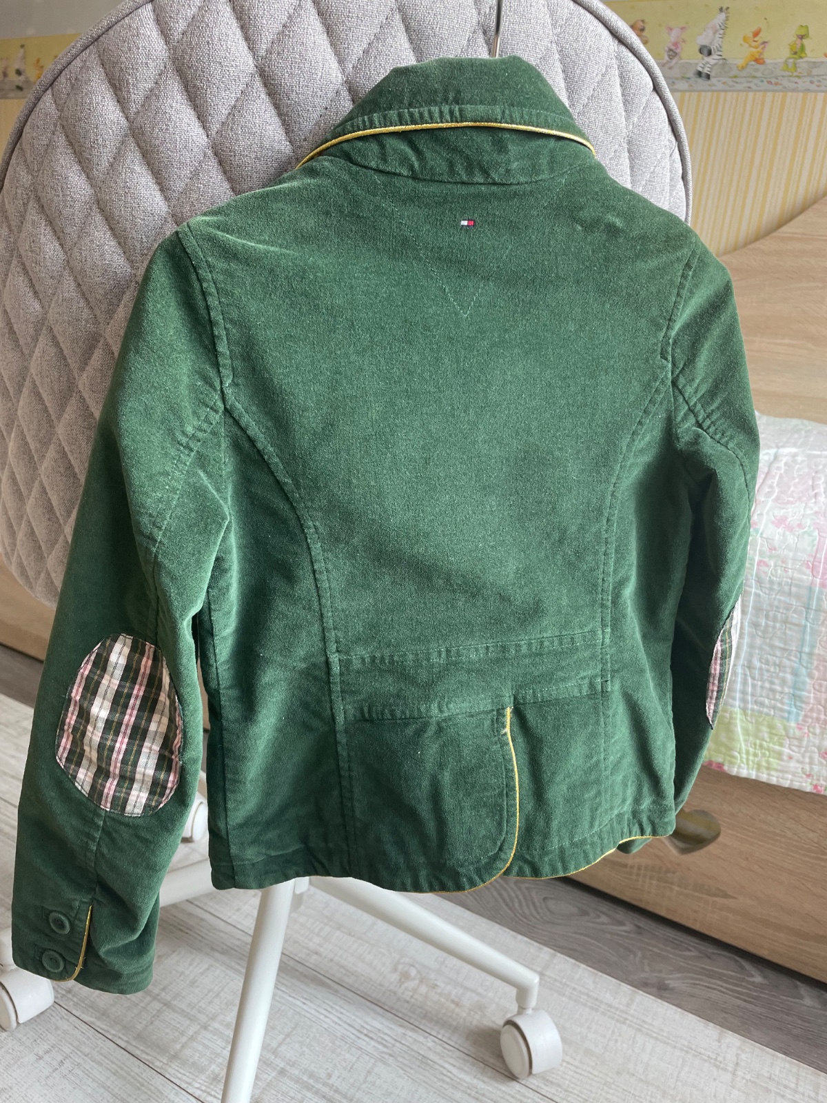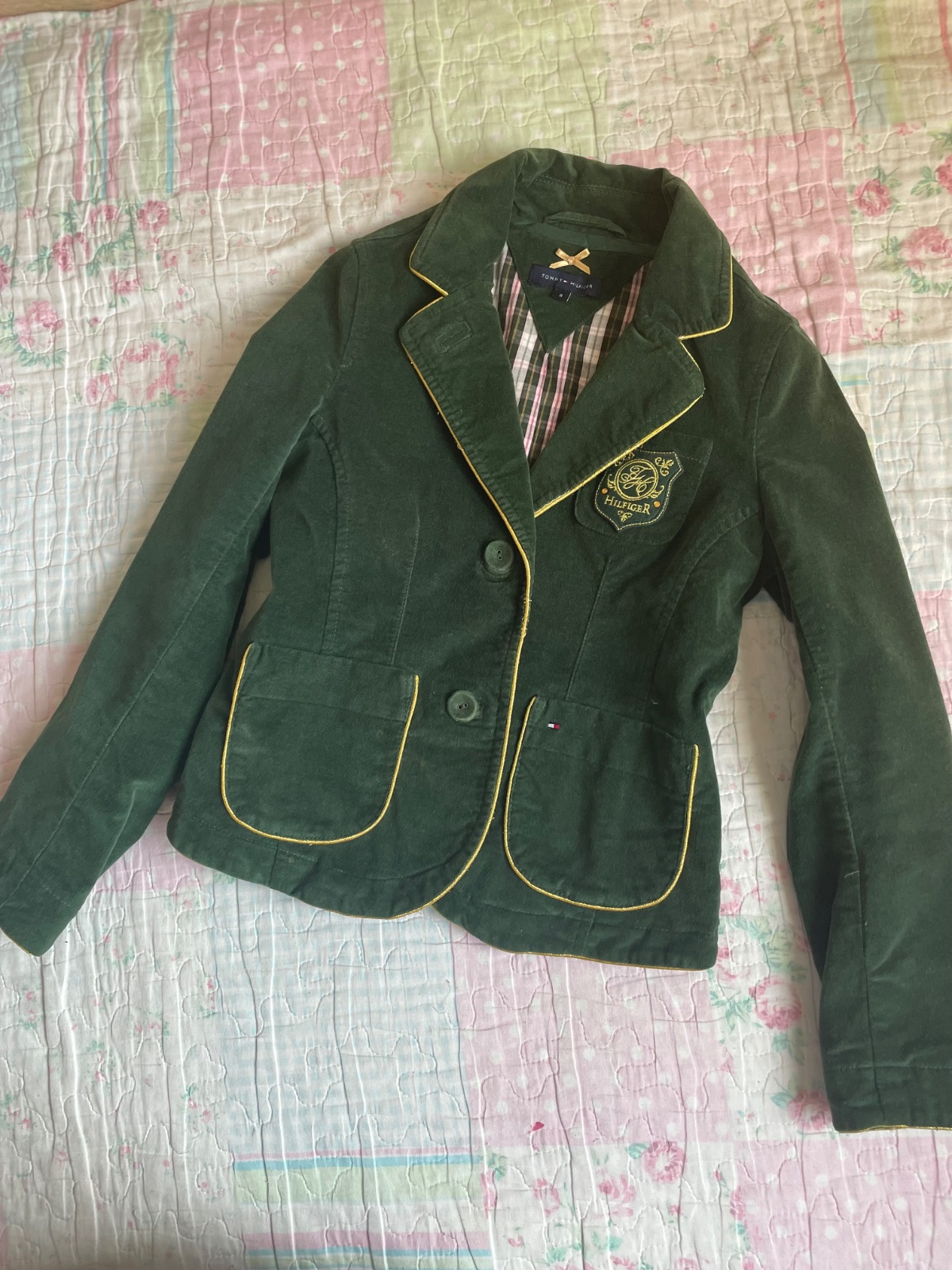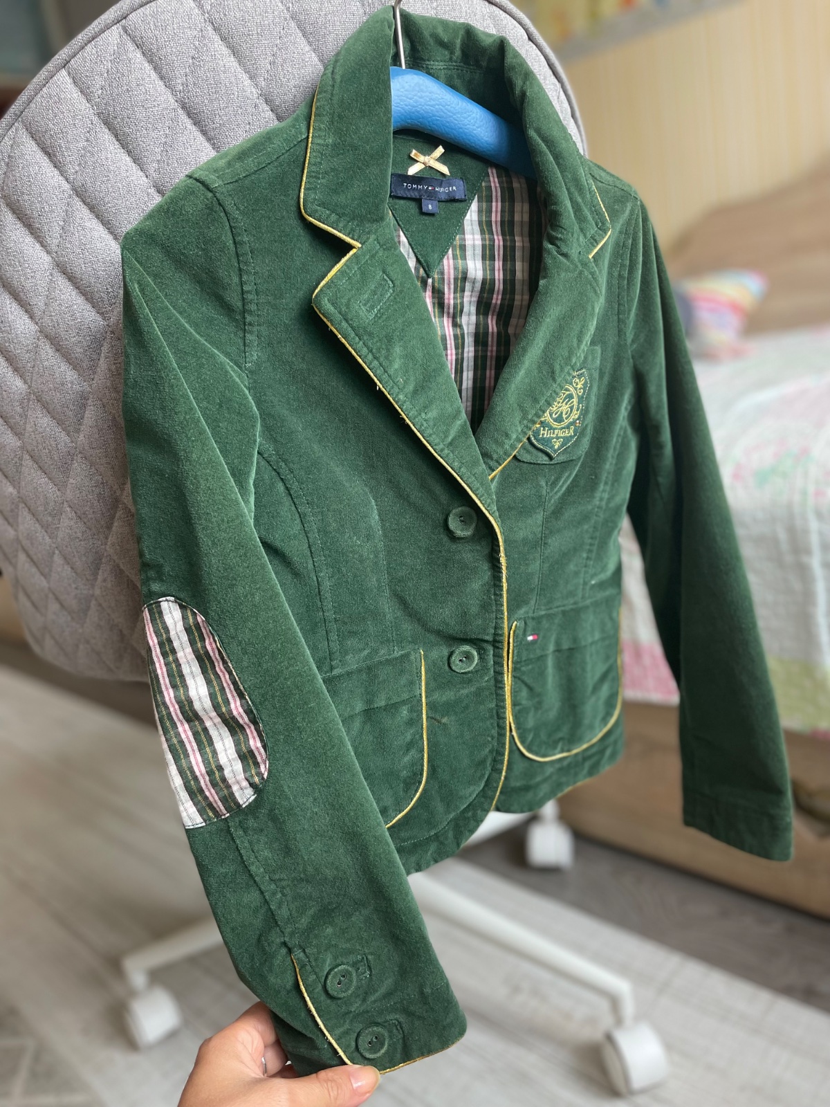Tmavozelené 🌲zamatové sako pripomínajúce uniformu👩✈️,lemované zlatou obšívkou,obsahuje vnútorne vrecko.Nadcasové a výnimočné. Dcéra v ňom bola stále “in”🥰. Stav výborný.Cena +poštovné