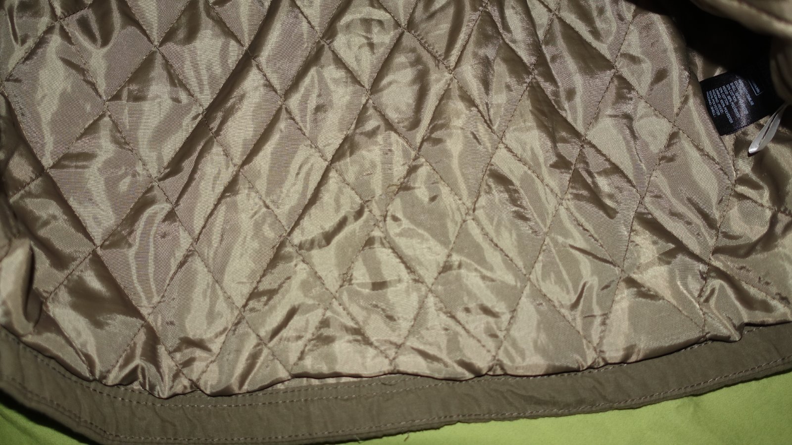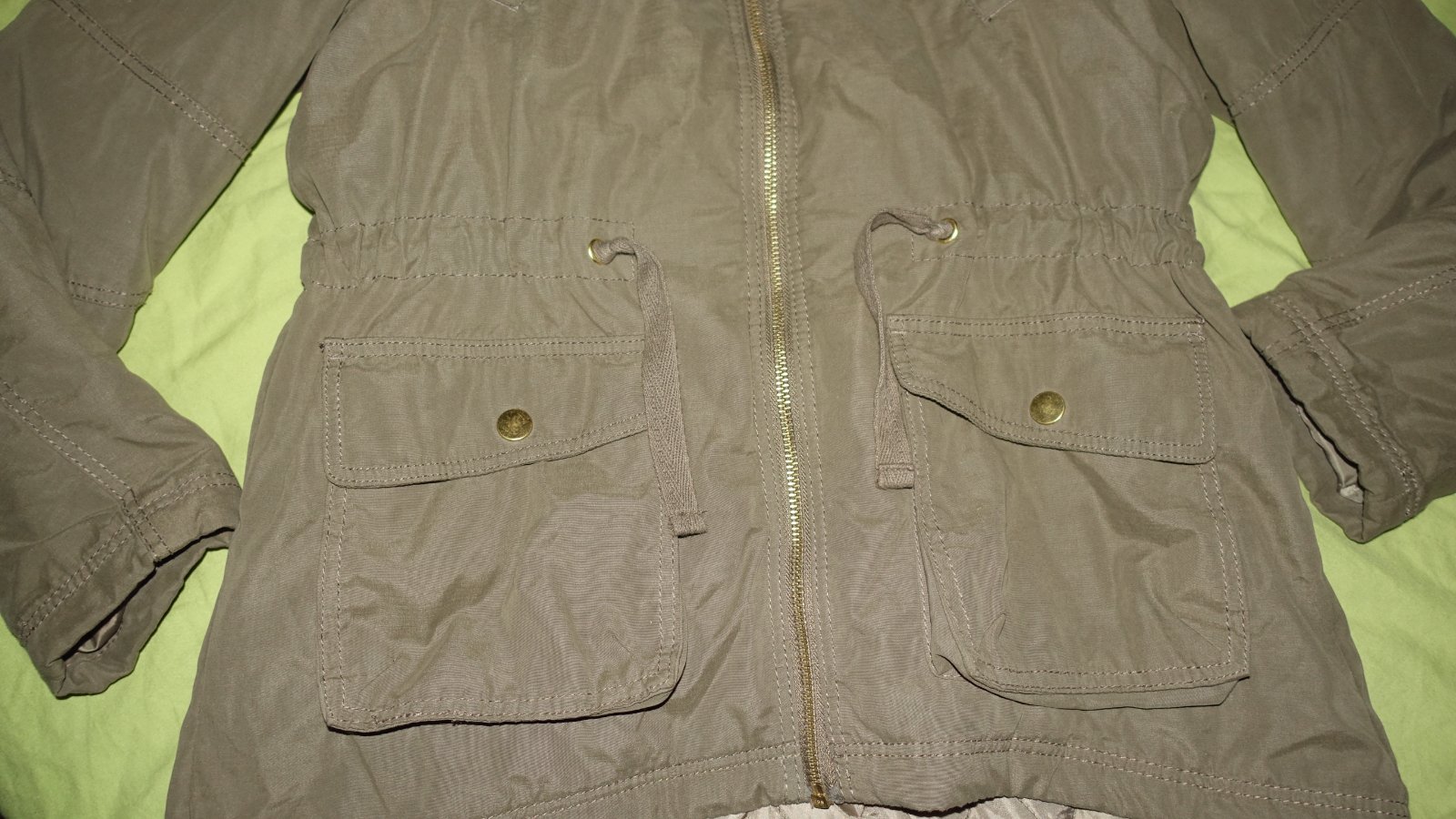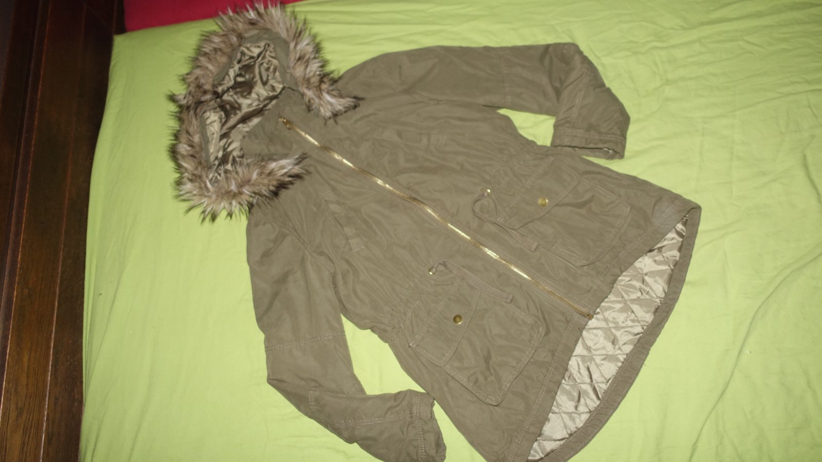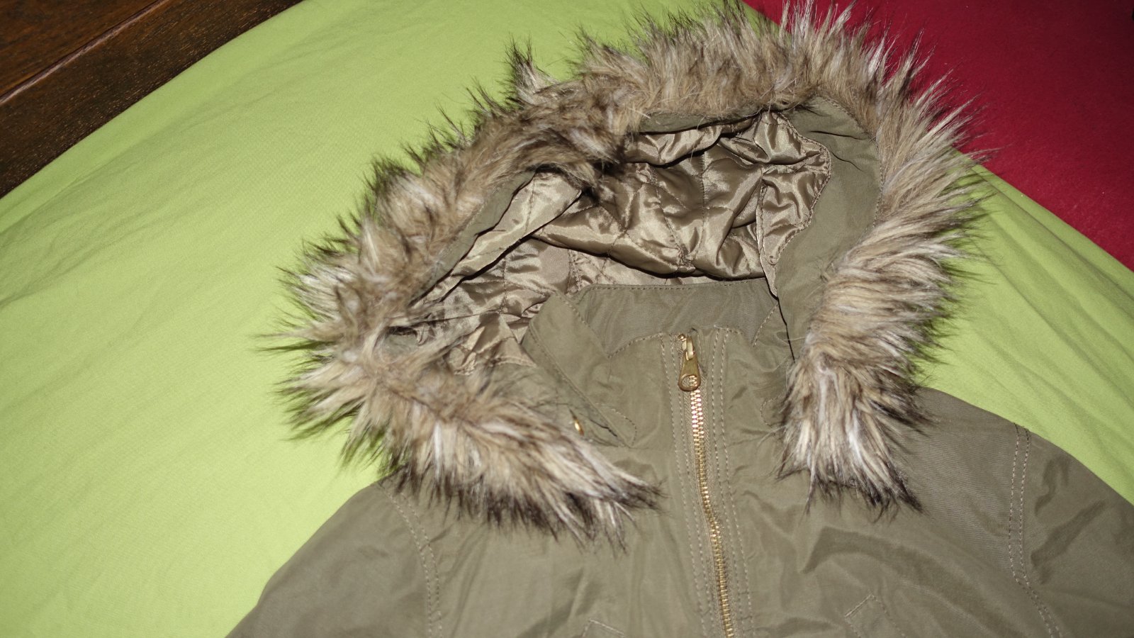 Pekna zimna bundicka vo velmi dobrom stave- vpredu pod vackom som nasla slabe fliaciky. Nie je do uplne studenej zimy- skor do miernejsej. Kapucna sa da odopnut.