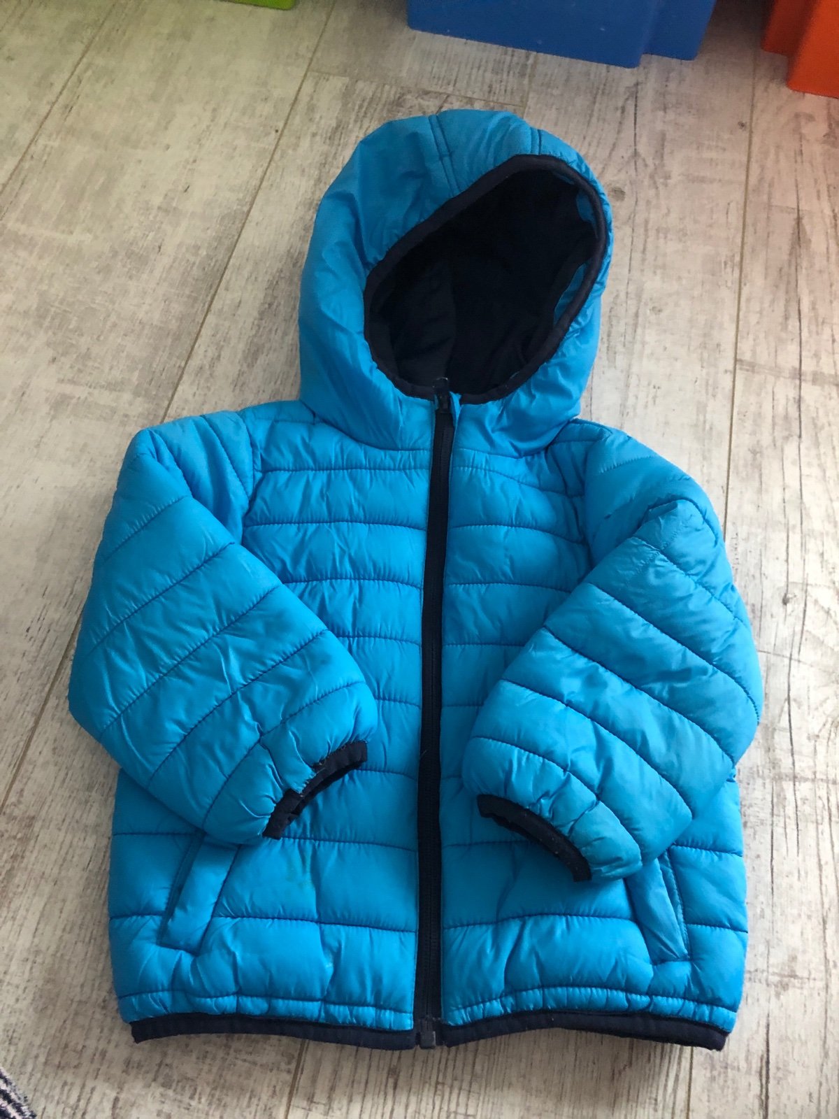 Chlapčenská vetrovka F&F, veľkosť 92, modrá s kapucňou, zapínanie na zips. Na jednej strane pod rukávom trošku zatiahnutá (viď foto), inak v dobrom stave. Nosená na von okolo domu.