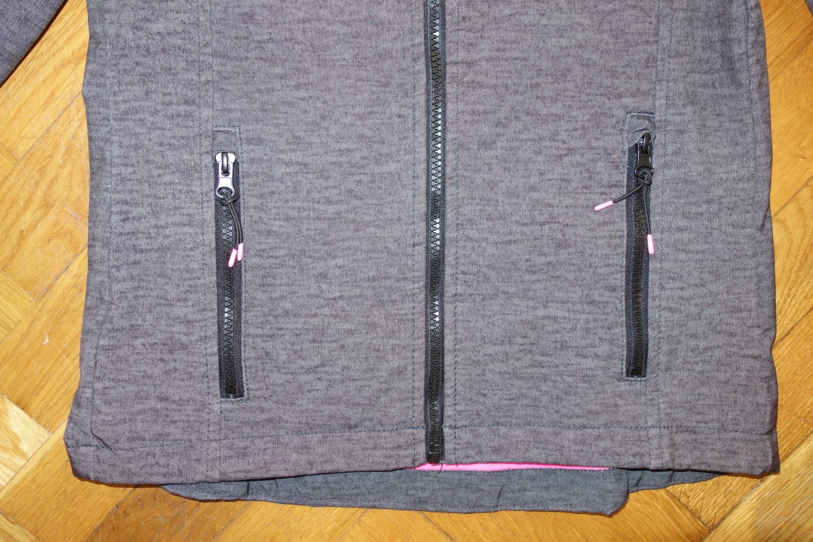 Výborný stav. Krásna tmavošedá bunda s ružovými prvkami. Zapínanie na zips, ochrana na bradu, kapucňa napevno všitá, dve vrecká so zapínaním na zips. Rukávy s ochranou na dlane a sťahovacou šírkou.