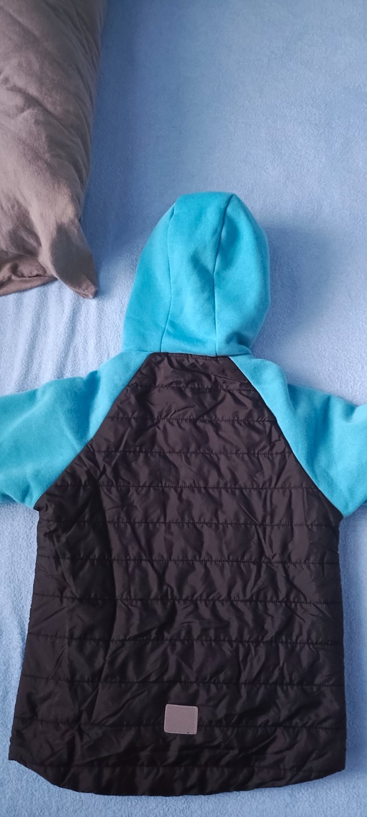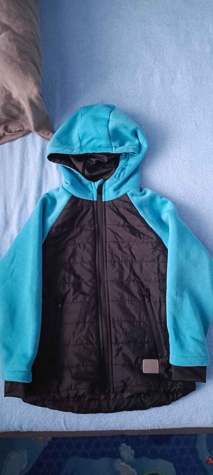 Prechodná bunda Next nosená na striedačku s inými, bez poškodenia, softshellová mikina Crivit,modro čierna Fisherfield,obidve oblečené asi 2 x, veľkosť 140