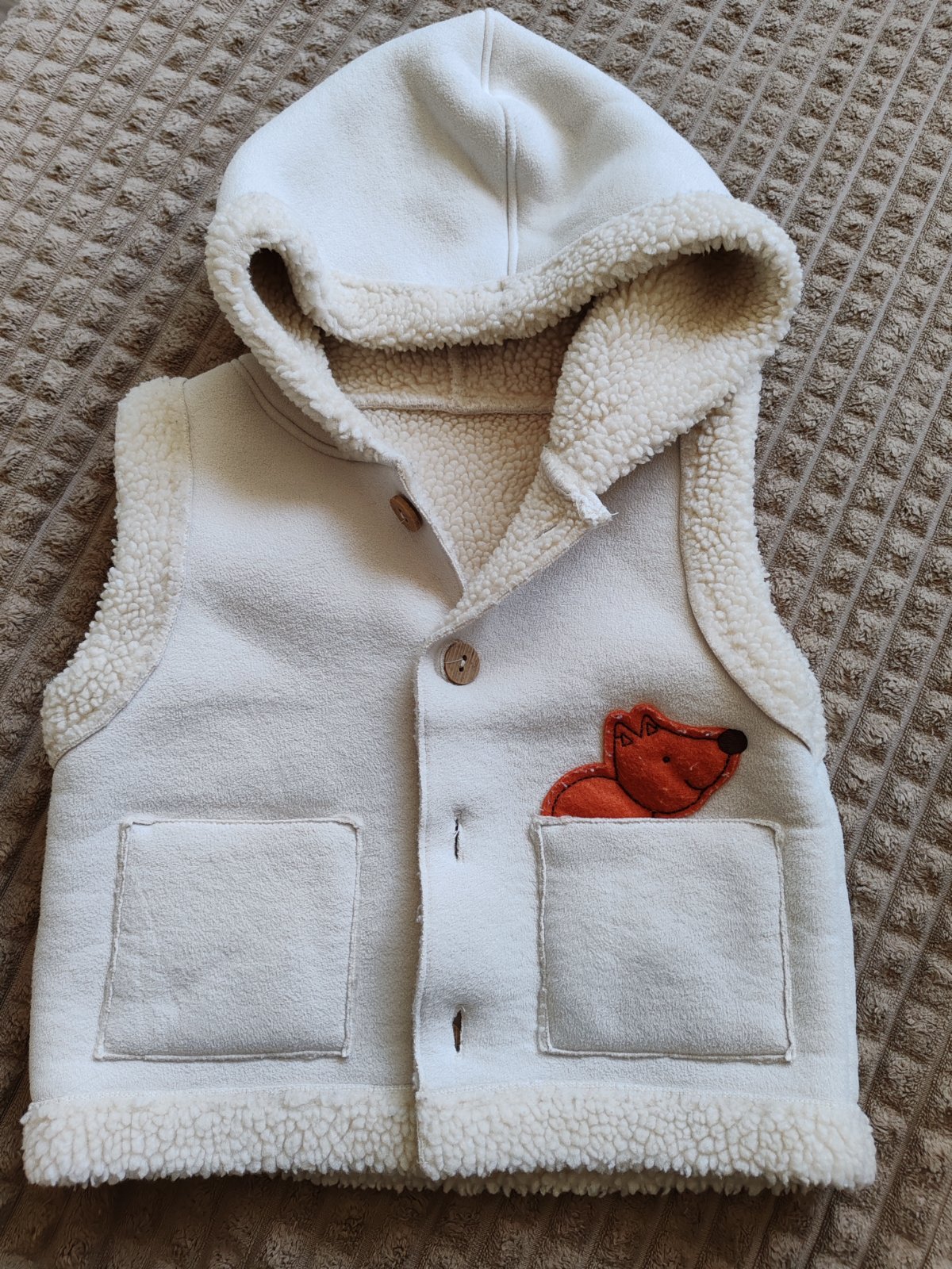 Nádherná vesta vhodná aj pre chlapcov aj pre dievčatá. Ma jemný fľak pri gombíkoch, ale je to minimálne vidieť (aj odfotene). Iné poškodenie som nenašla. Nosili sme pri veľkosti 74 a 86.