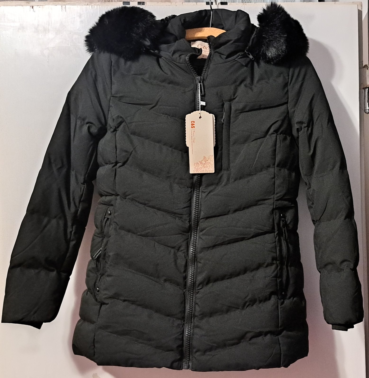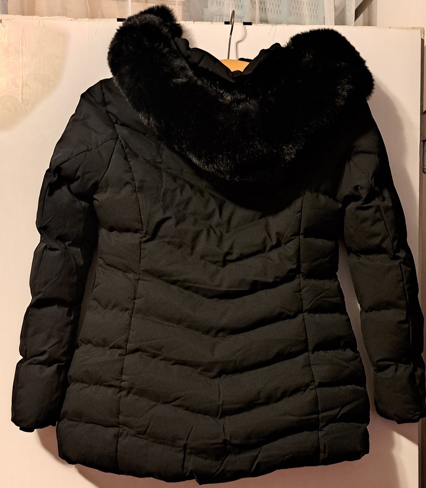 Dlhšia čierna bunda. Sedí na veľkosť M/L.