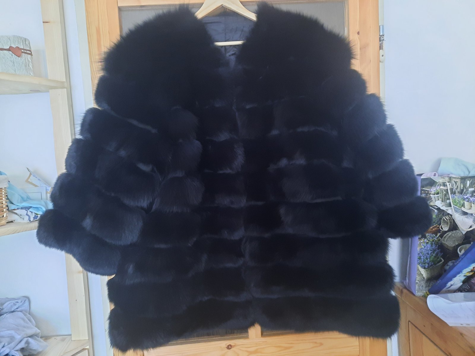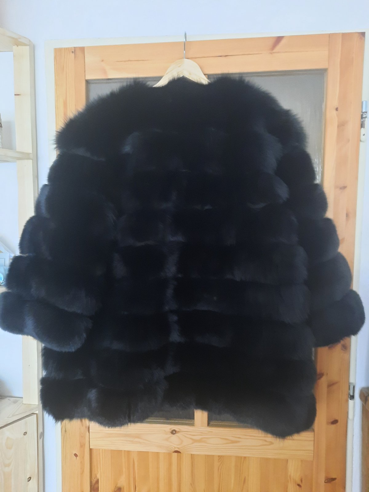 Dámsky kožuch. Dĺžka je 90cm,obvod hrudníka je 140cm a obvod pása je 130cm. Dĺžka rukáva je od krku 75cm. Na tento kožuch akcia neplatí