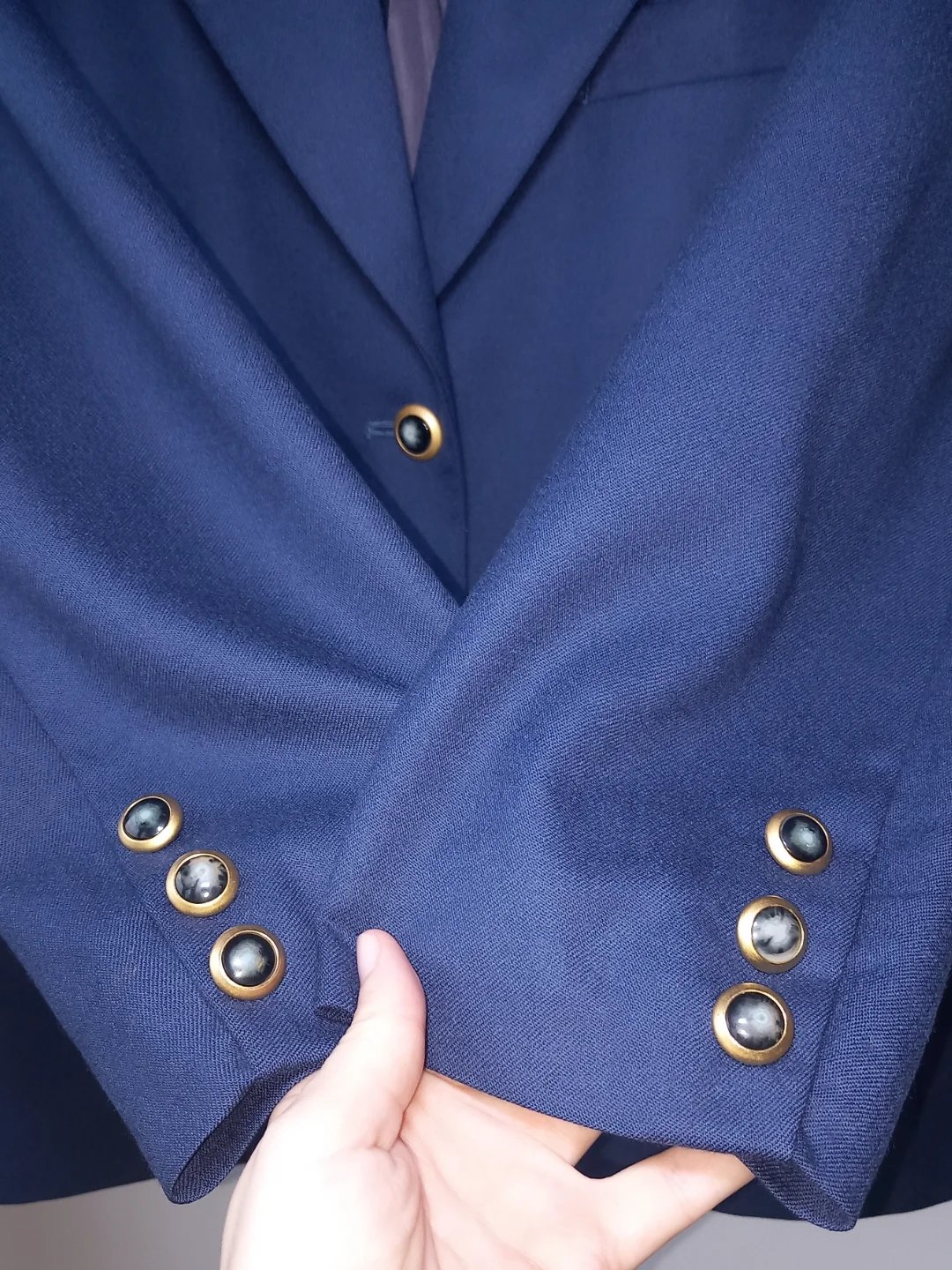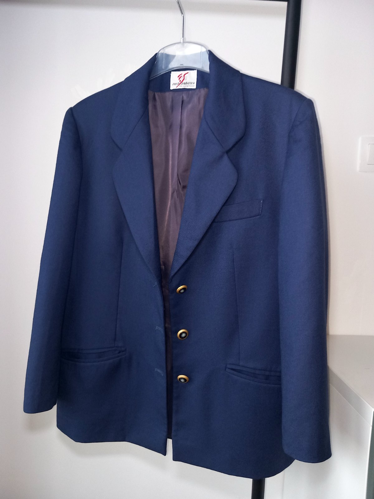 Vintage vlnené sako v tmavomodrej farbe s francúzskym pôvodom od značky Fred Sabatier (dnes už neaktívna značka).