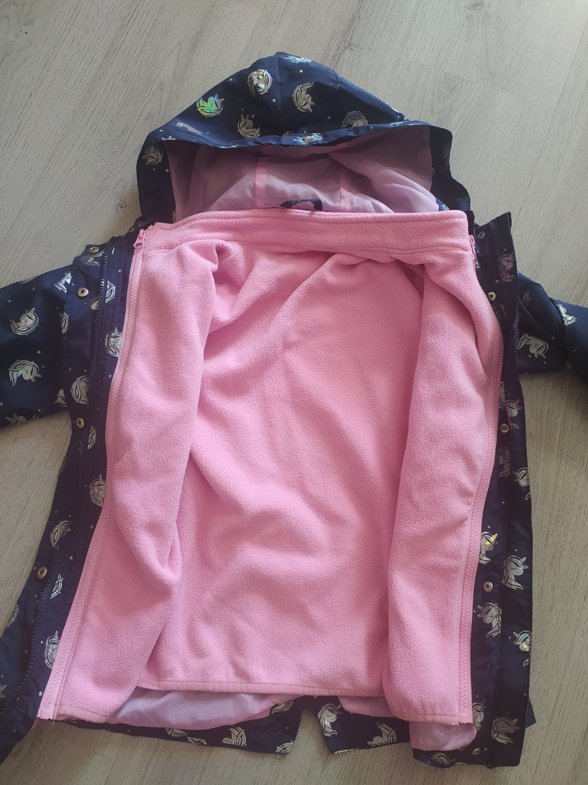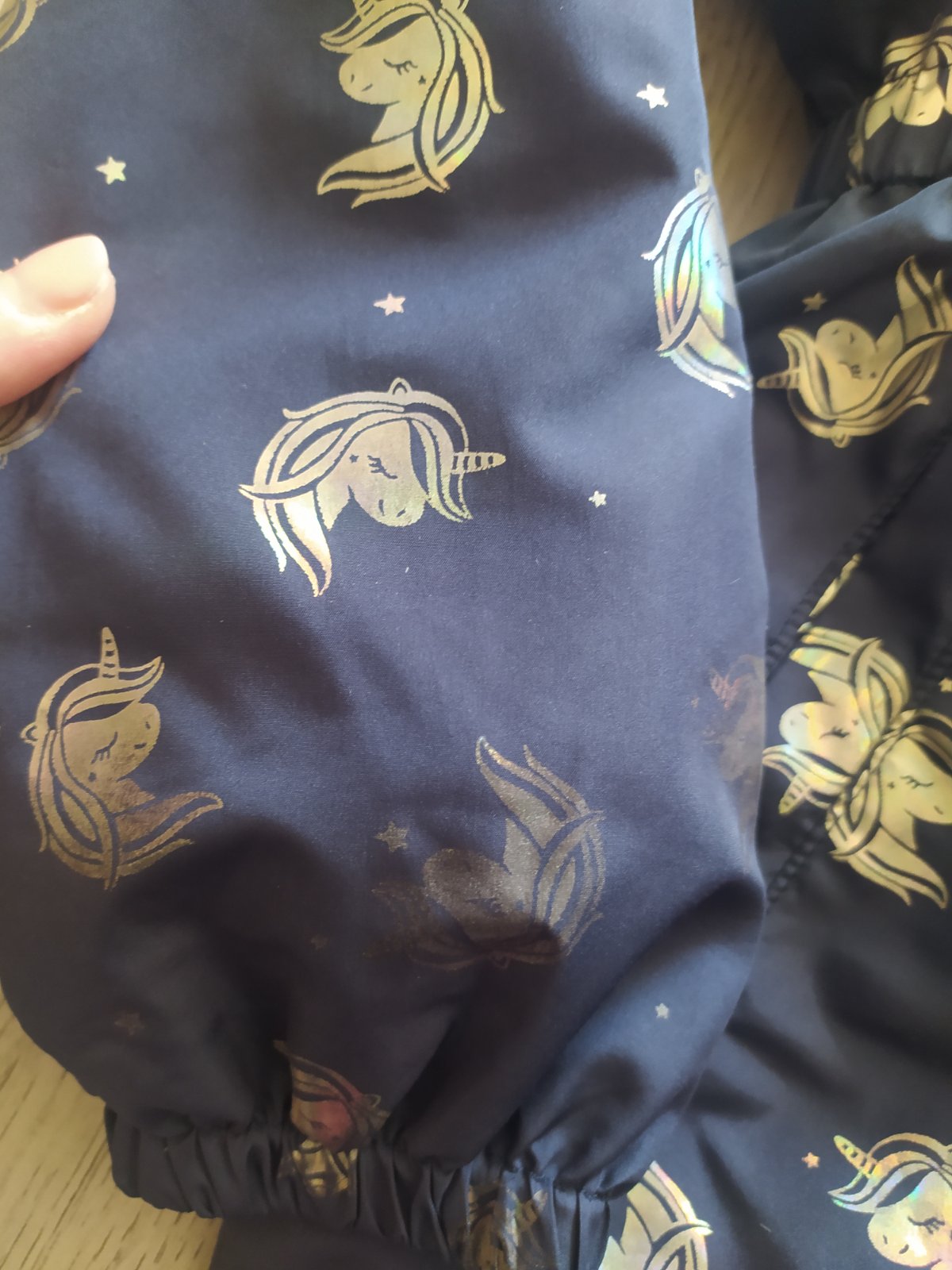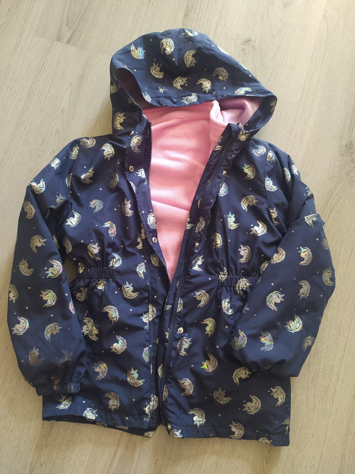 Predám tento prechodný kabát je v peknom nosenom stave poškodenia nemá no rukávoch tie jednorožce stratili tú lesklosť.. V nosení to nebráni podľa mňa .Farba je sýtejšia, na foto to nevidieť tak .