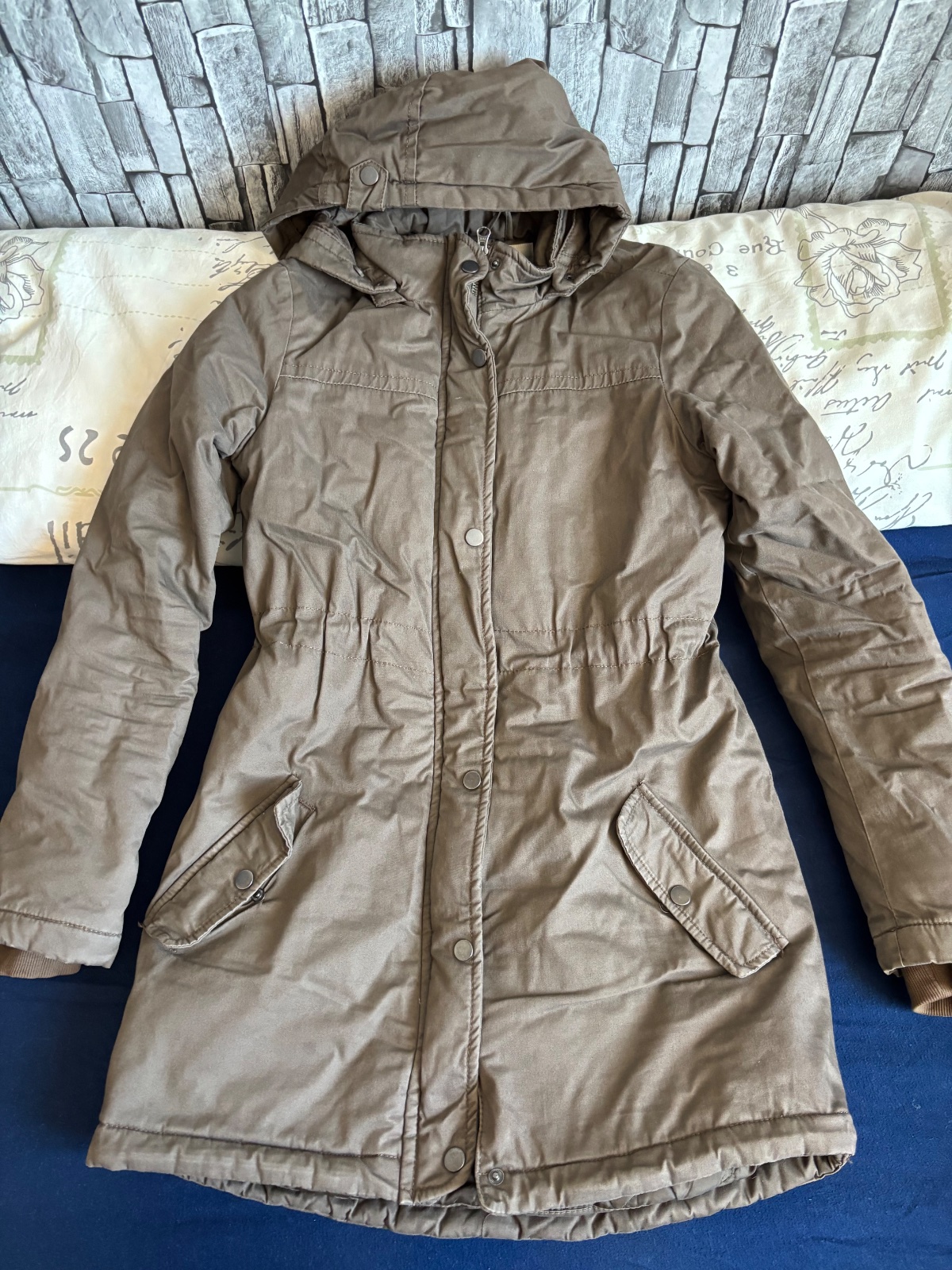 Predam kvalitnu zimnu bundu z recyklovaneho materialu. Da sa navoskovat, aby bola vodeodolna (este nebola voskovana). Ma dole rozparok, aby sa v nej dalo hybat, sportovat. Ja som si tam pridala snu...