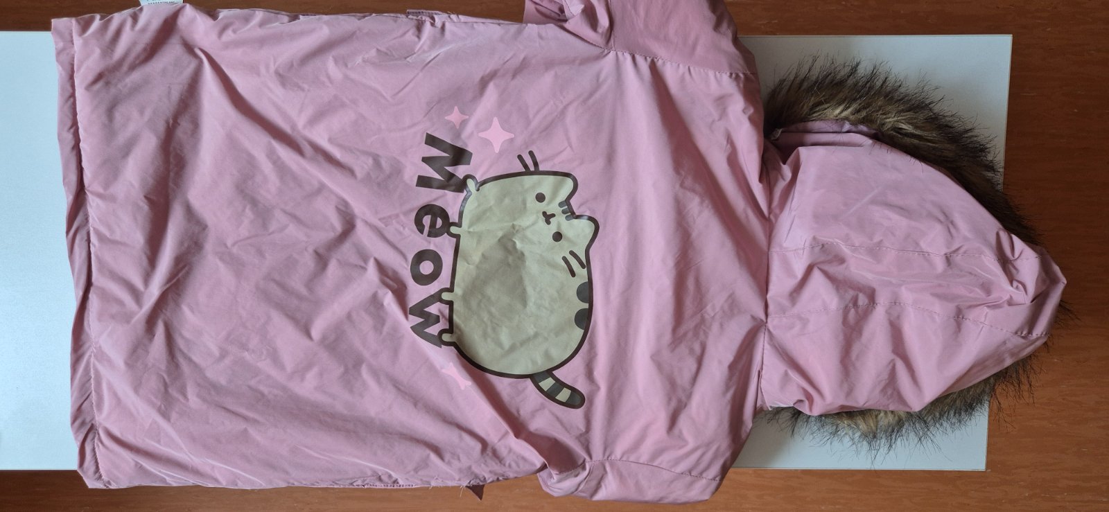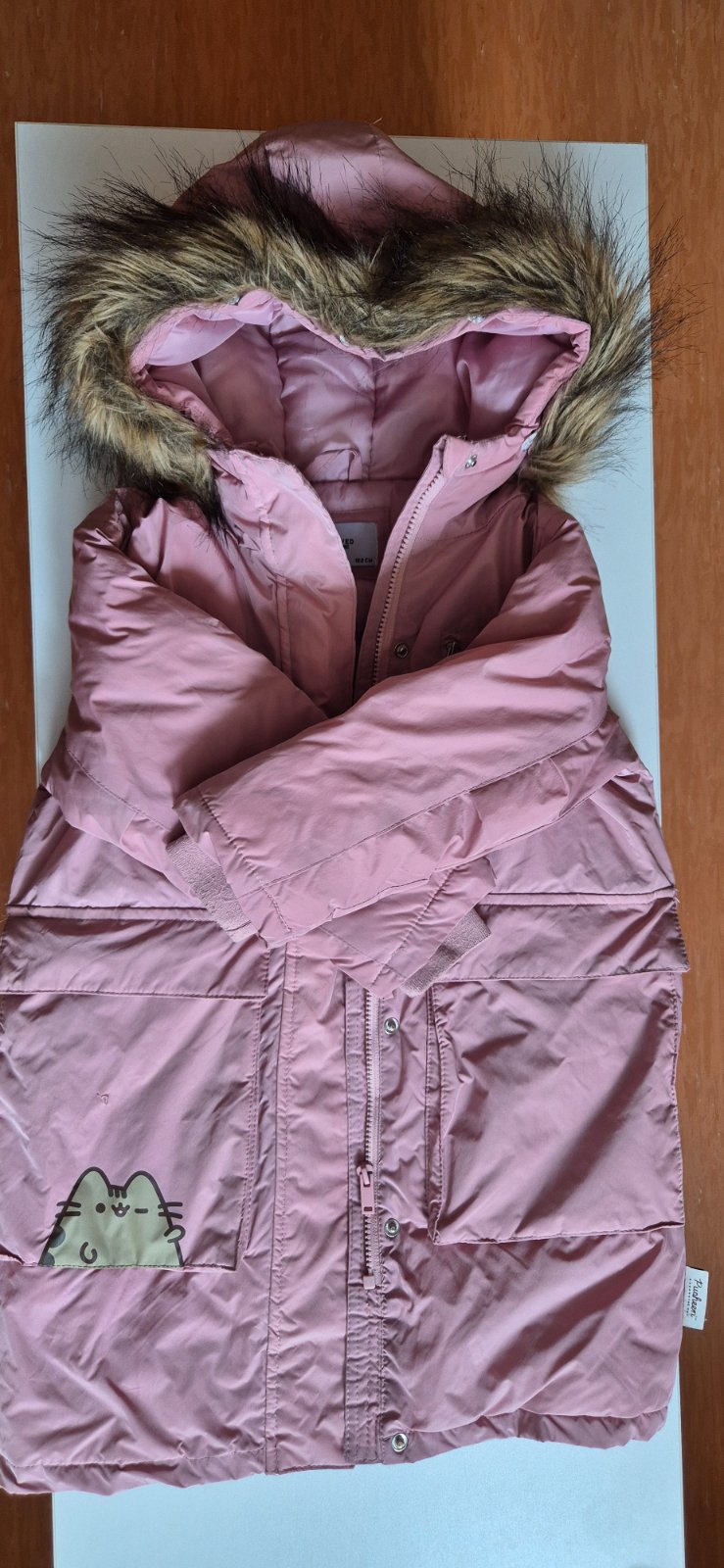 Dievcenska bunda nosena prilezitostne, velkost 122 sedi, vpredu maly bledy fliacik, vid foto. Kapucna sa da zvinut do pekneho goliera.