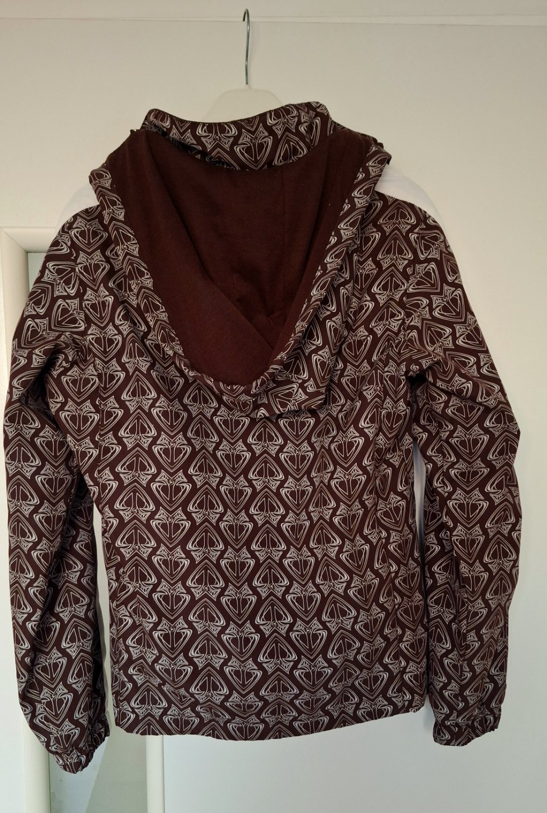 Materiál polyester (šuštiaková). Podšitá, nezateplená. S kapucňou, dá sa odzipsovať a dať dolu. Naboku vačky, zapínanie na zips a vnútri 1 vnútorný vačok.