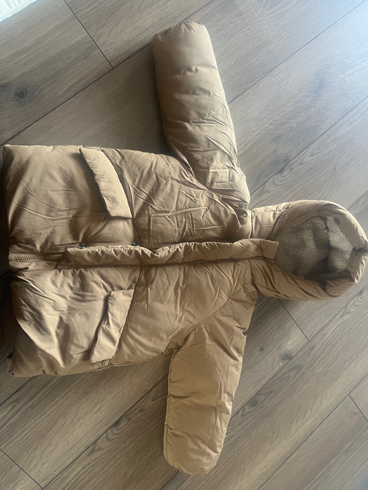 Krasna tepla bunda krásnej bledohnedej perleťovej farby Zara s umelou odnímateľnou kozusinkou na límci, velkost pisu XL ale skôr L. Treba sa riadiť rozmermi, šírka pod pazuchami je 51cm, celková d...