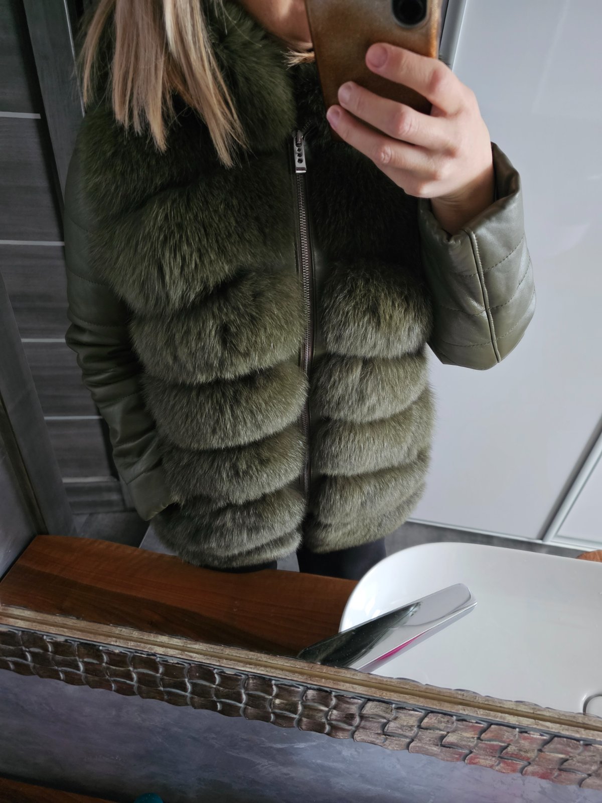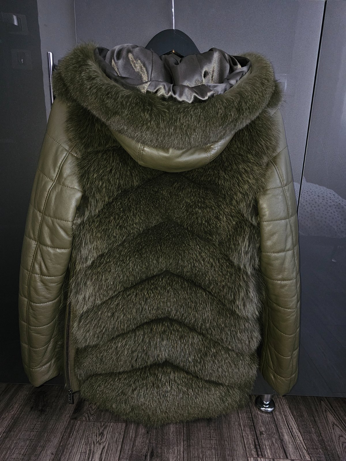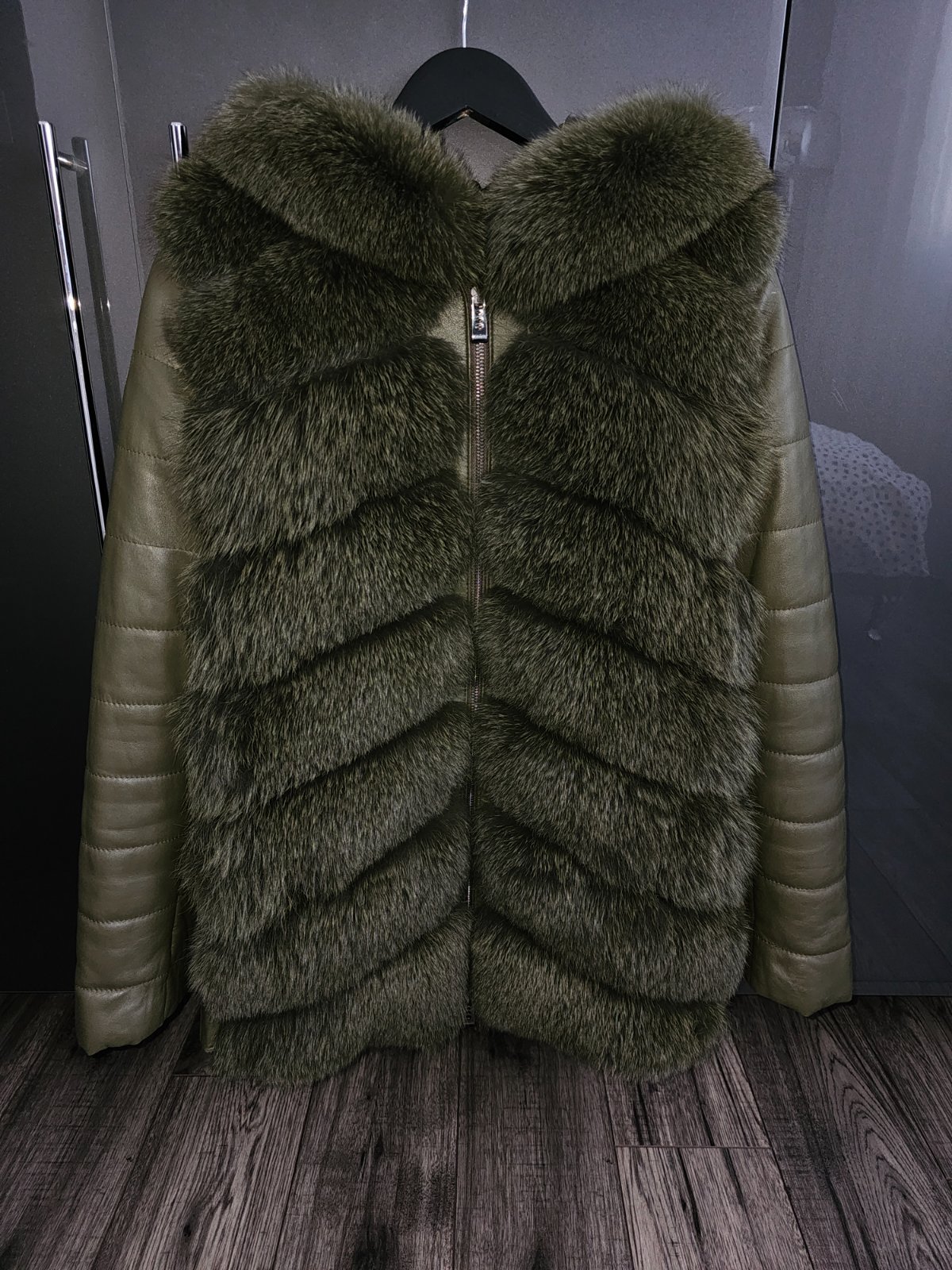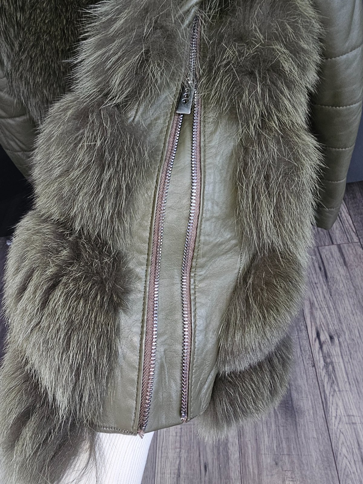 Khaki kožuch z líšky a pravej kože