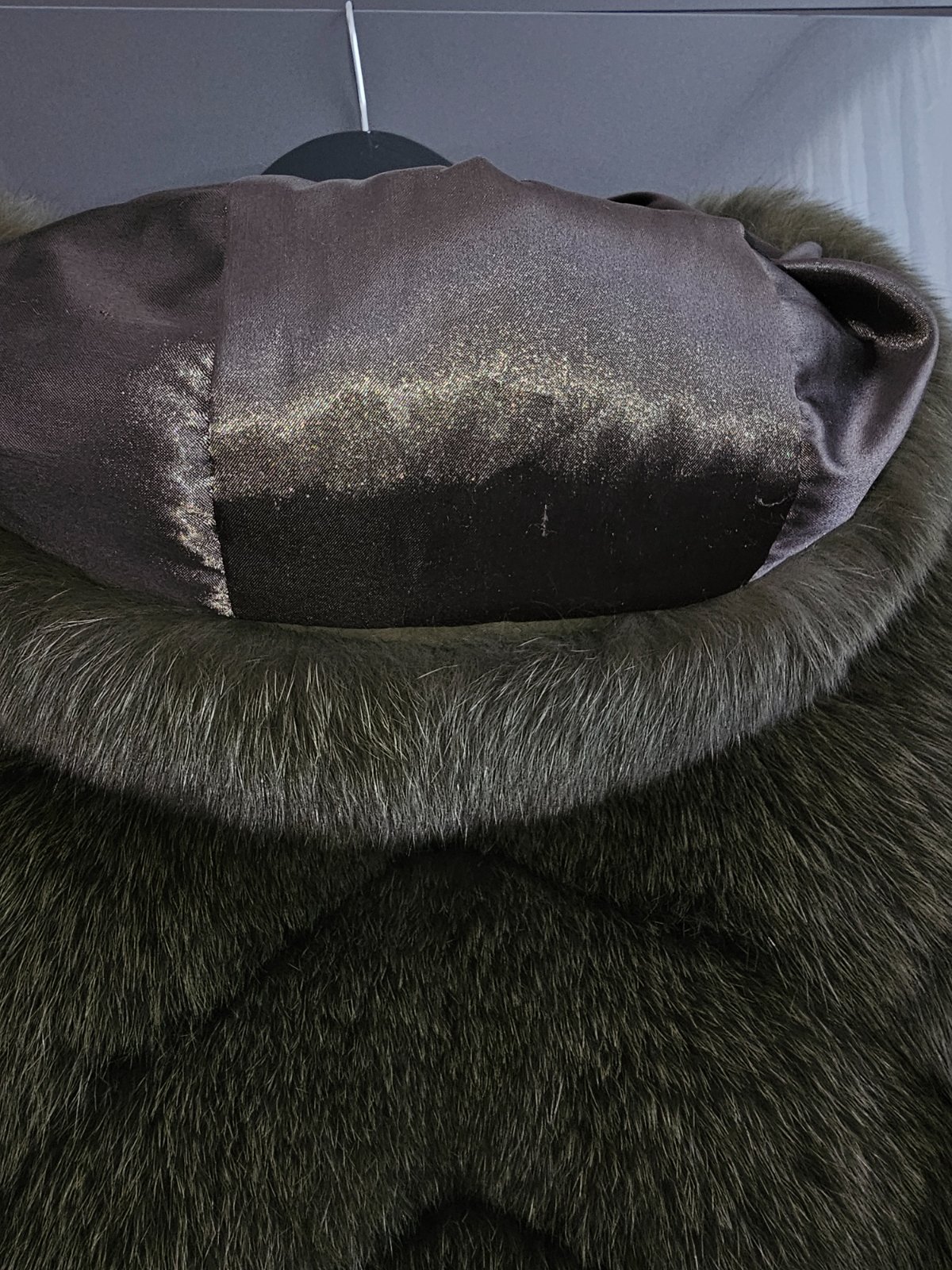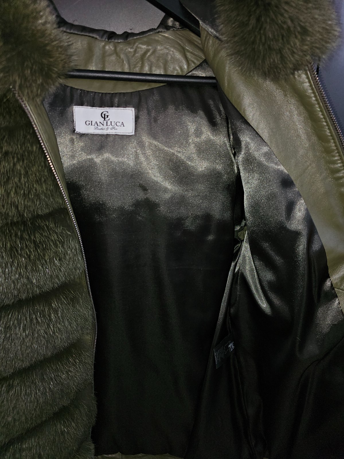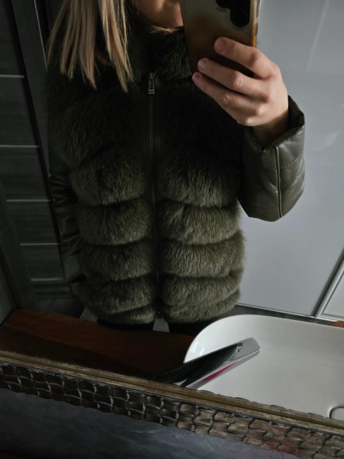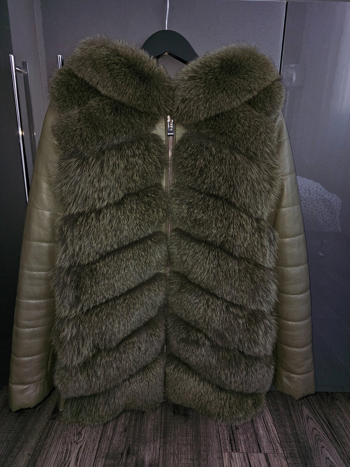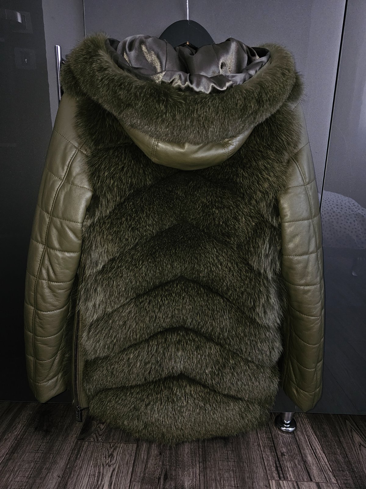 Khaki kožuch z líšky a pravej kože