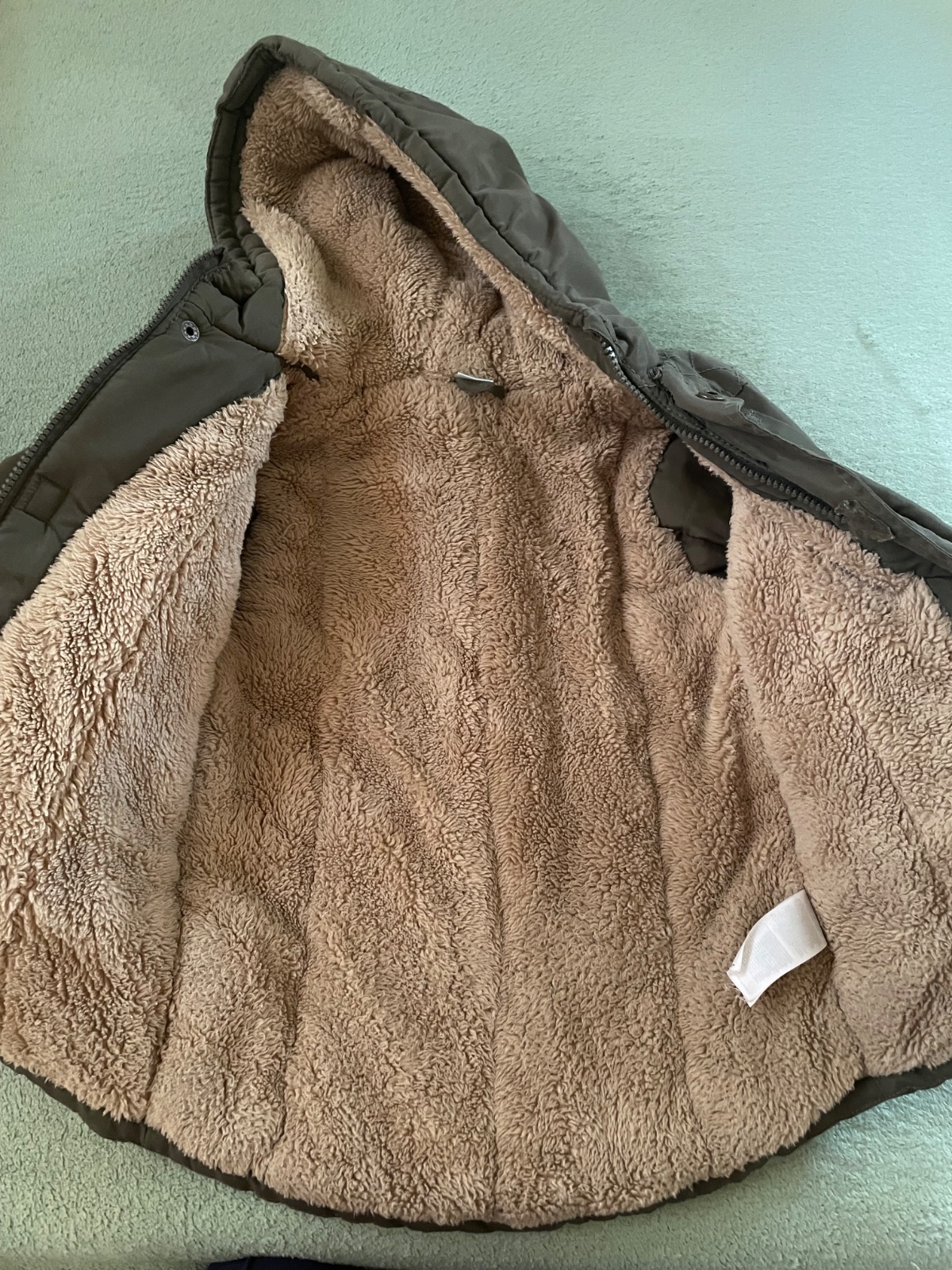 Nosena bombera. Olivovo zelena. Na patentich vidno nosrnie. Inak nema inu chybu.