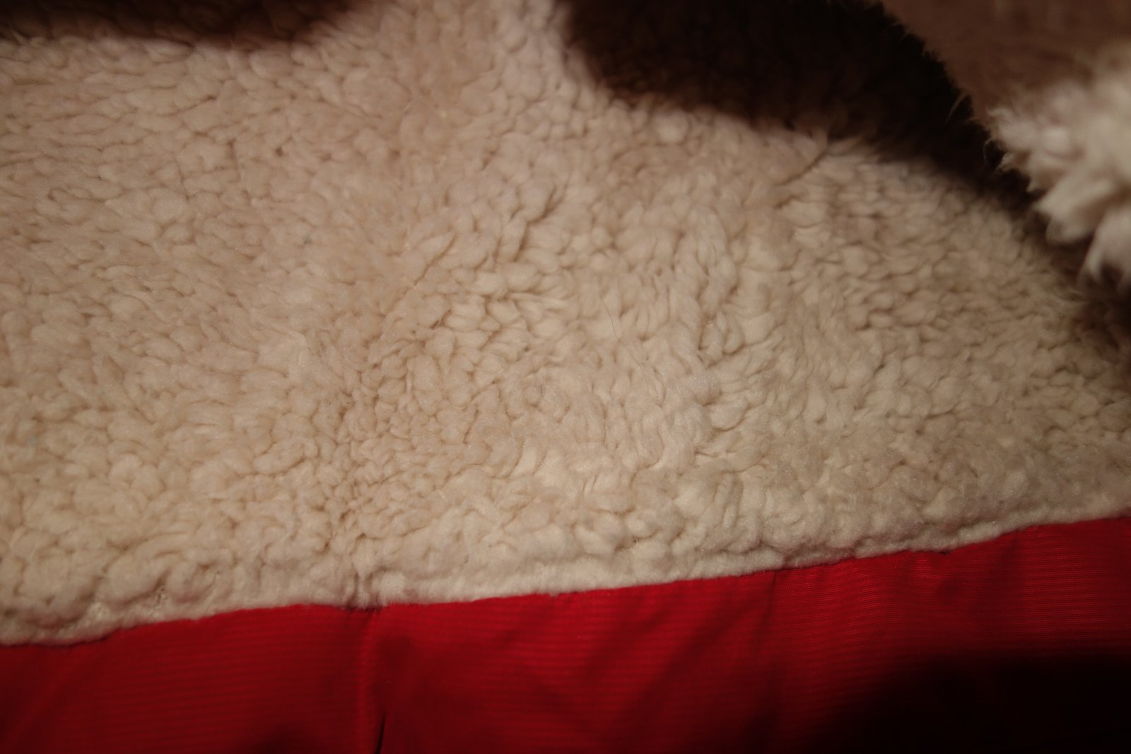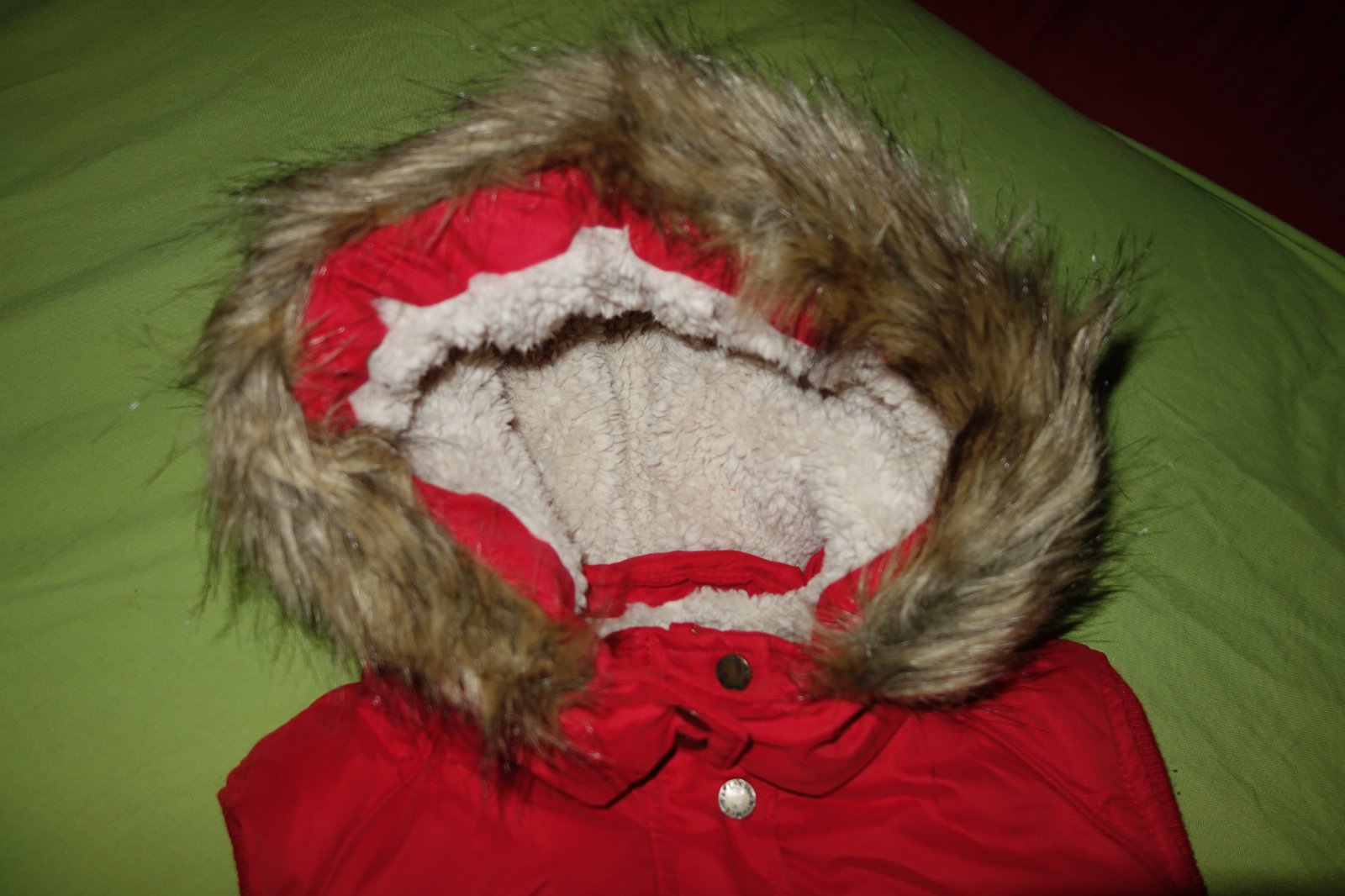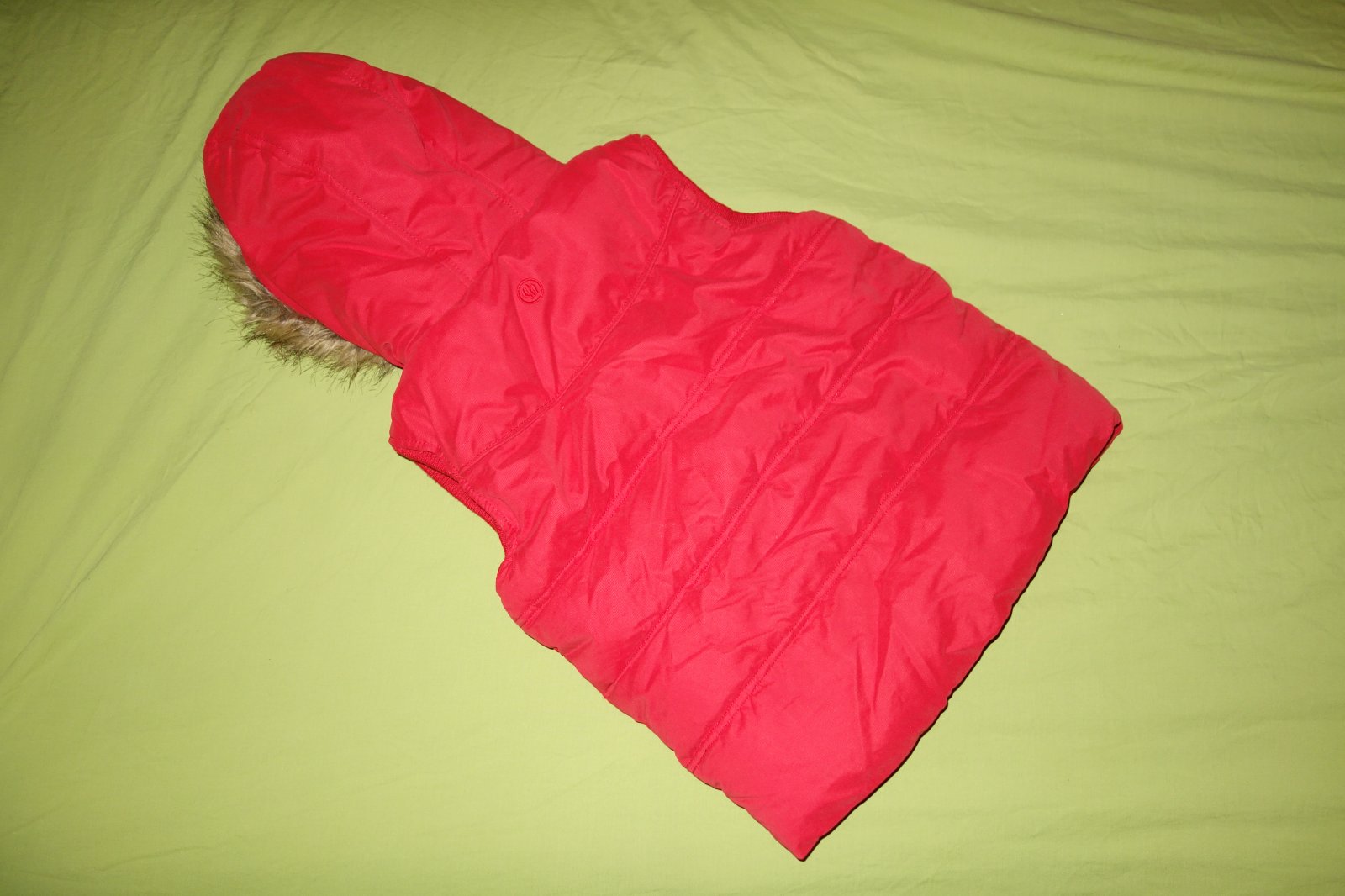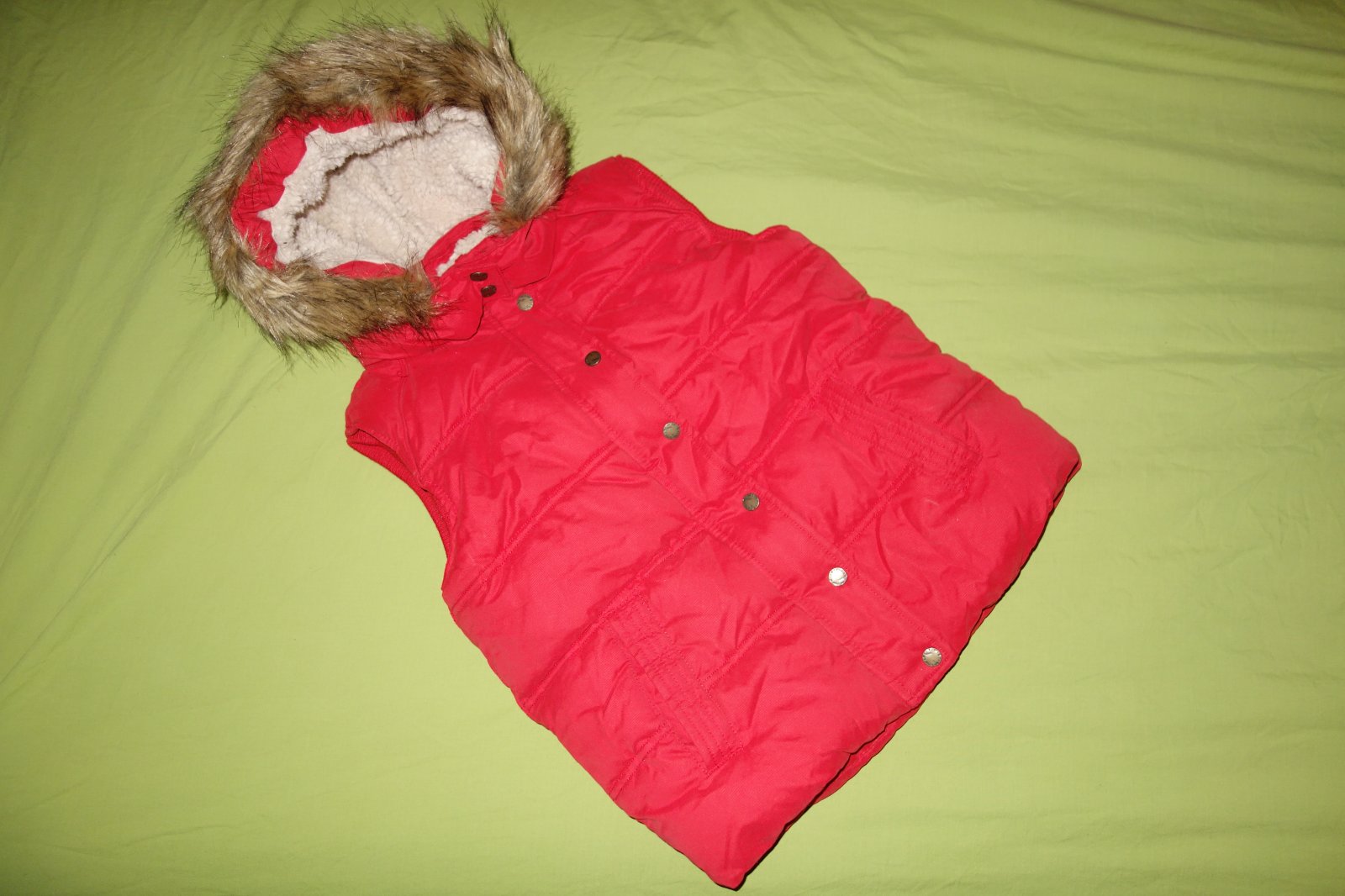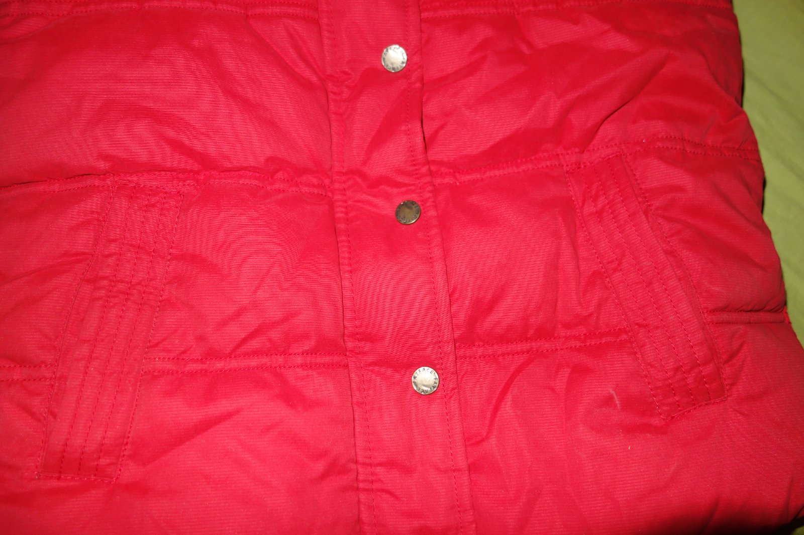 Krasna hruba vesta vo vybornom stave.Zapina sa na zips, ktory je prekryty cvockami.
