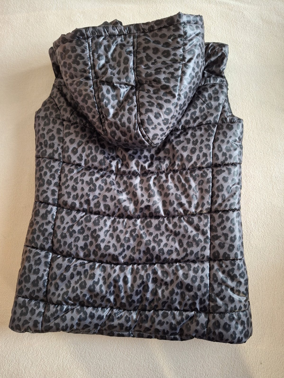 Prechodná vesta sivej farby so vzorom, s praktickou kapucňou a vreckami.