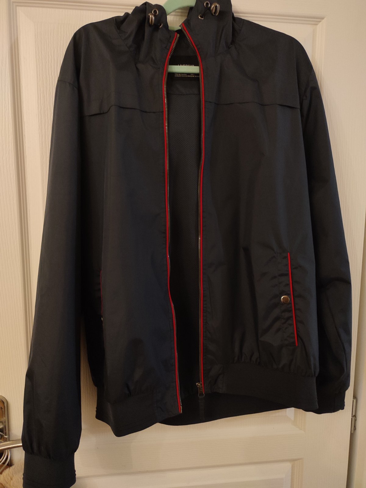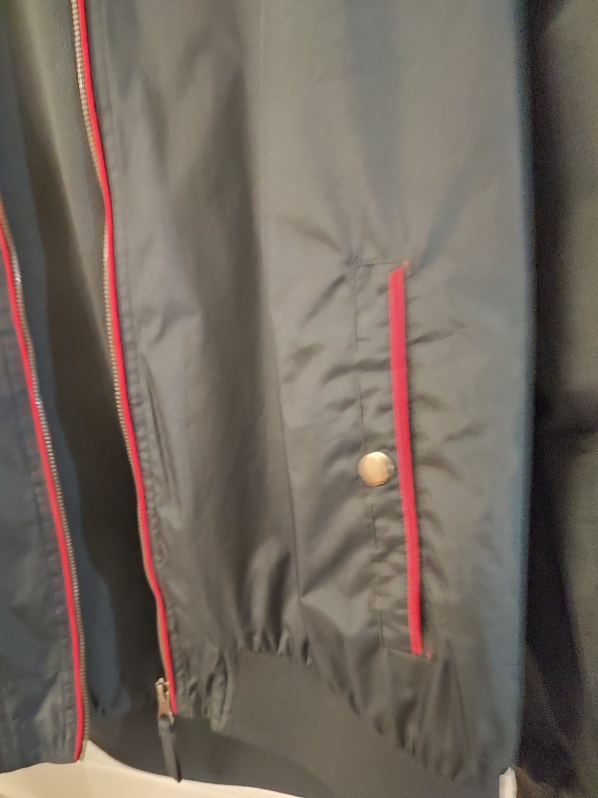 Šuštiaková vetrovka pre pánov/chlapcov. Našli sme na rukáve dierku viď foto, aj vpredu trošičku zatiahnutá. Čiže skôr asi na donosenie. Ale stále super.