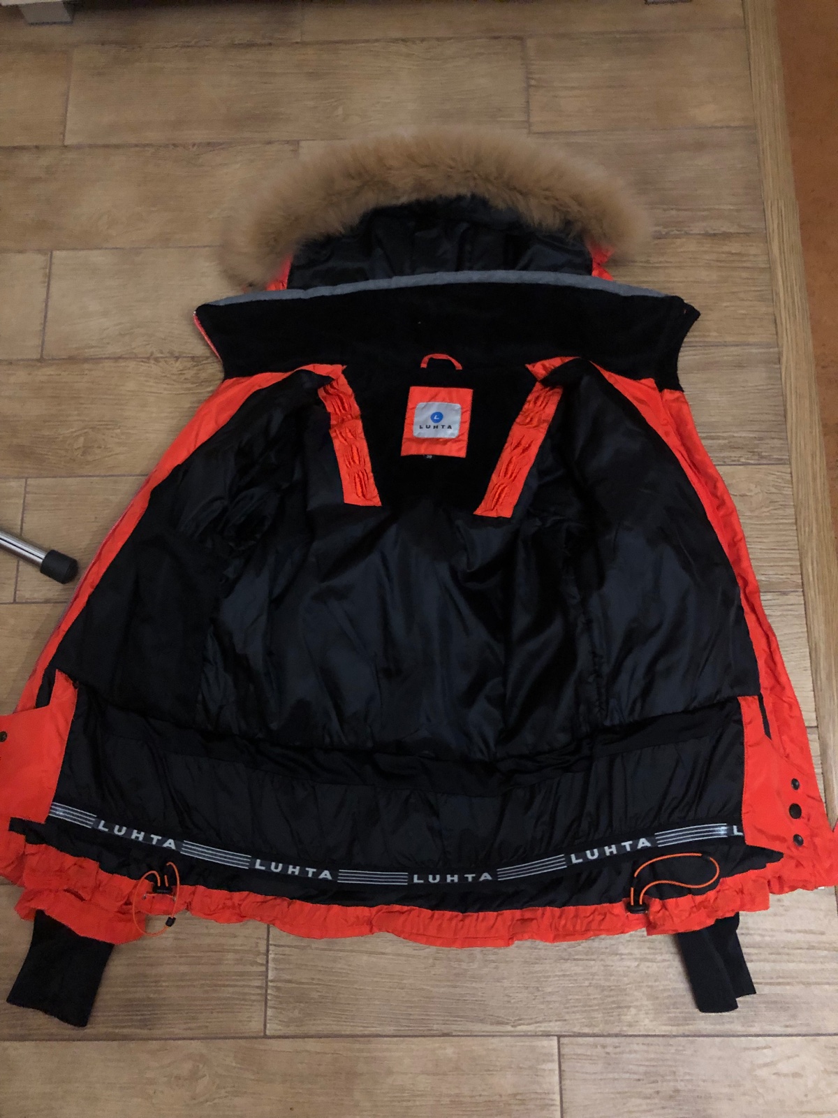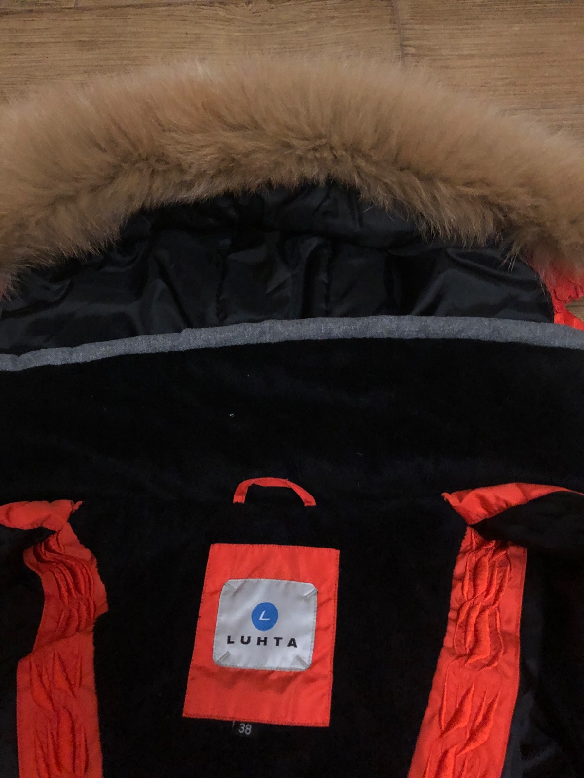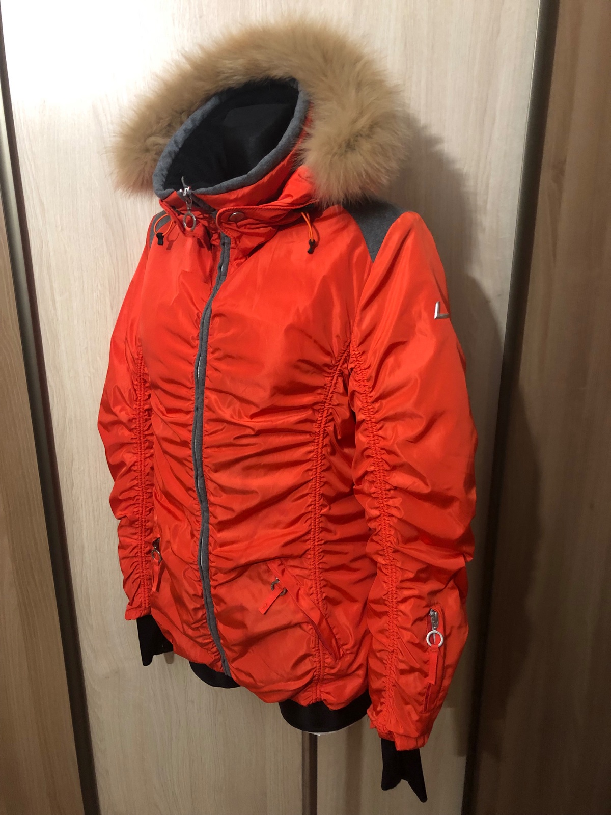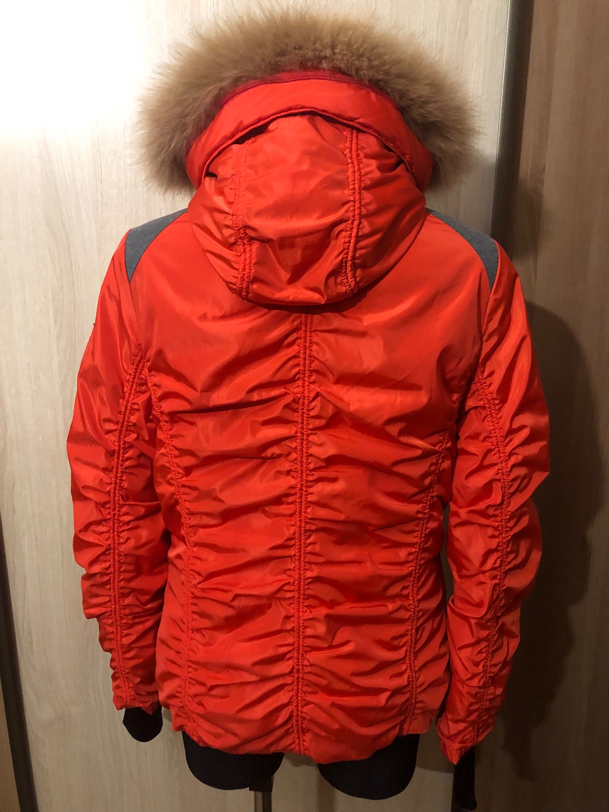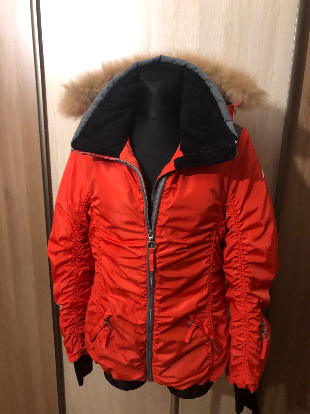 Veľmi dobrý nosený nosený stav. Farba taká mrkvová, oranžovočervená. Teplá, pekne sedí. Má jemne ošúchané niektoré cvoky. Žmolky na patentoch. Tá maslová kožušinka je už trošku zľahnutá. Na zapína...