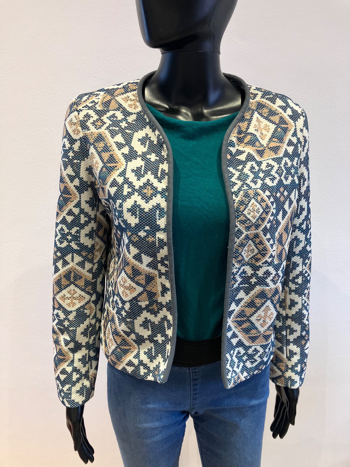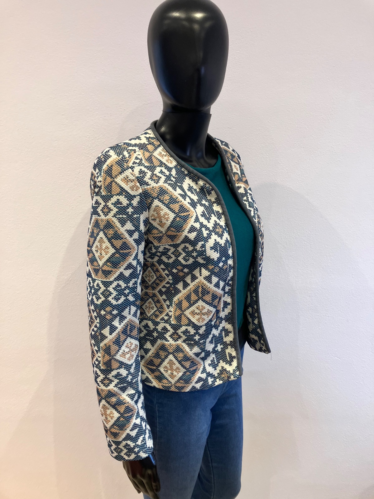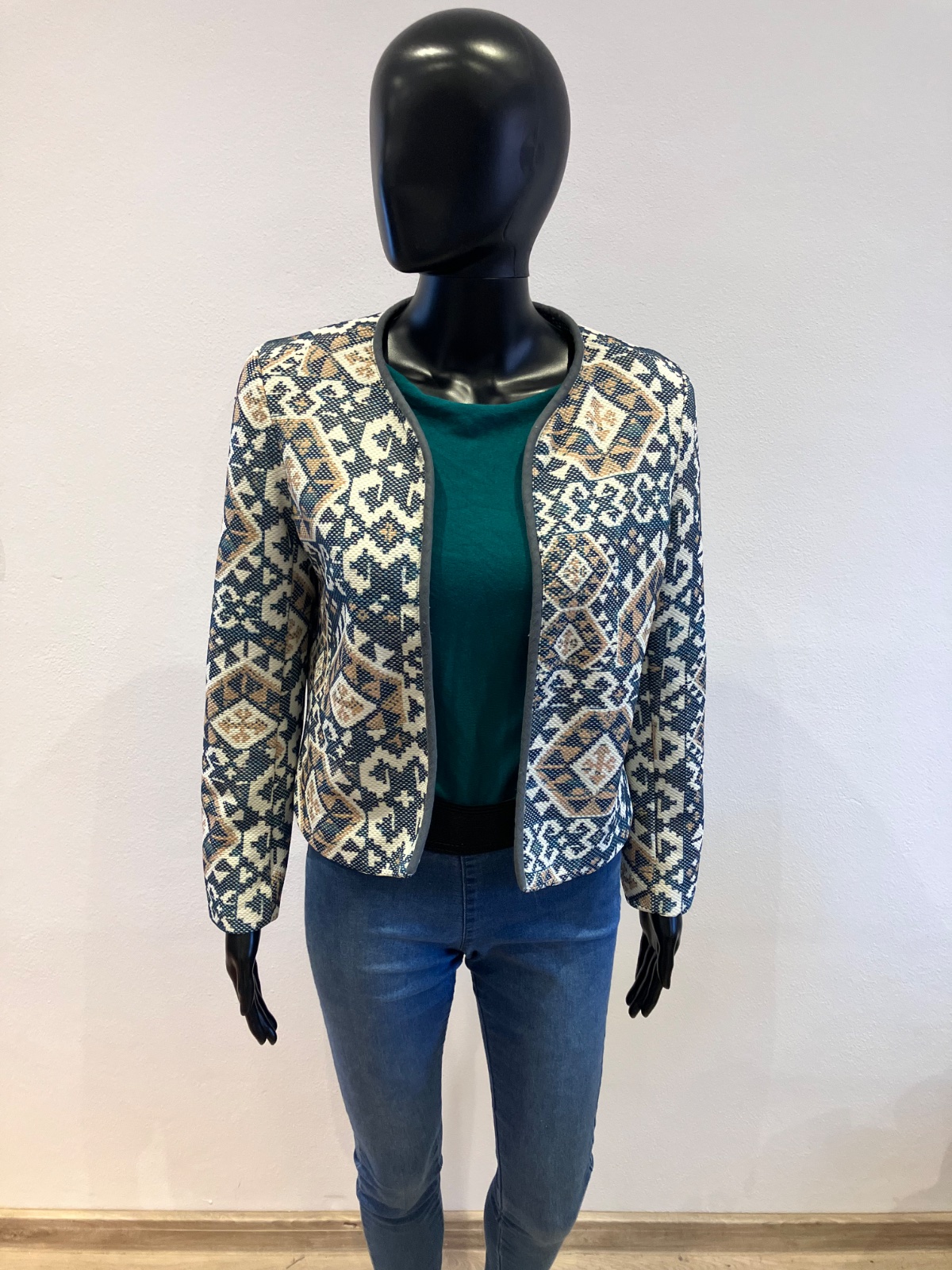 Dámske sako, bez zapínania, s výpchavkami, elastické, materiál 96%polyester 4%elastan. Farba:tmavomodro-tyrkysovo-hnedo-biela.