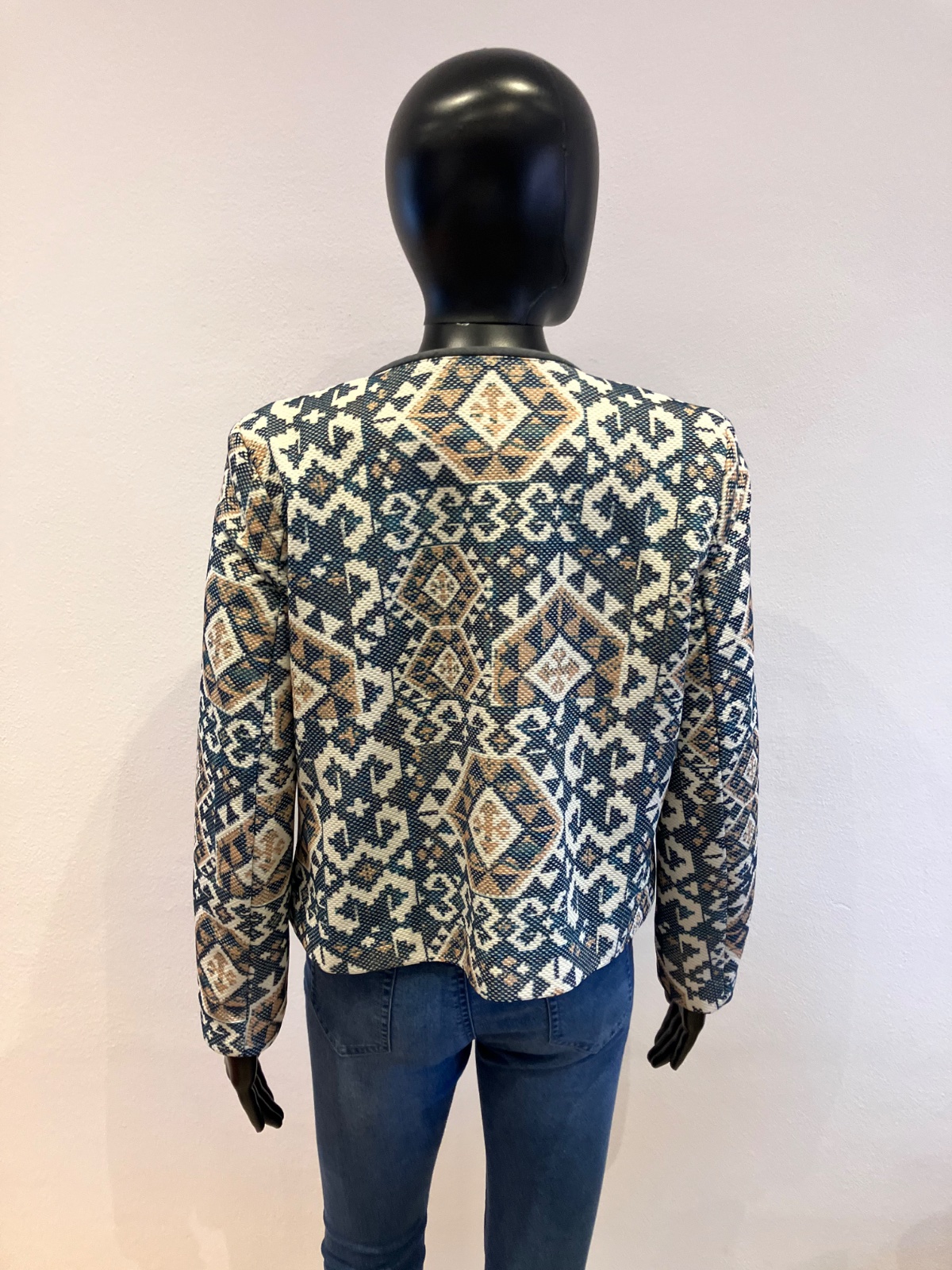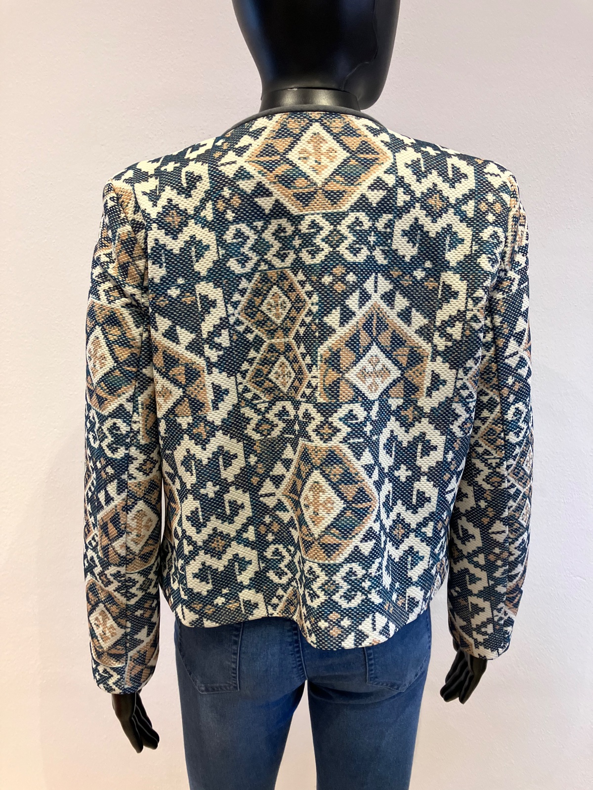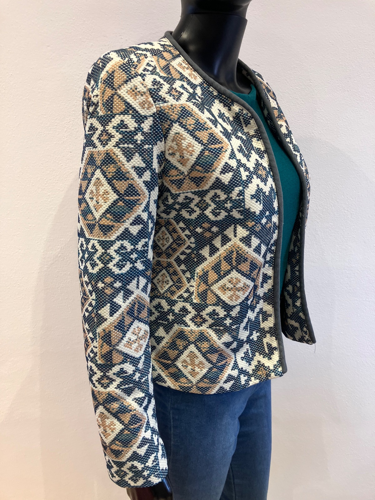 Dámske sako, bez zapínania, s výpchavkami, elastické, materiál 96%polyester 4%elastan. Farba:tmavomodro-tyrkysovo-hnedo-biela.