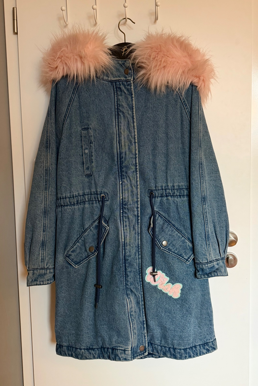 Custom denim parka s ruzovou kozusinou a 3D aplikaciami- Bershka.