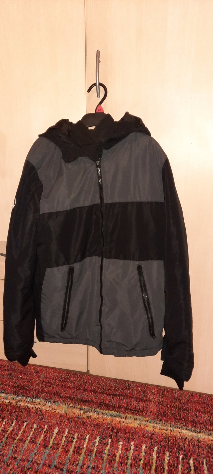 Čiernošedá bunda s patentmi s dierkami na prsty. Veľkosť 165 cca na 14 rokov. Super stav
