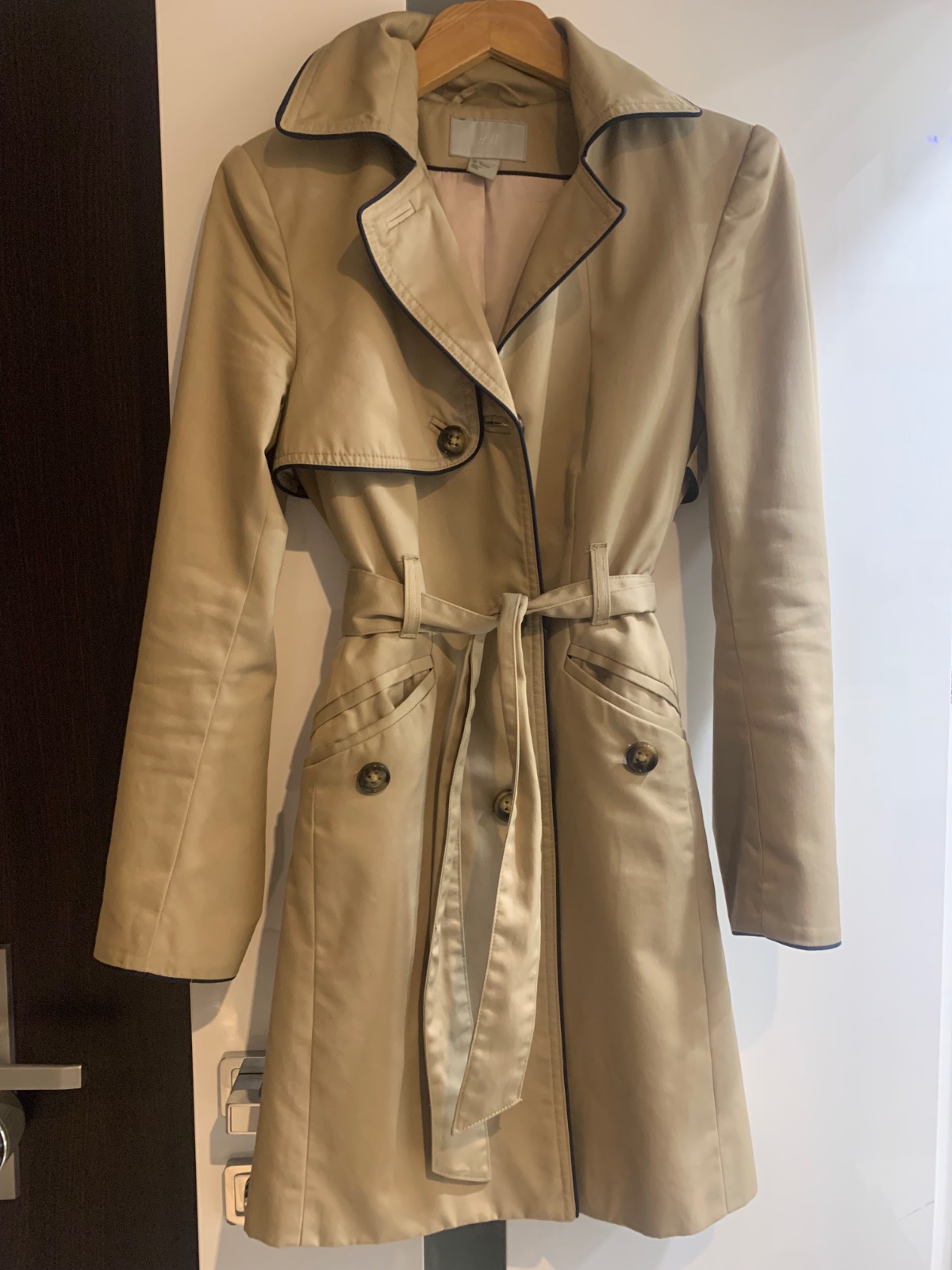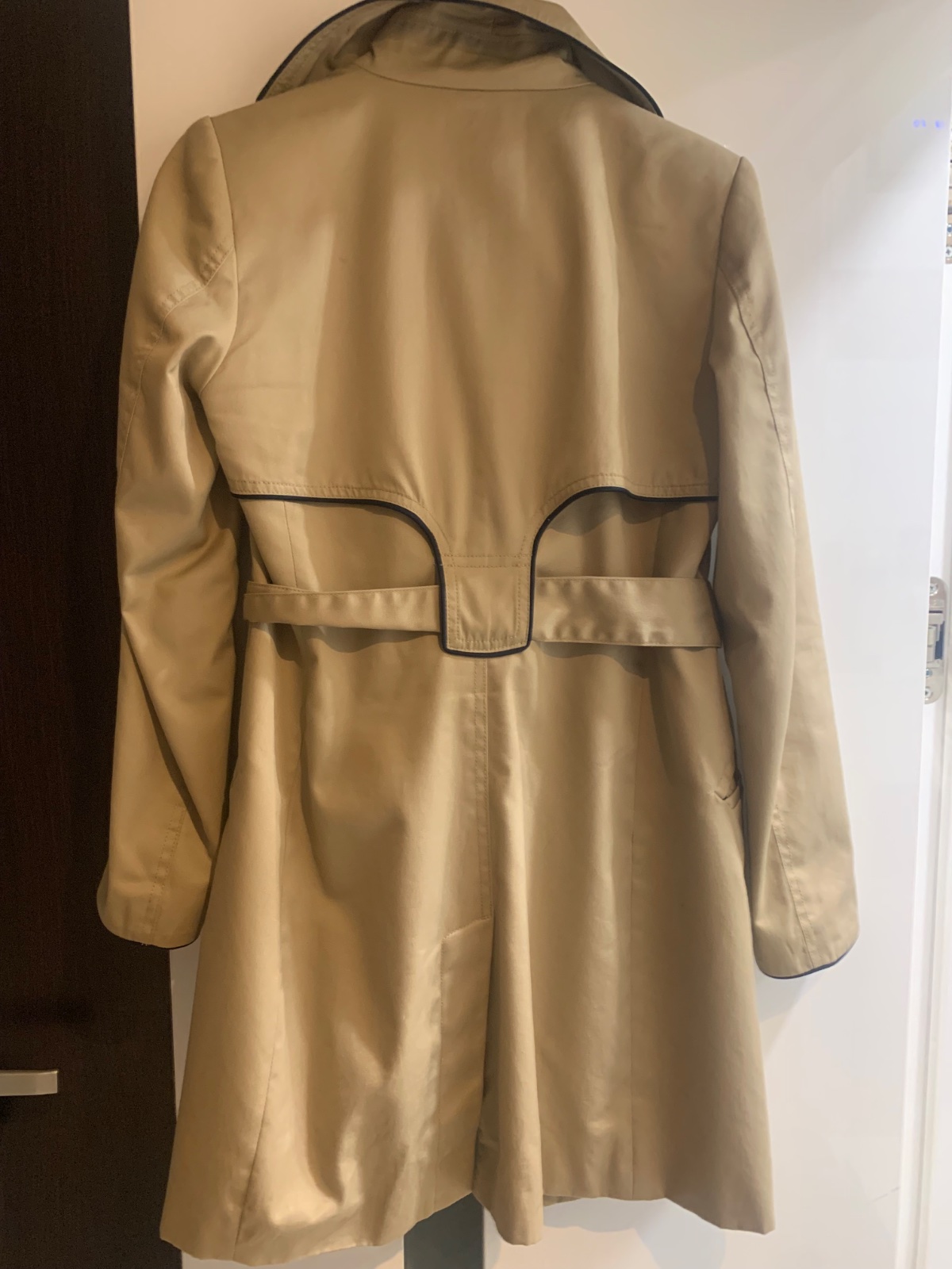 Dokonalá hnedá farba vhodná ku všetkému má klasické zapínanie dvojradové pekný strih bez fľakov bez známok nosenia mala som ho zopárkrát na seba