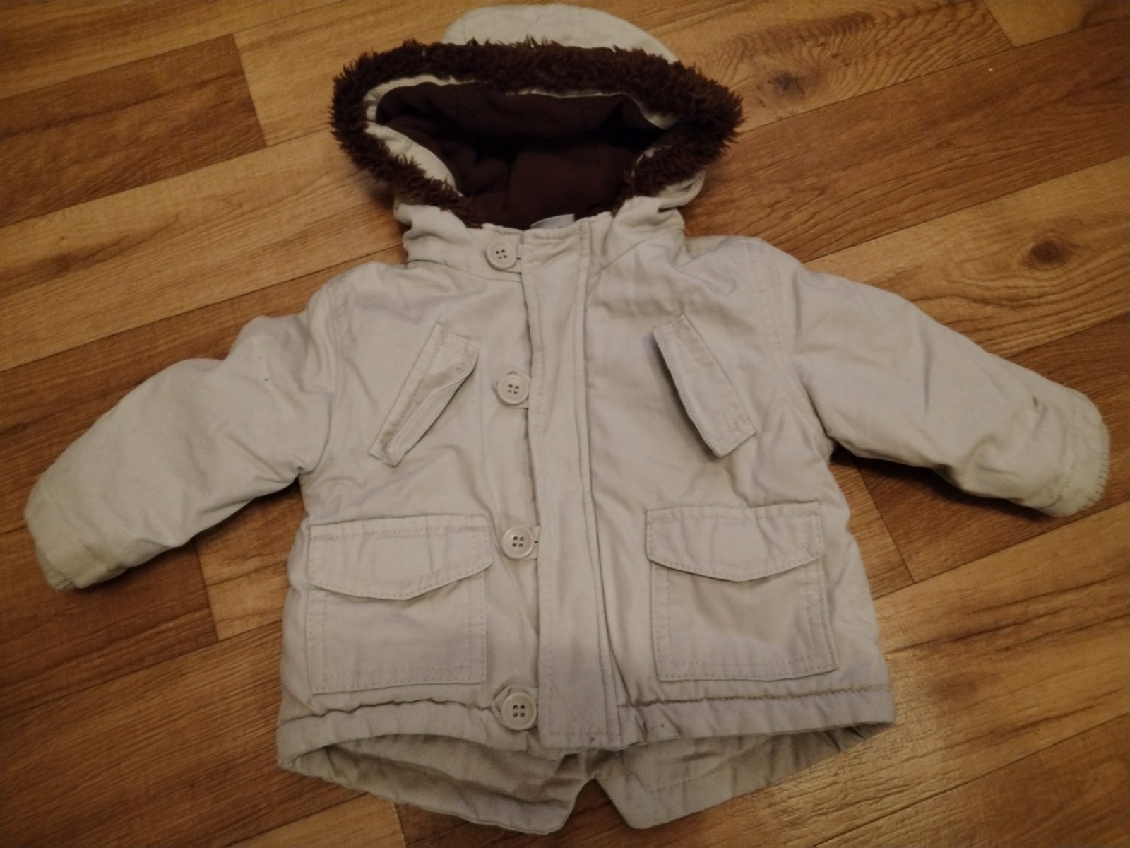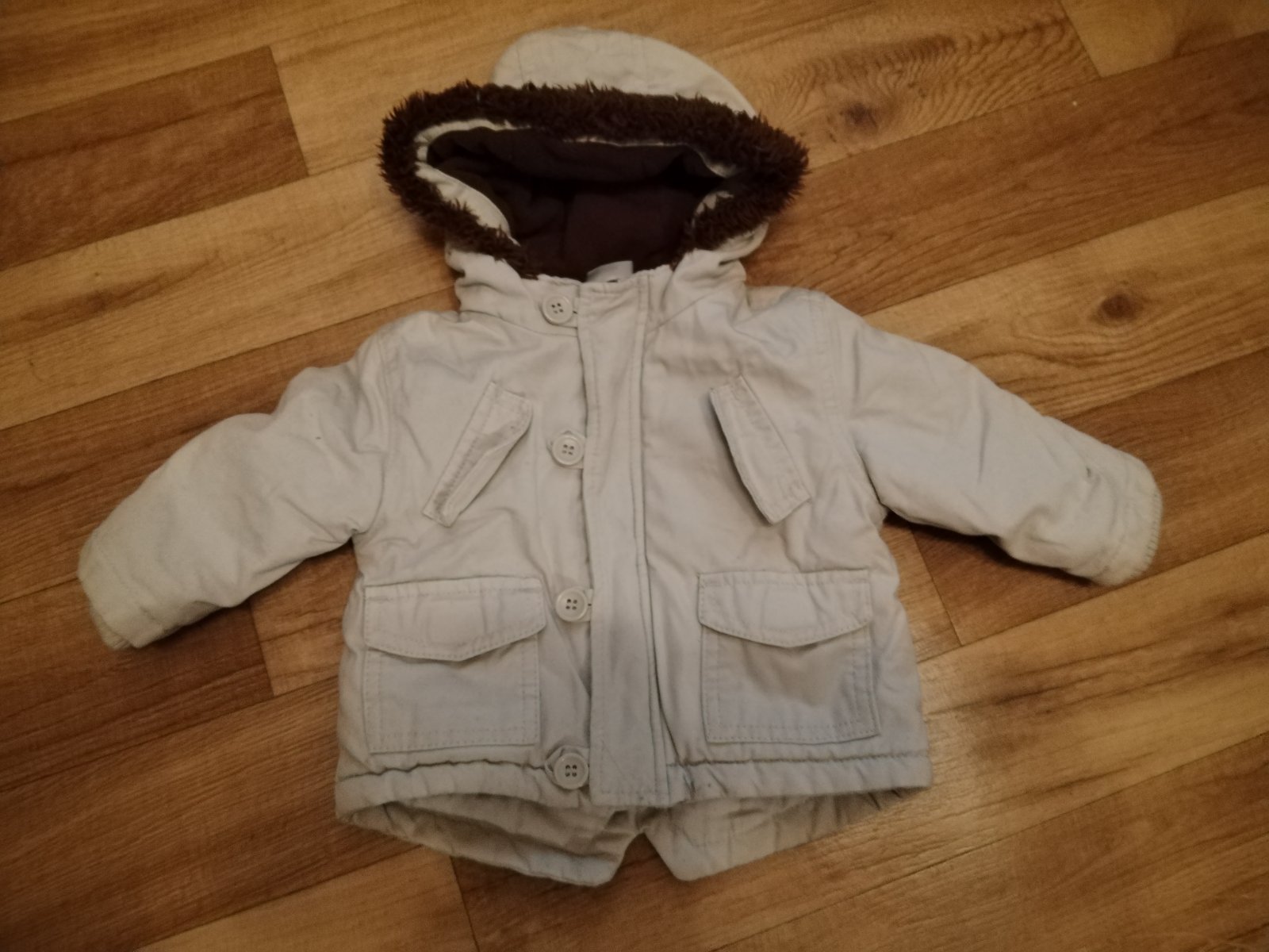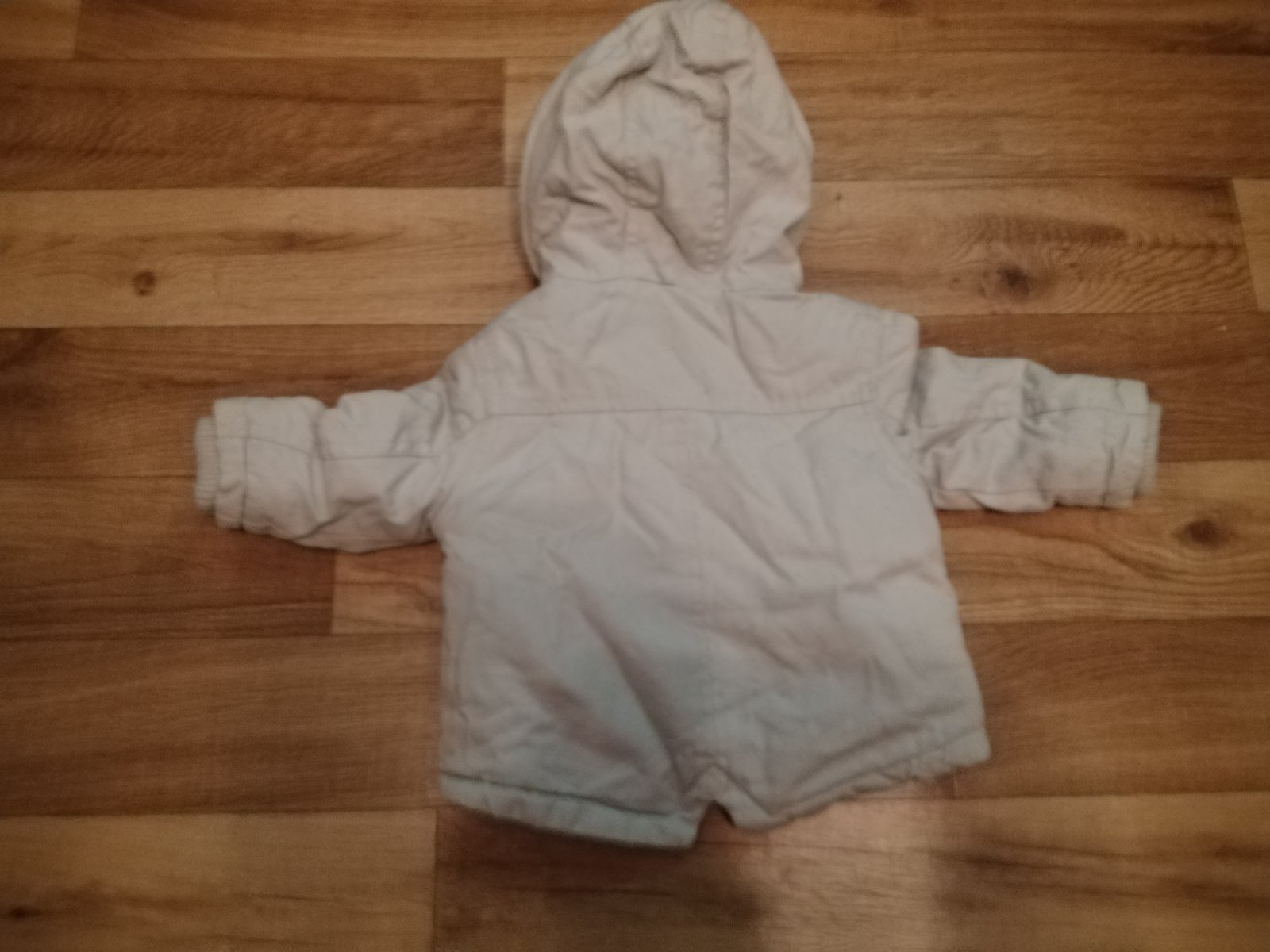 Predám bundičku veľkosť 3-6 mesiacov bez poškodenia pár krat oblečená. Farba je trochu tmavšia ako na fotke nedá sa dobre odfotit. Dĺžka rukáva od kapucky 30cm. Podšitá flesom.
