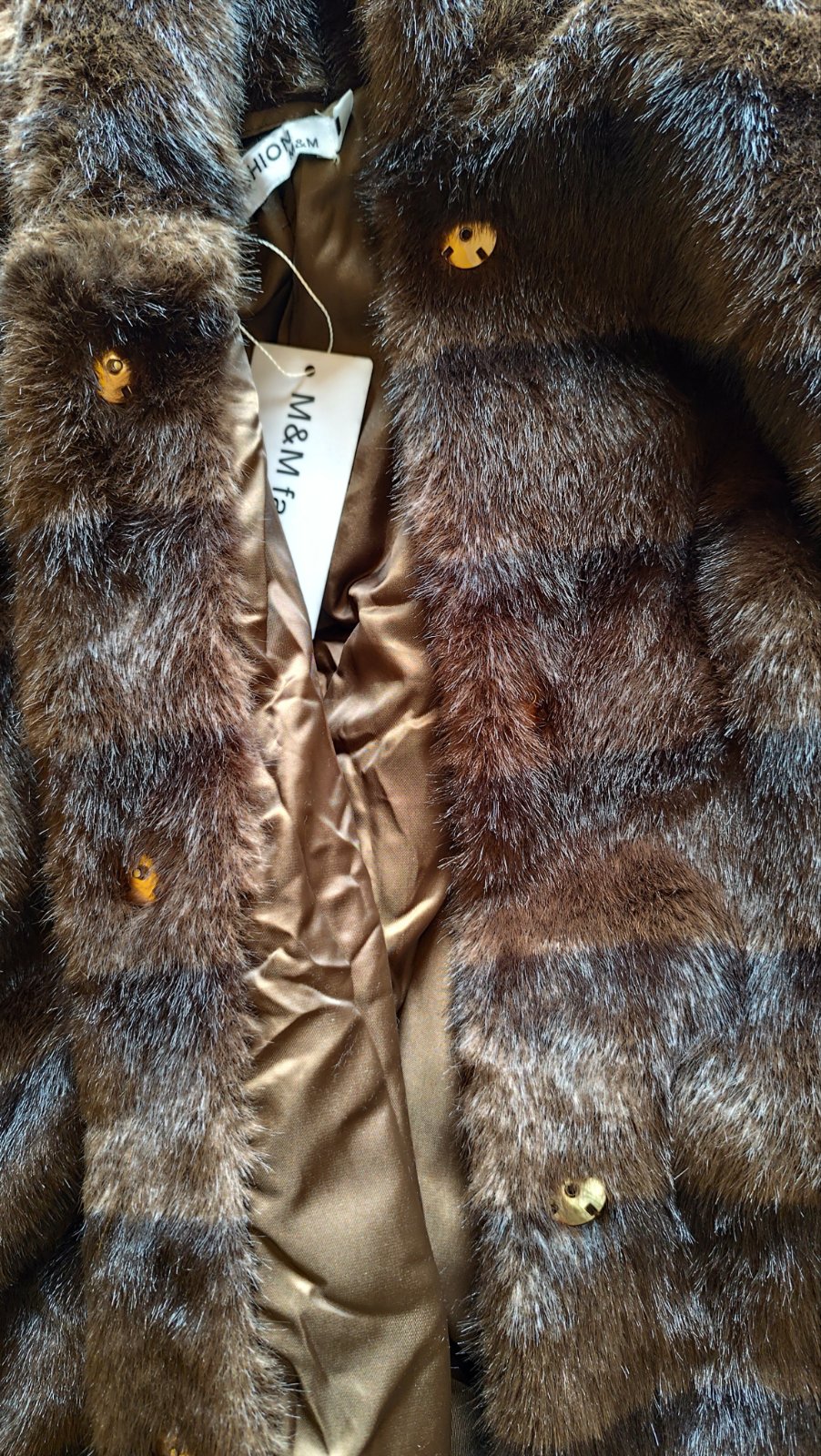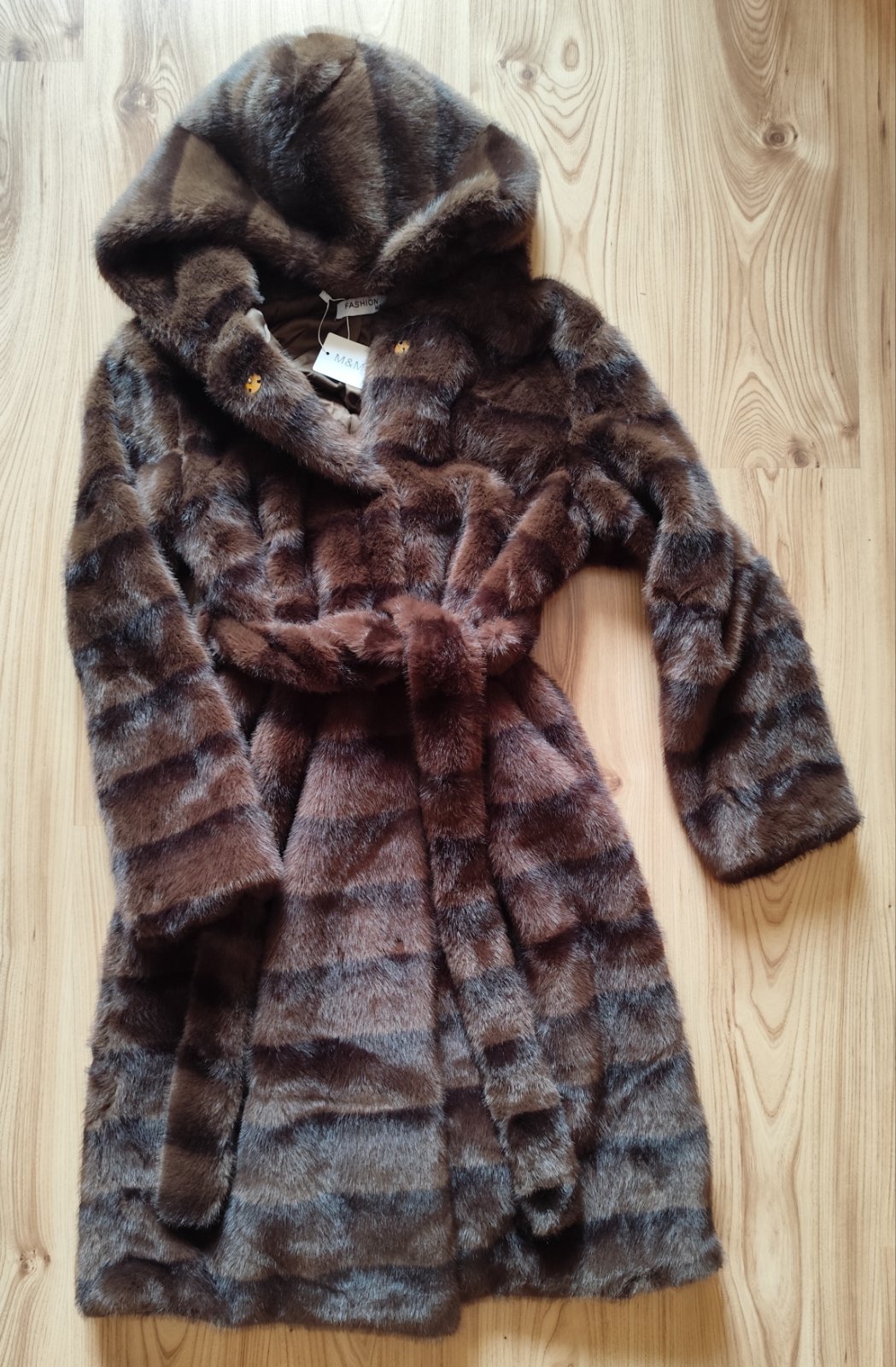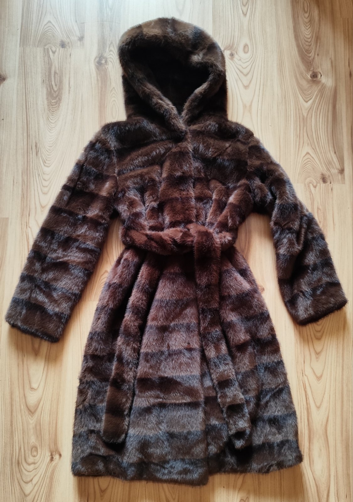 SkladomTeplý kožúšok z umelej kožušiny s kapucňou, zapínaním na cvoky a opaskom. Úplne nový s visačkou.