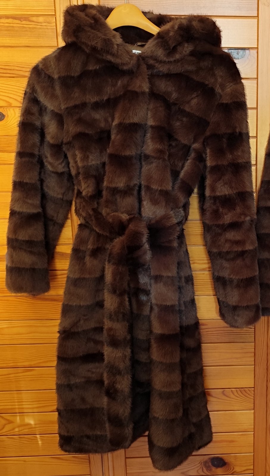 SkladomTeplý kožúšok z umelej kožušiny s kapucňou, zapínaním na cvoky a opaskom.