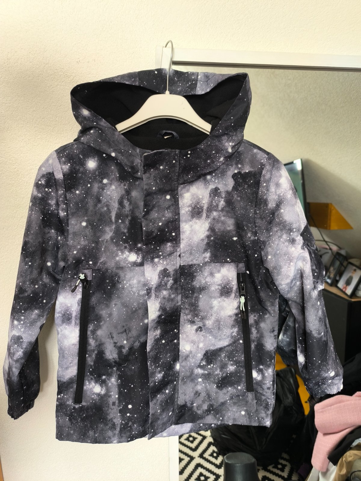 V peknom nosenom stave. Velkost 7-8rokov. Sedi na 128. Syn potrebuje 134 a uz mu je mala. Pas na zapisanie. Nepodfukne. Kapucna na pevno. Mnozstvo vrecak. Stale pekna. S hrubou mikinou vhodna i na...