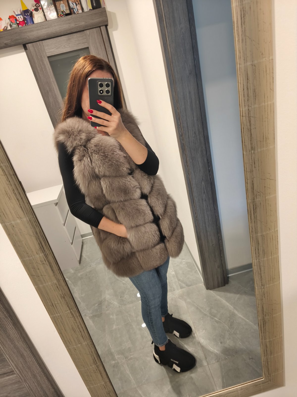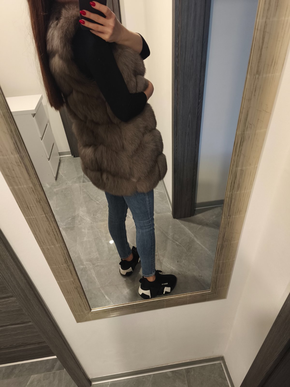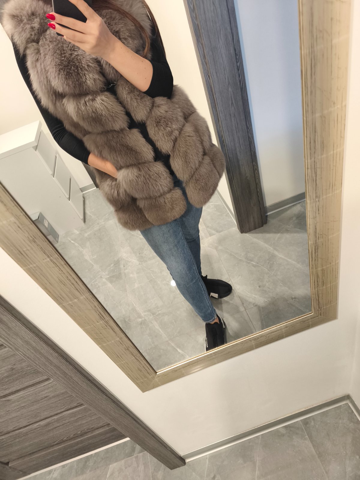 Krasna kozusinova vesta z lisky, zapina sa na haciky bohata velmi tepla oblecena len 1x na prilezitost v top stave ako nova, inak len skaldovana. Farba velmi pekna sivo-hneda. Velkost uvedena ina ale najlepsie sedi na XS/S. Povodna cena vysoka kupovana v Polsku.