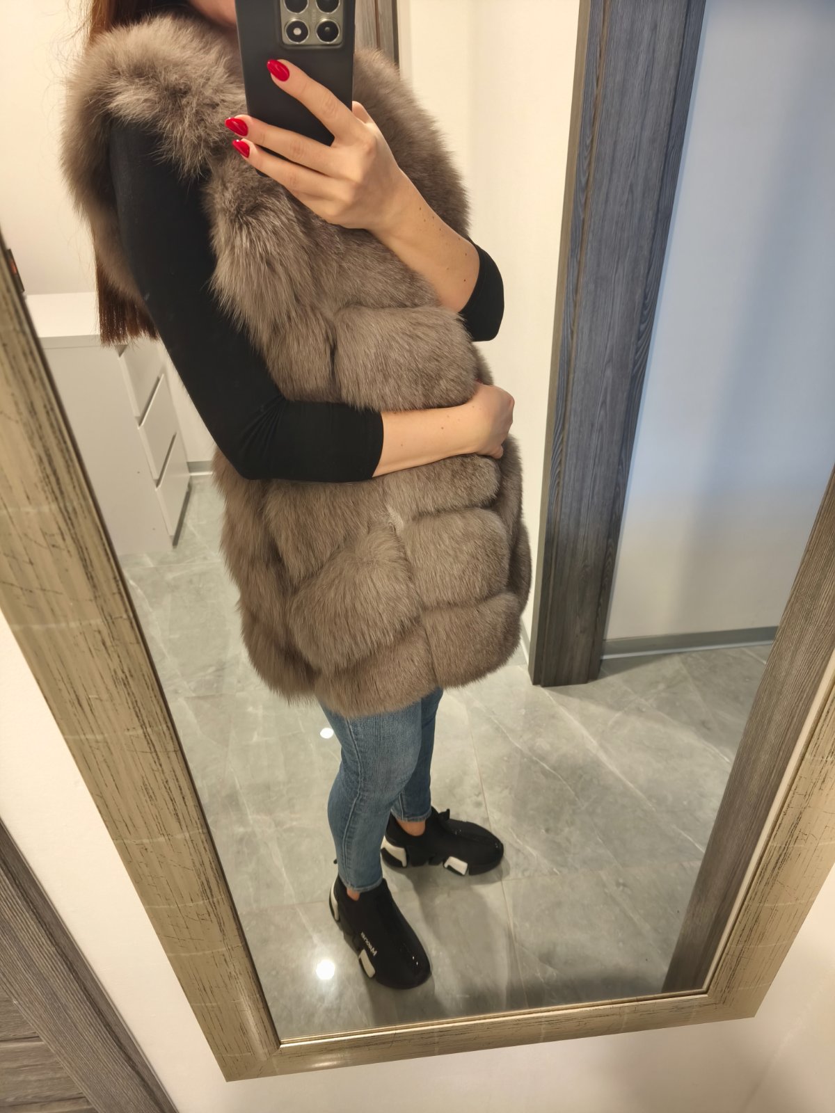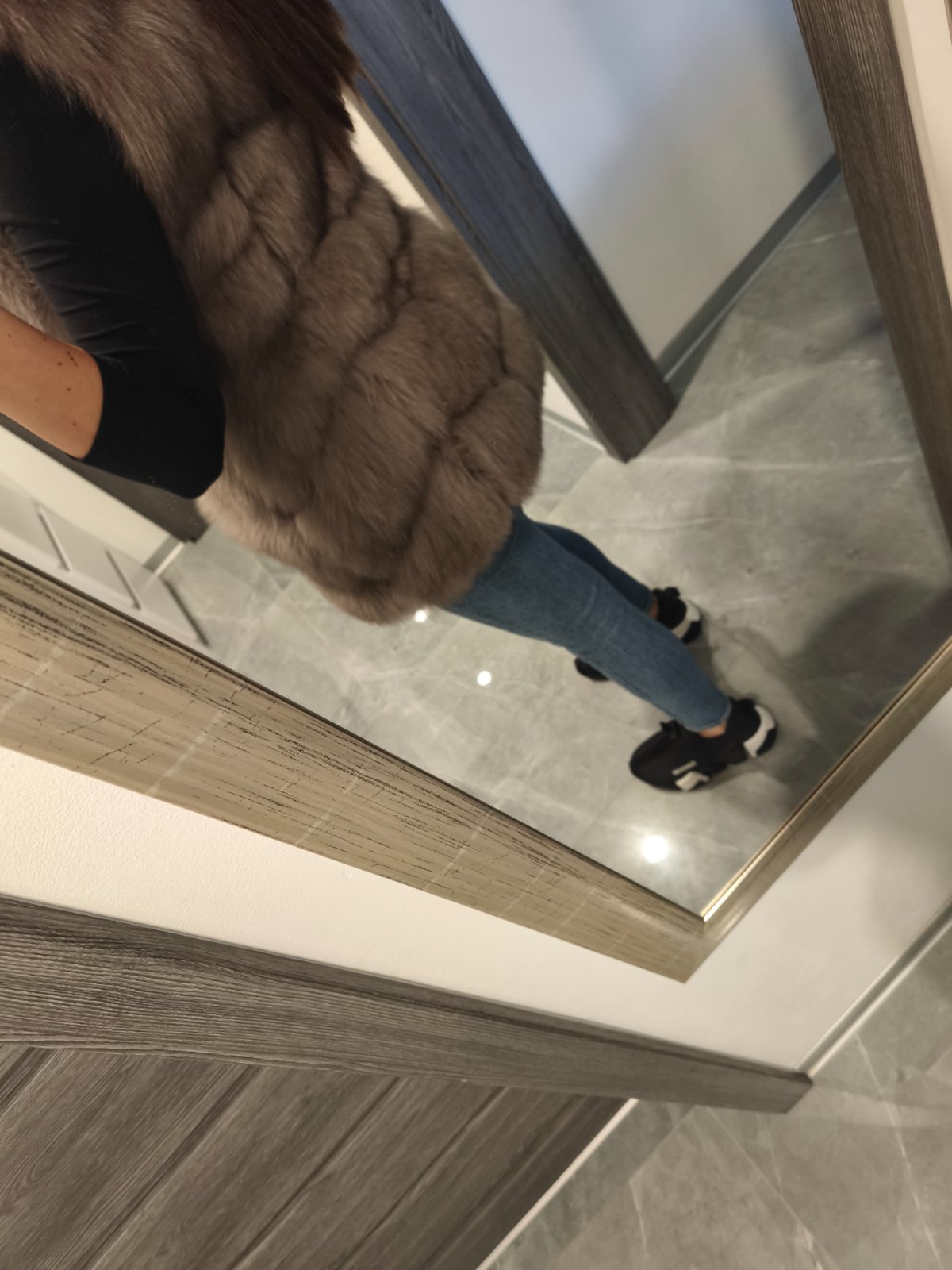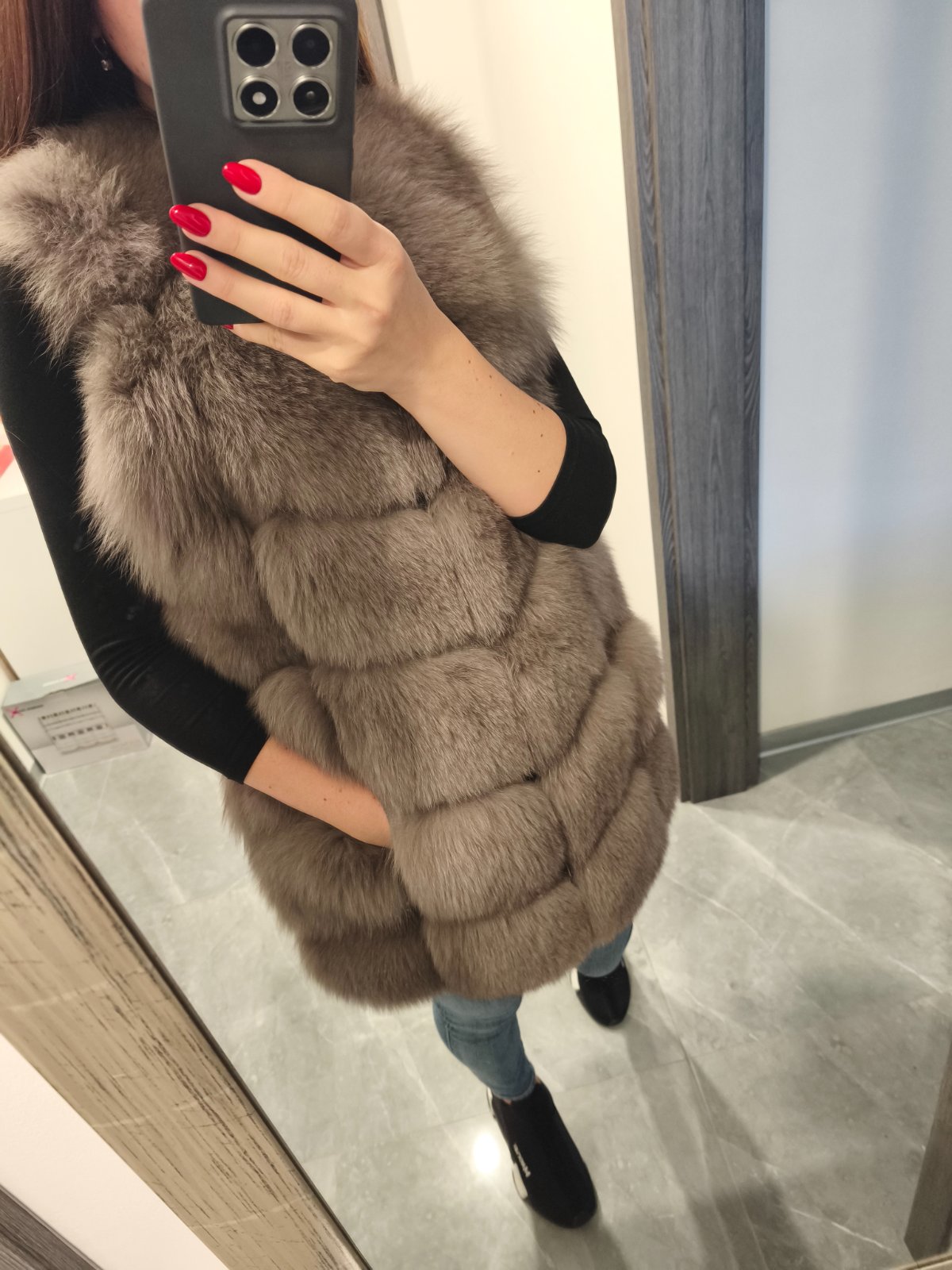 Krasna kozusinova vesta z lisky, zapina sa na haciky bohata velmi tepla oblecena len 1x na prilezitost v top stave ako nova, inak len skaldovana. Farba velmi pekna sivo-hneda. Velkost uvedena ina ale najlepsie sedi na XS/S. Povodna cena vysoka kupovana v Polsku.