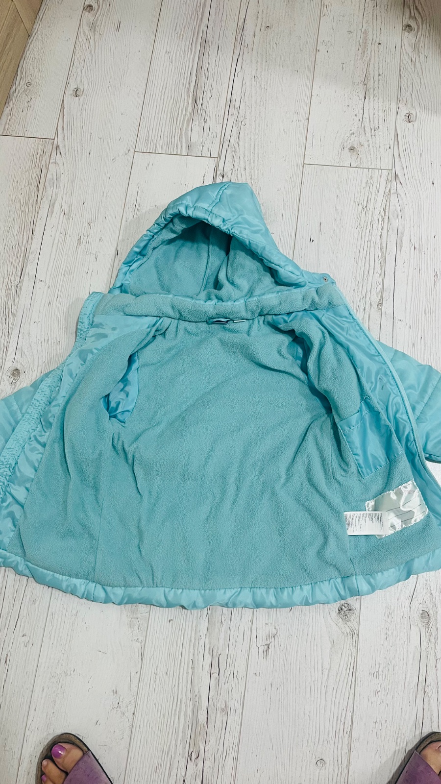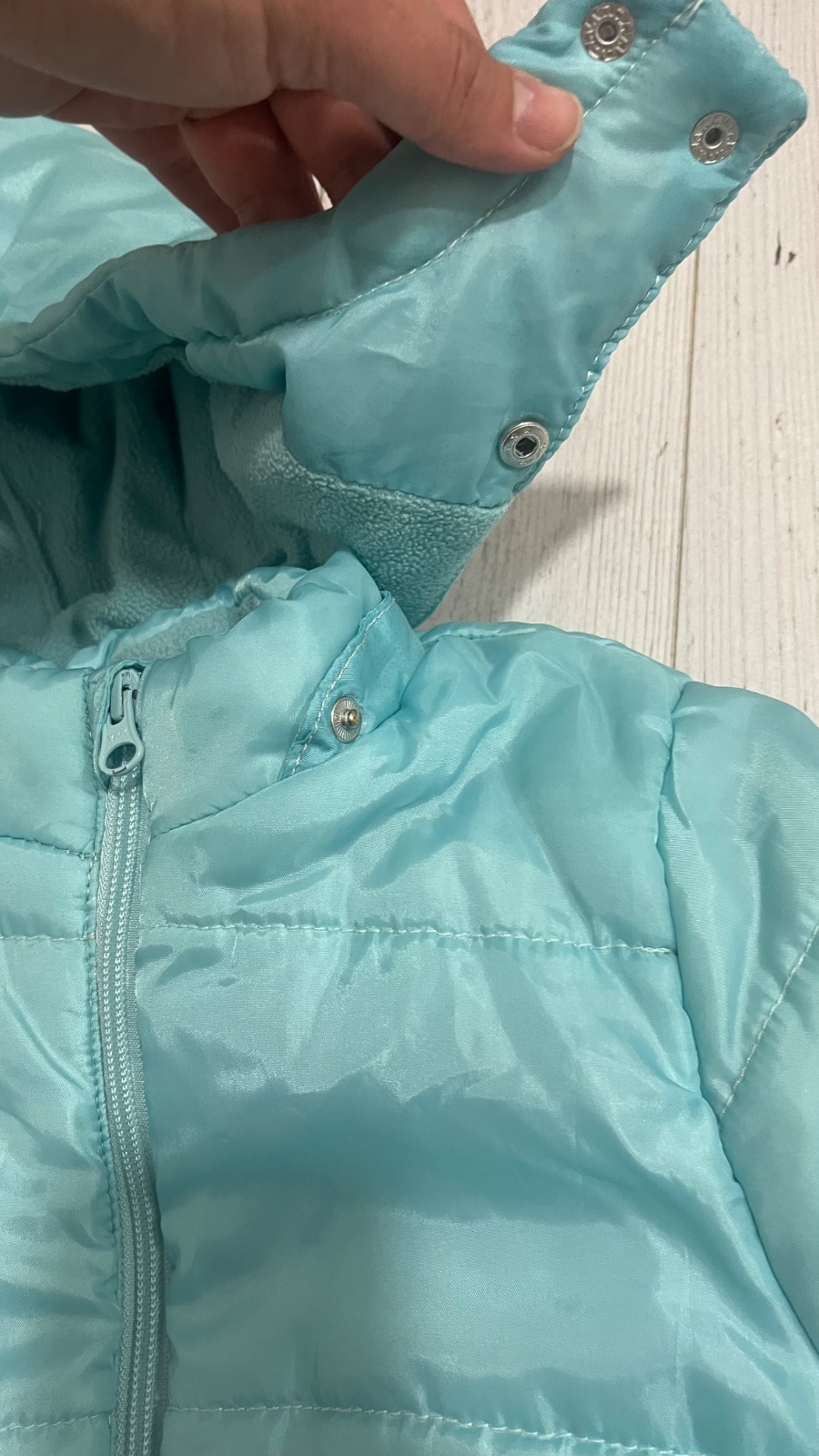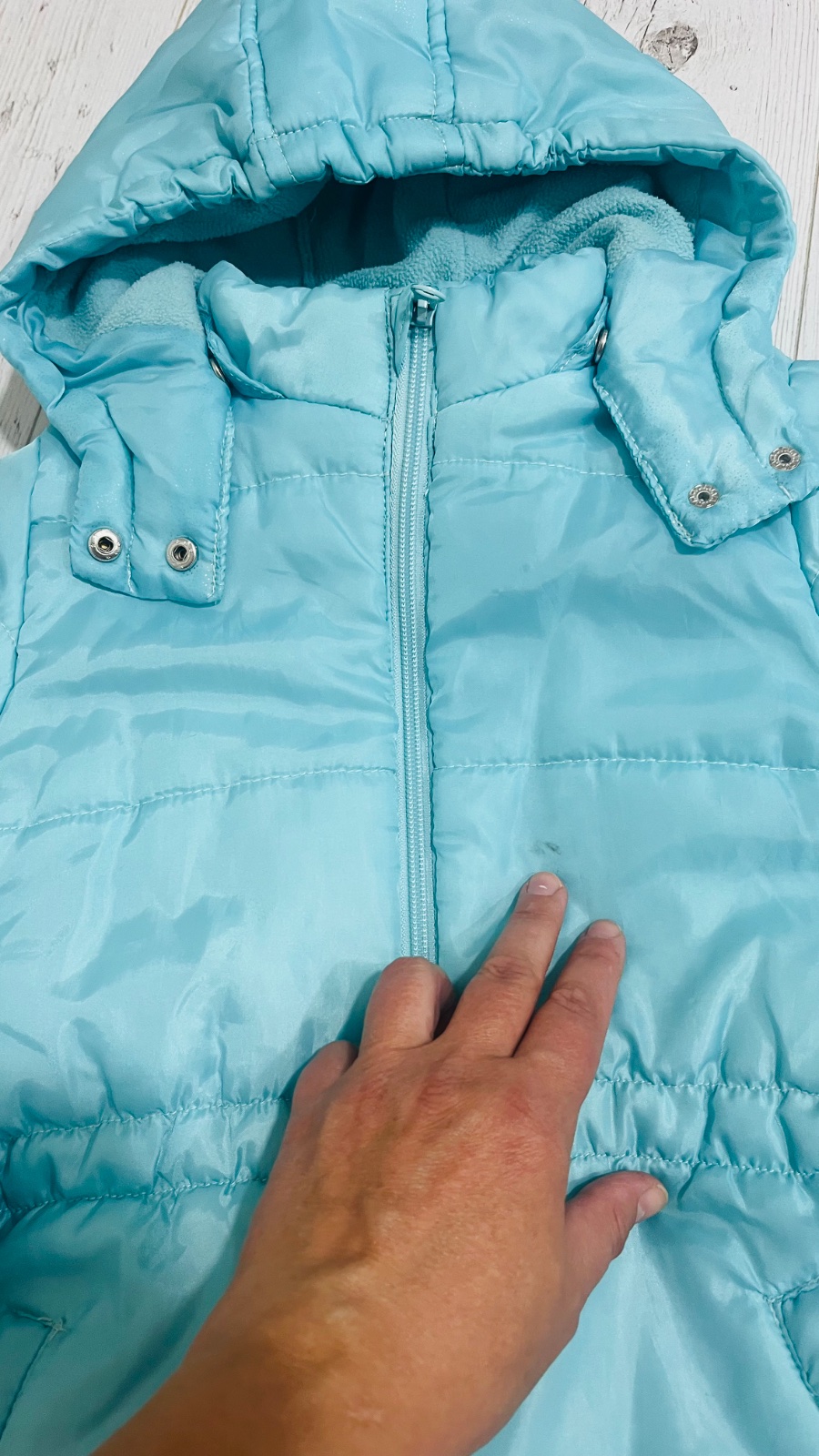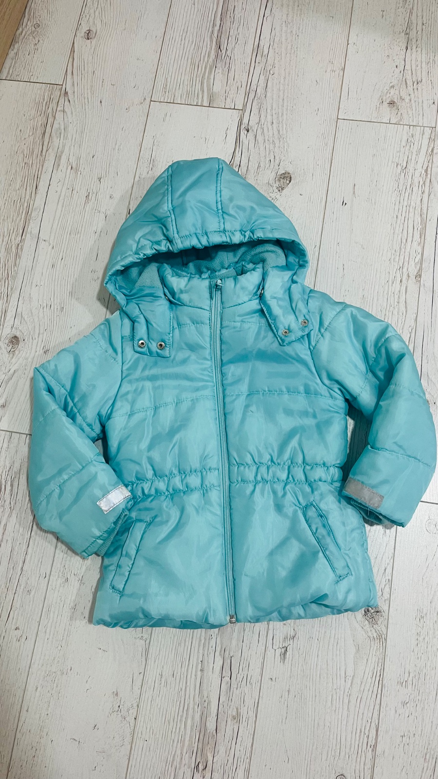 Teplá vetrovka, nosenie už vidno, hlavne na rukávoch a pri vreckách oslabený materiál a prasklinky (stav viď foto).
