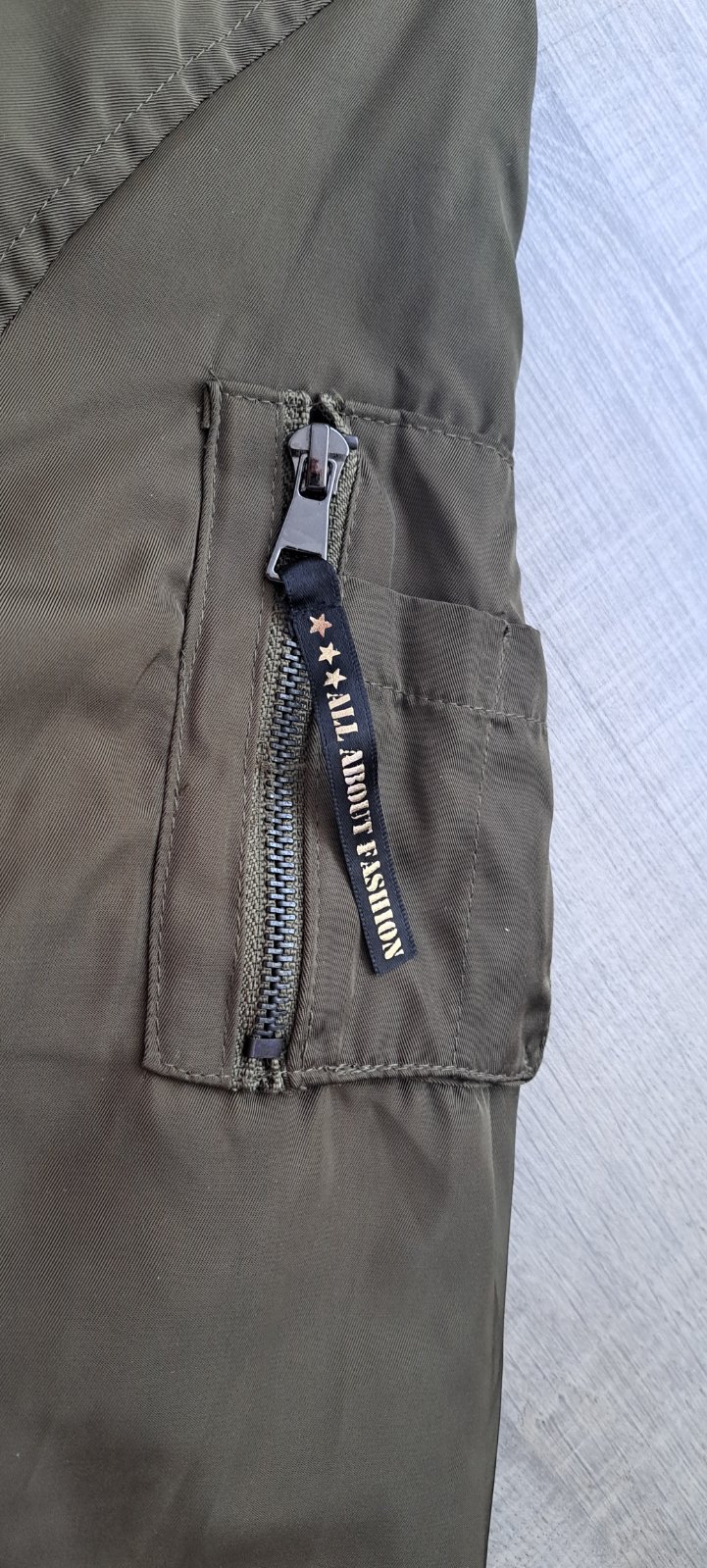 🔹 Jemné detaily: vrecko na rukáve so zipsom a štýlovým ťaháčikom "ALL ABOUT FASHION"