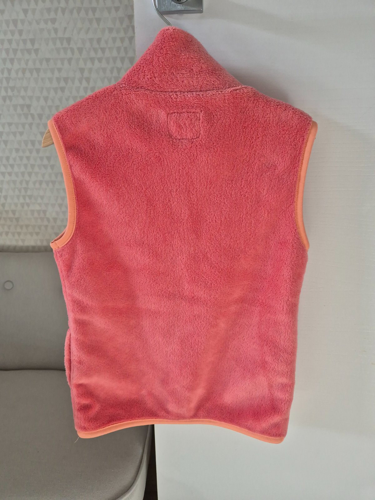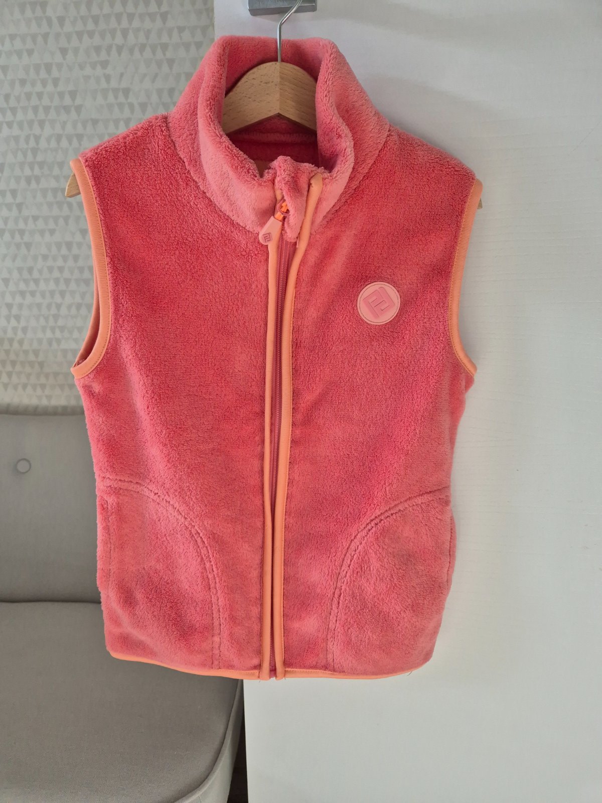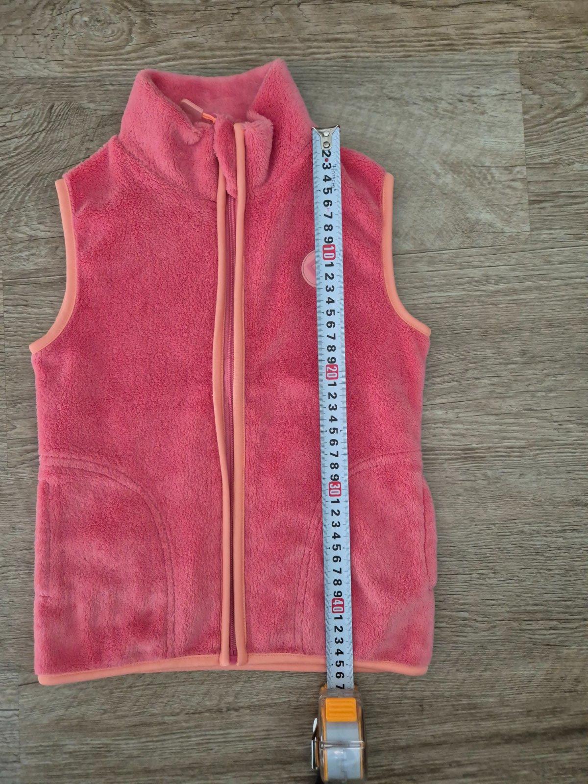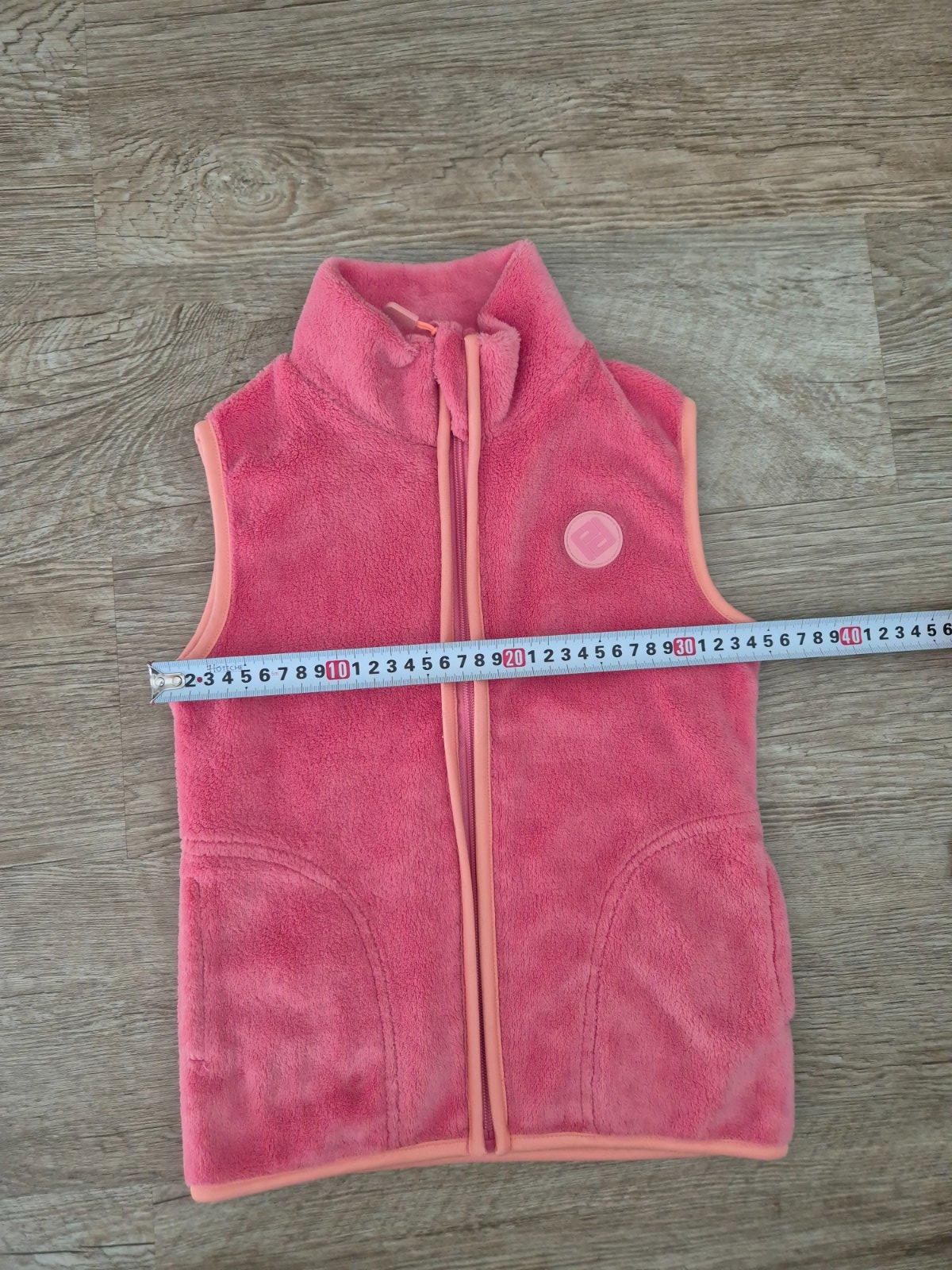 Nosena ruzova vesta, vel.128 (7-8r). Dlzka 50cm, sirka 37cm. Trocha osuchany zips a milimeter latky pod zipsom, vid foto. Inak dobry noseny stav. Vaha cca 250g