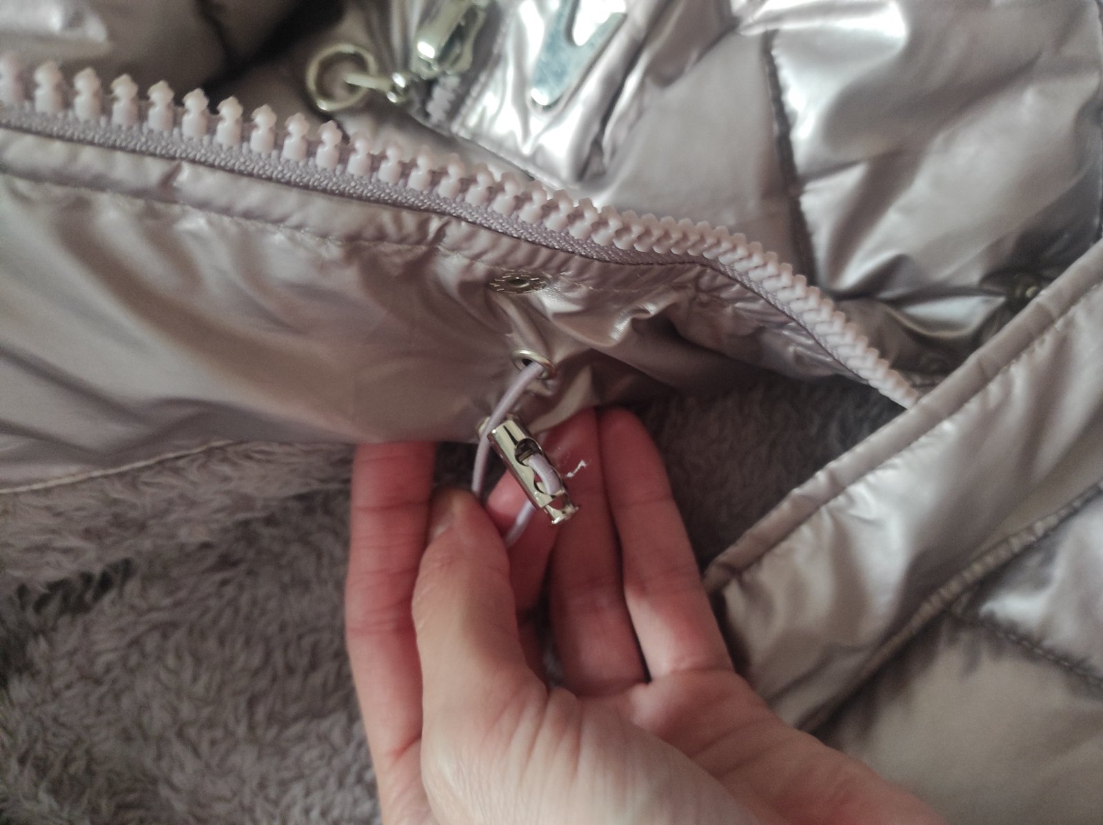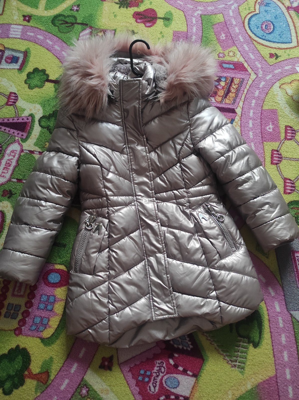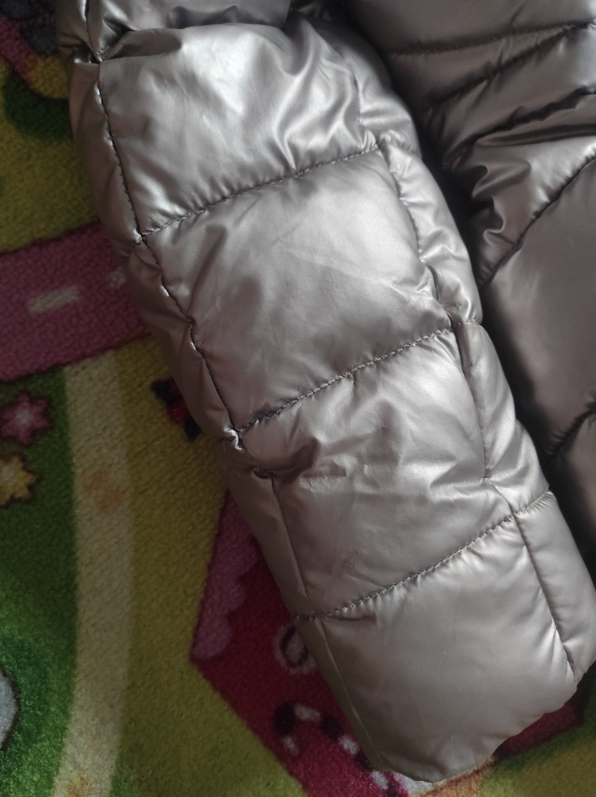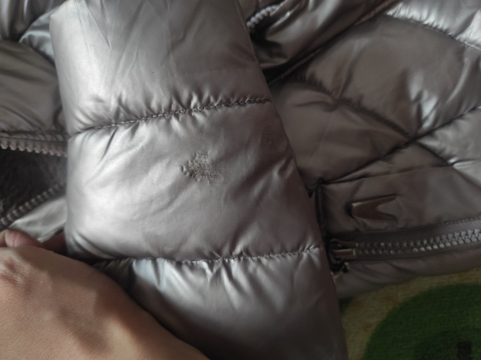 Nosené, dobrý stav, jedine poškodenie viď posledné foto, bunda je veľmi teplá. Cena 9€