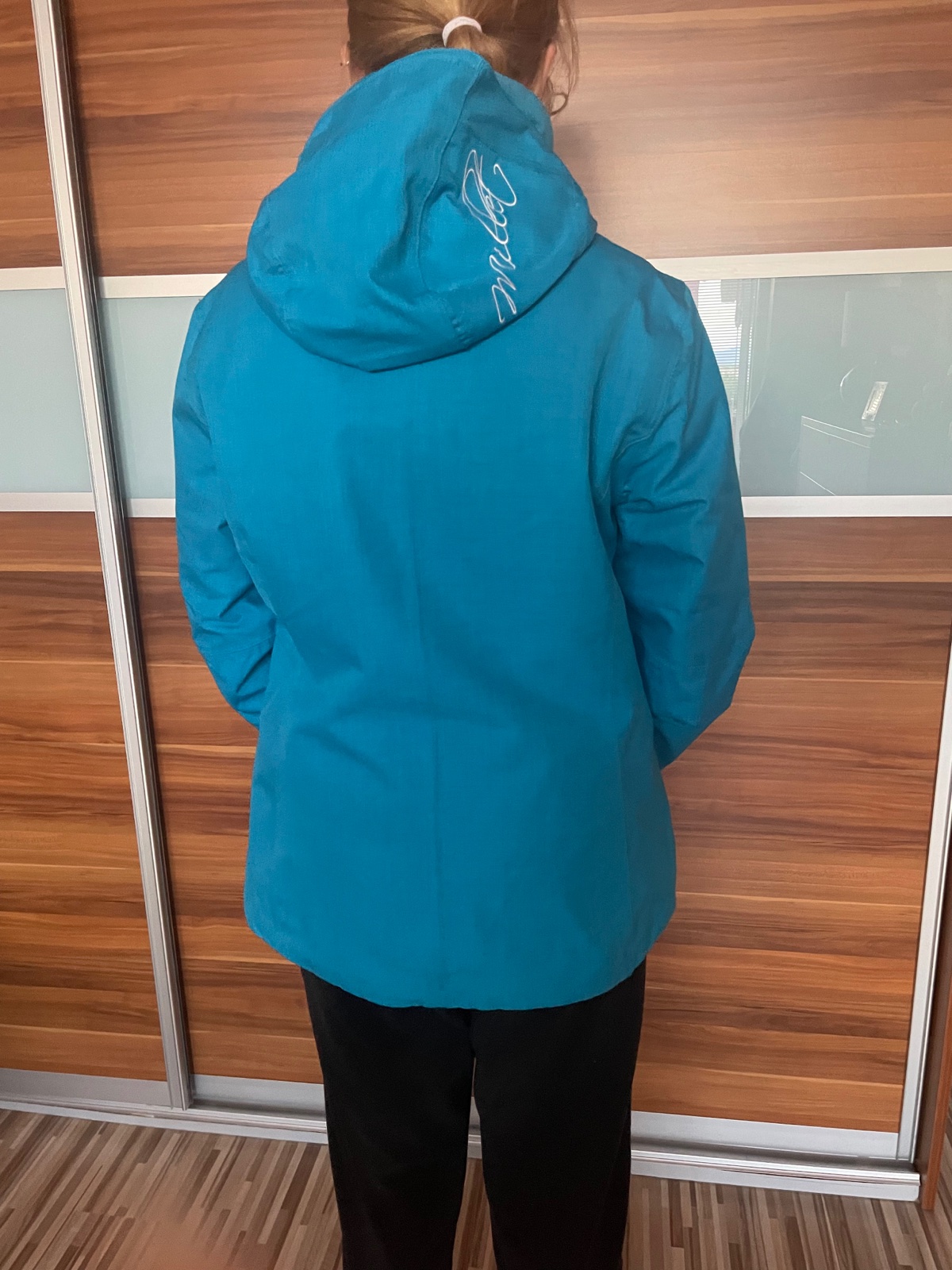 bunda, nosená, tyrkysová ako na poslednej foto, detailne vypracovaná, veľmi príjemná mäkká, teplá, nepreprší, vrchný material je pogumovaný, vo vnútri kožušinka.Kožušinka na kapucni nie je odnimate...
