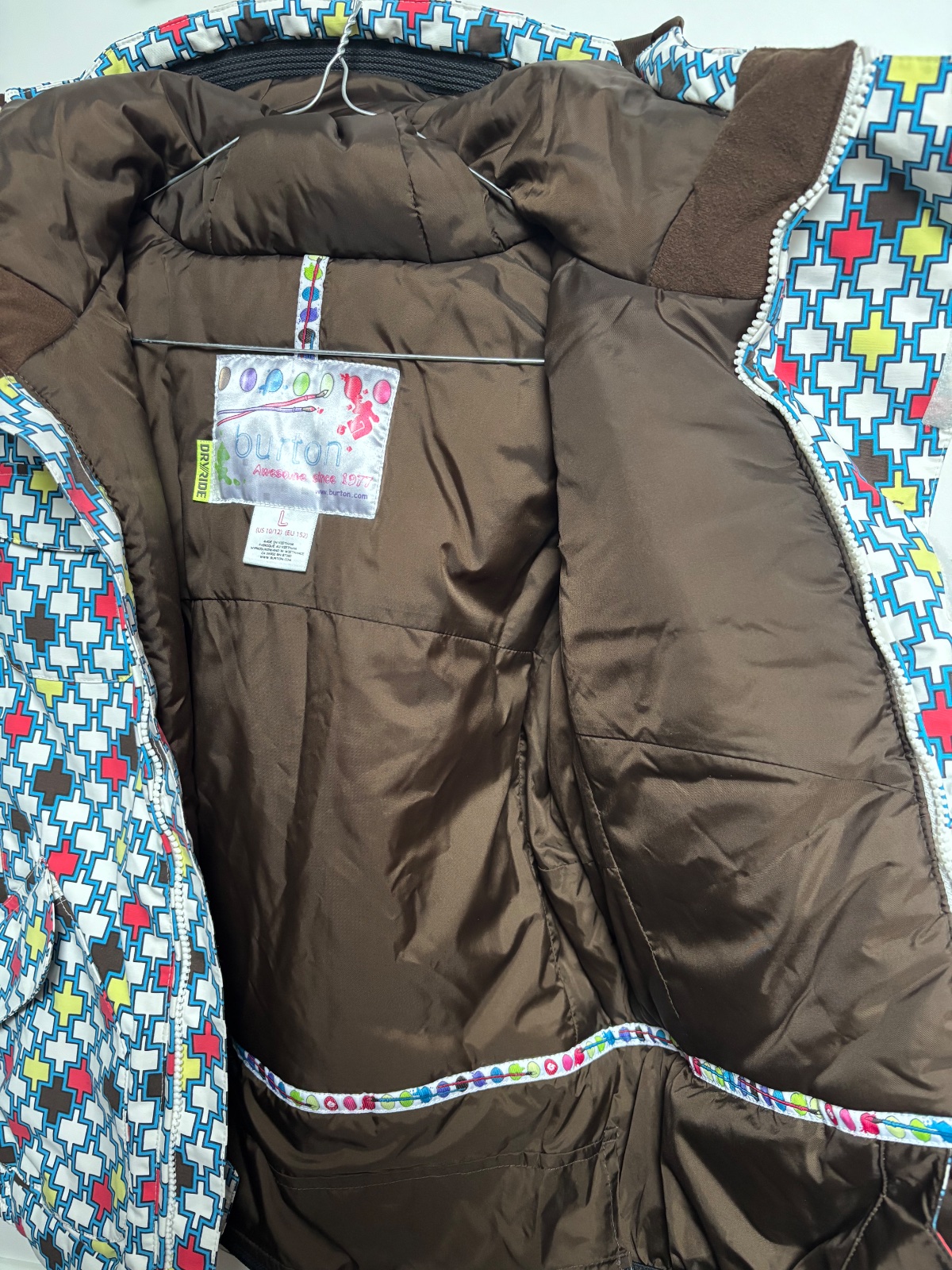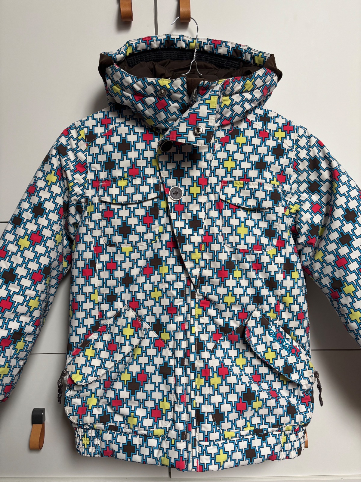 Málo nosená zateplená bunda s kapucňou, má dve bočné vrecká a logo Burton na chrbte. Zapína sa na zips, ale má aj gombíky. V páse je bunda zúžená. Rukávy sa zapínajú na gombíky.