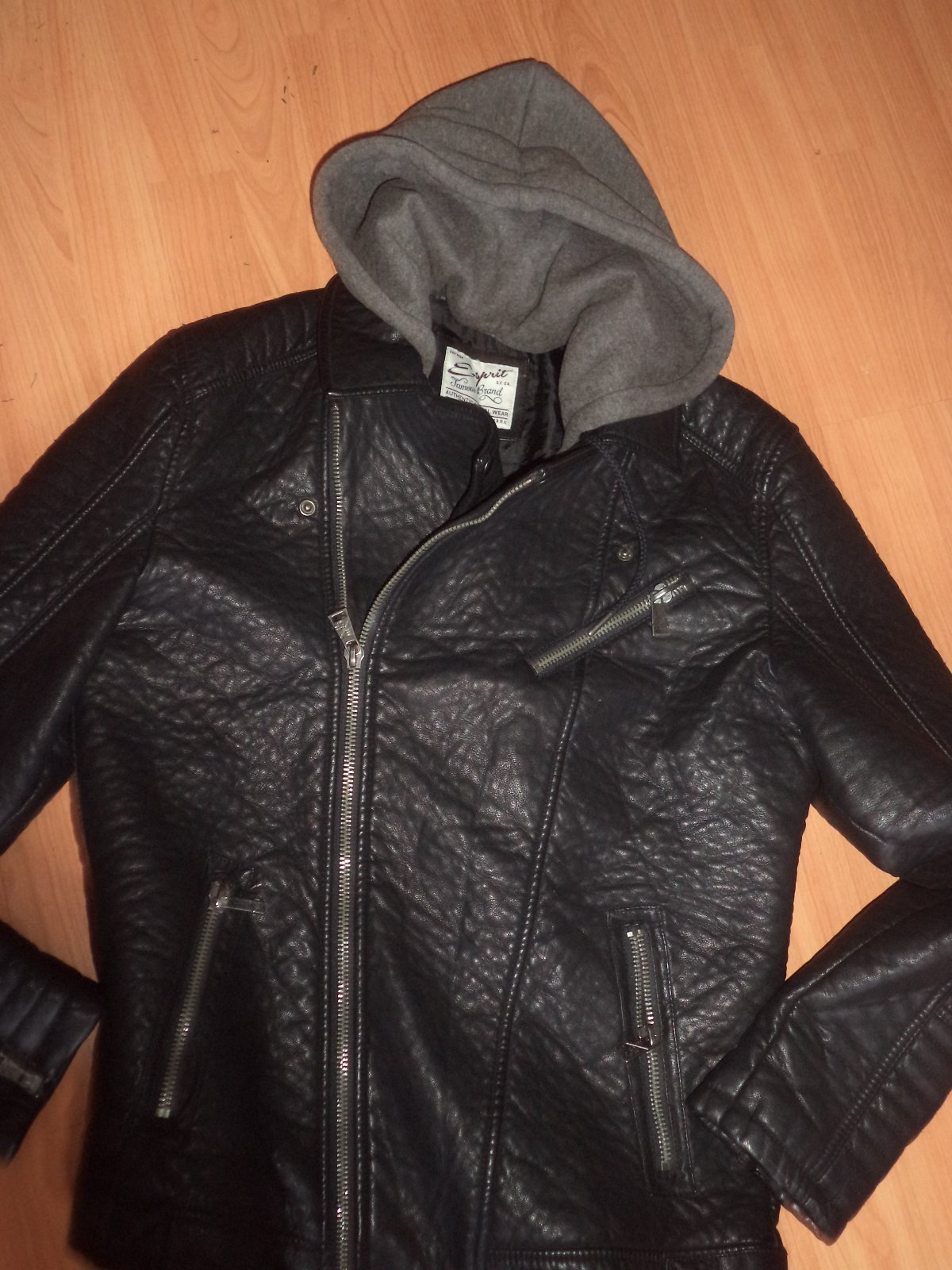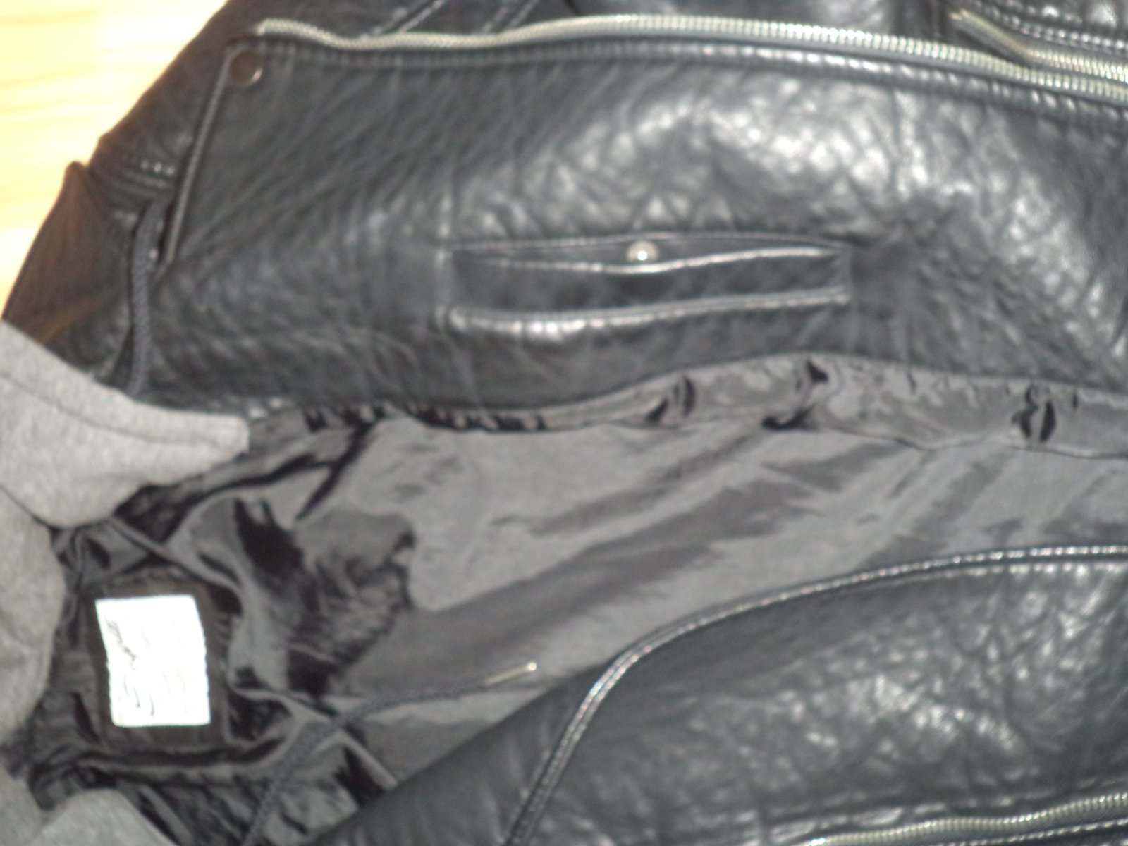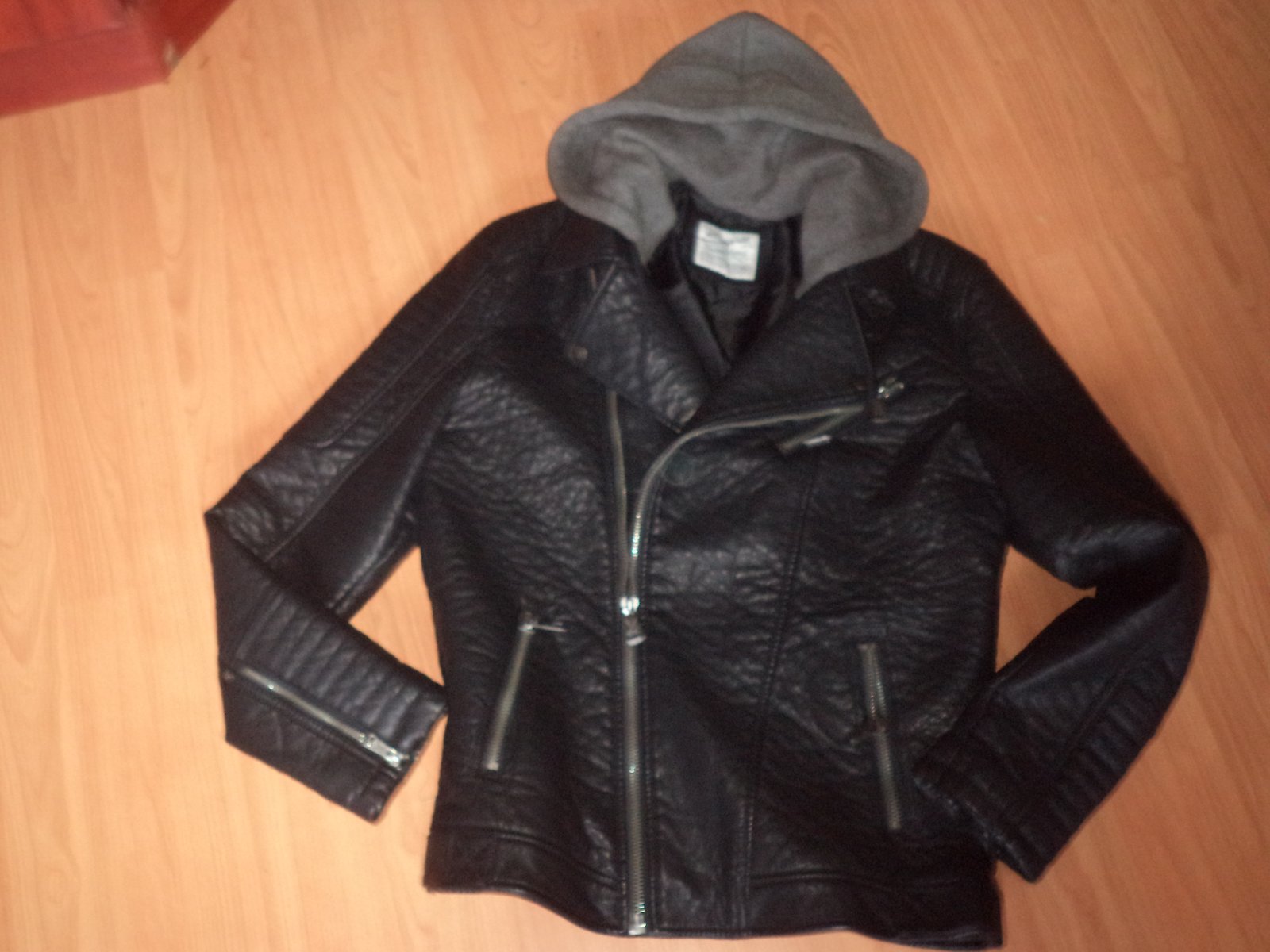 Pánska čierna kožená prechodná bunda so sivou kapucňou.Neviem na 100% či je kožená ale je hrubá vyzerá ako kožená. Kapucka je na gombíky odoberateľná.Pozri fotky. Rozmery: obvod hrude 53cmx2, dľžka 69cm, dľžka rukáva od pleca 66cm, obvod konca bundy 54cmx2, v páse je zúžená 50cmx2. Dá sa stiahnúť o jeden gombík z každej strany. V cene nie je poštovné.